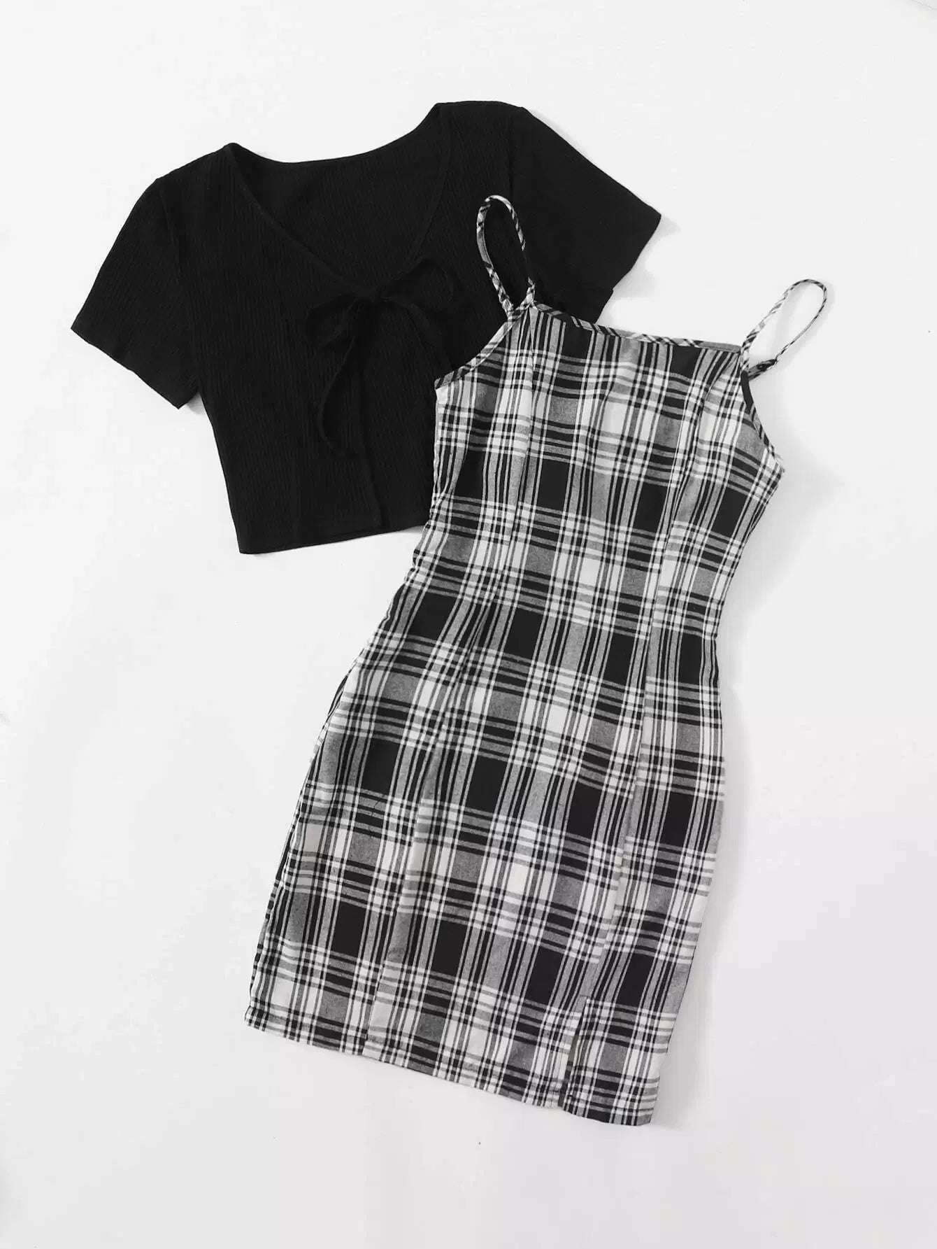 بلوزة سادة مضلعة مضلعة برباط أمامية مضلعة وفستان منقوش