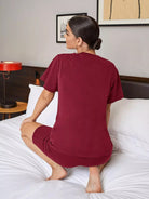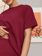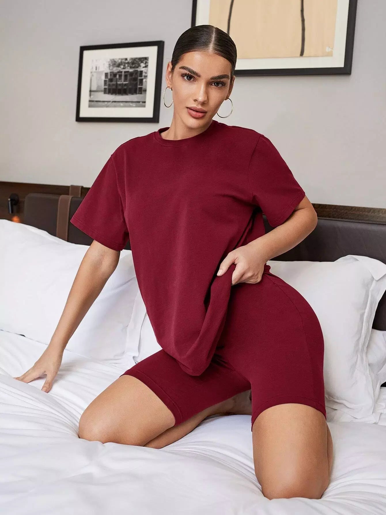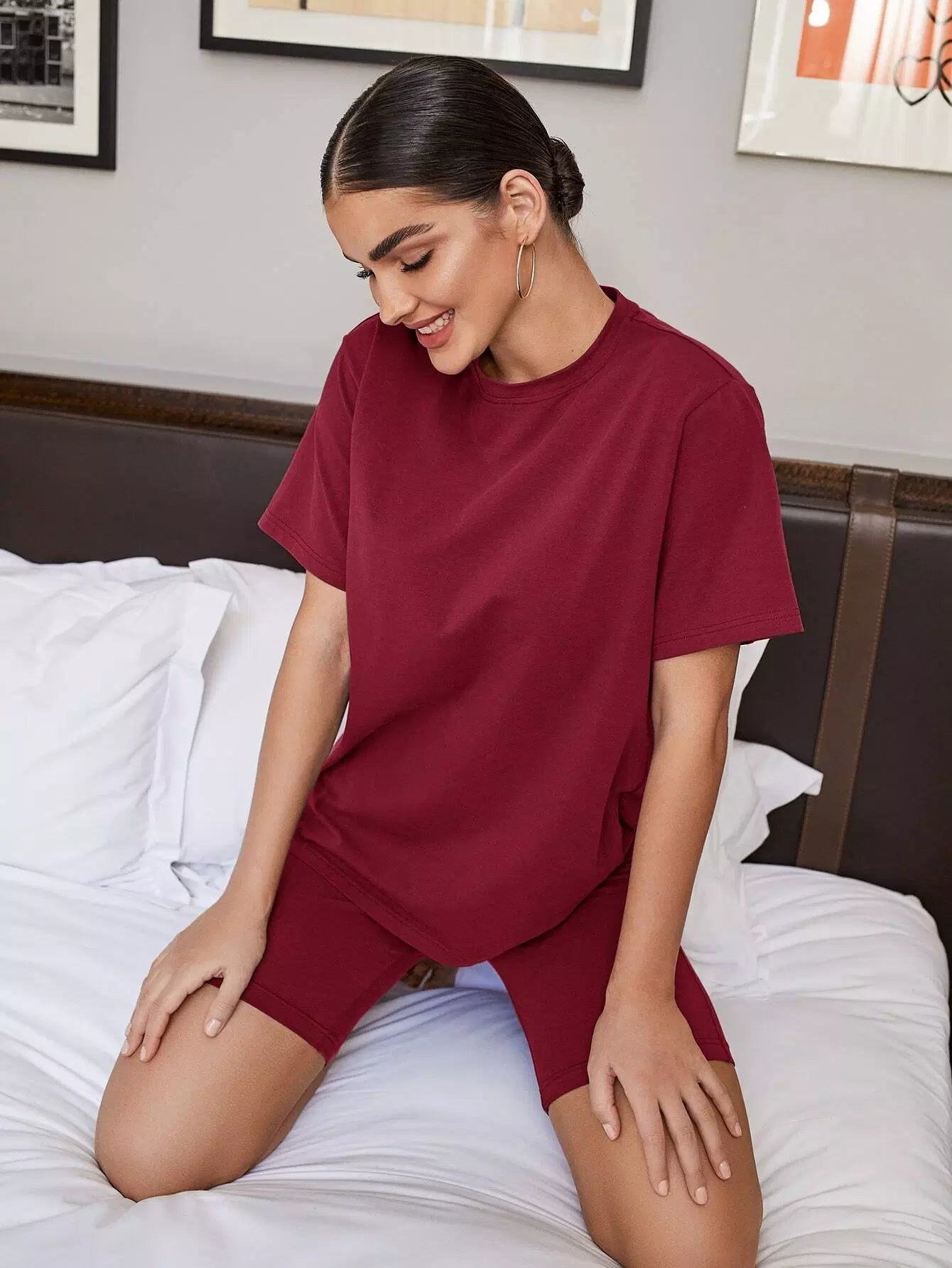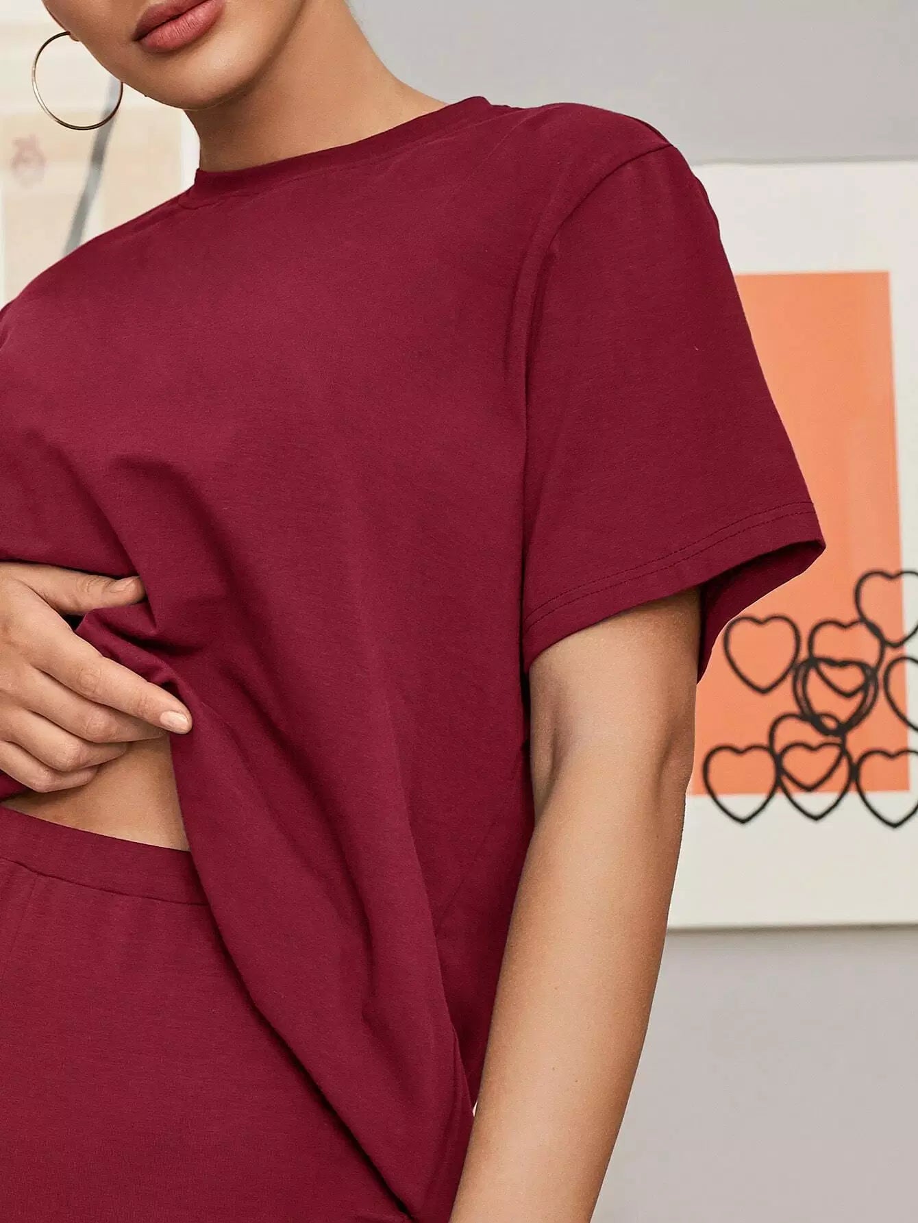 طقم بلوزة برقبة دائرية سادة برقبة مستديرة وشورت بياقة دائرية