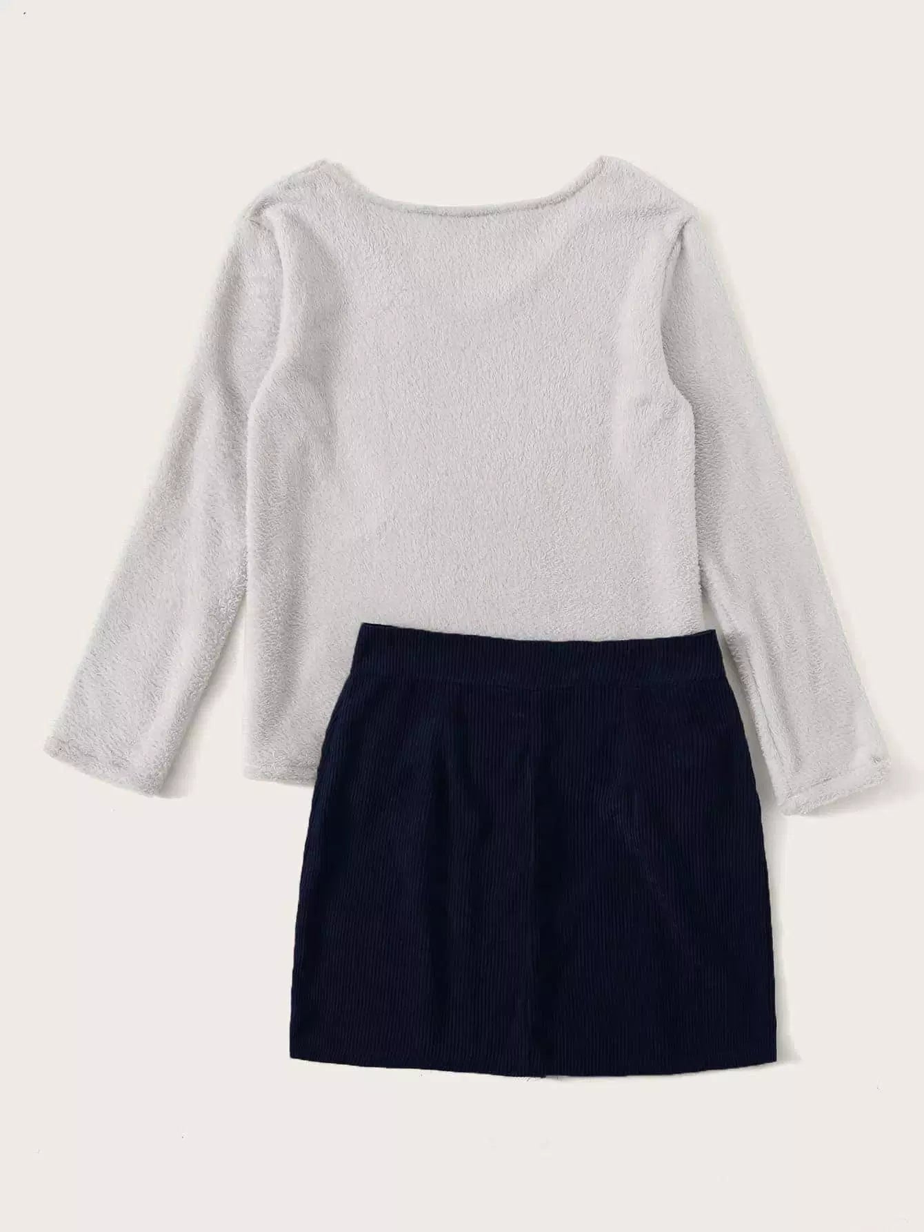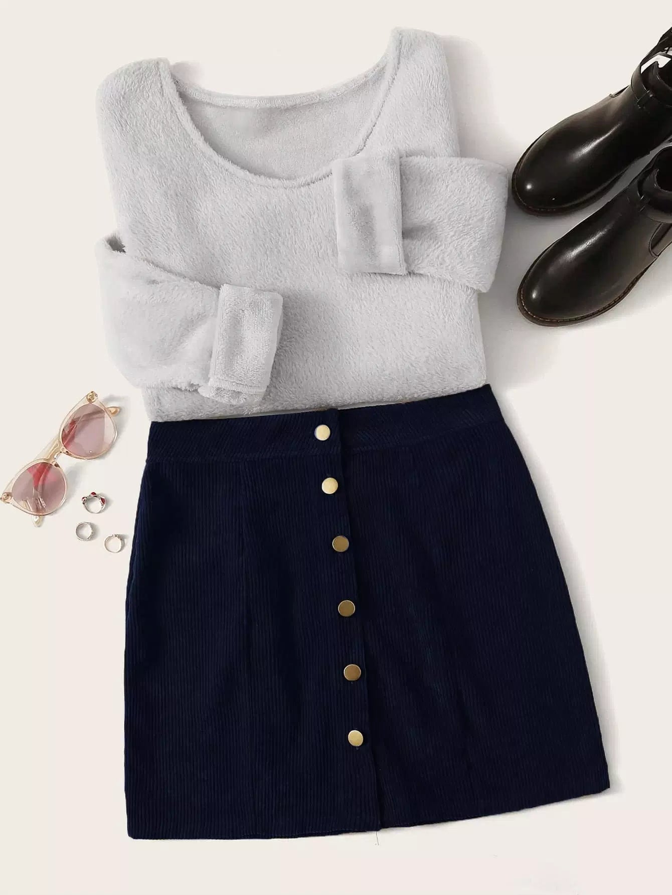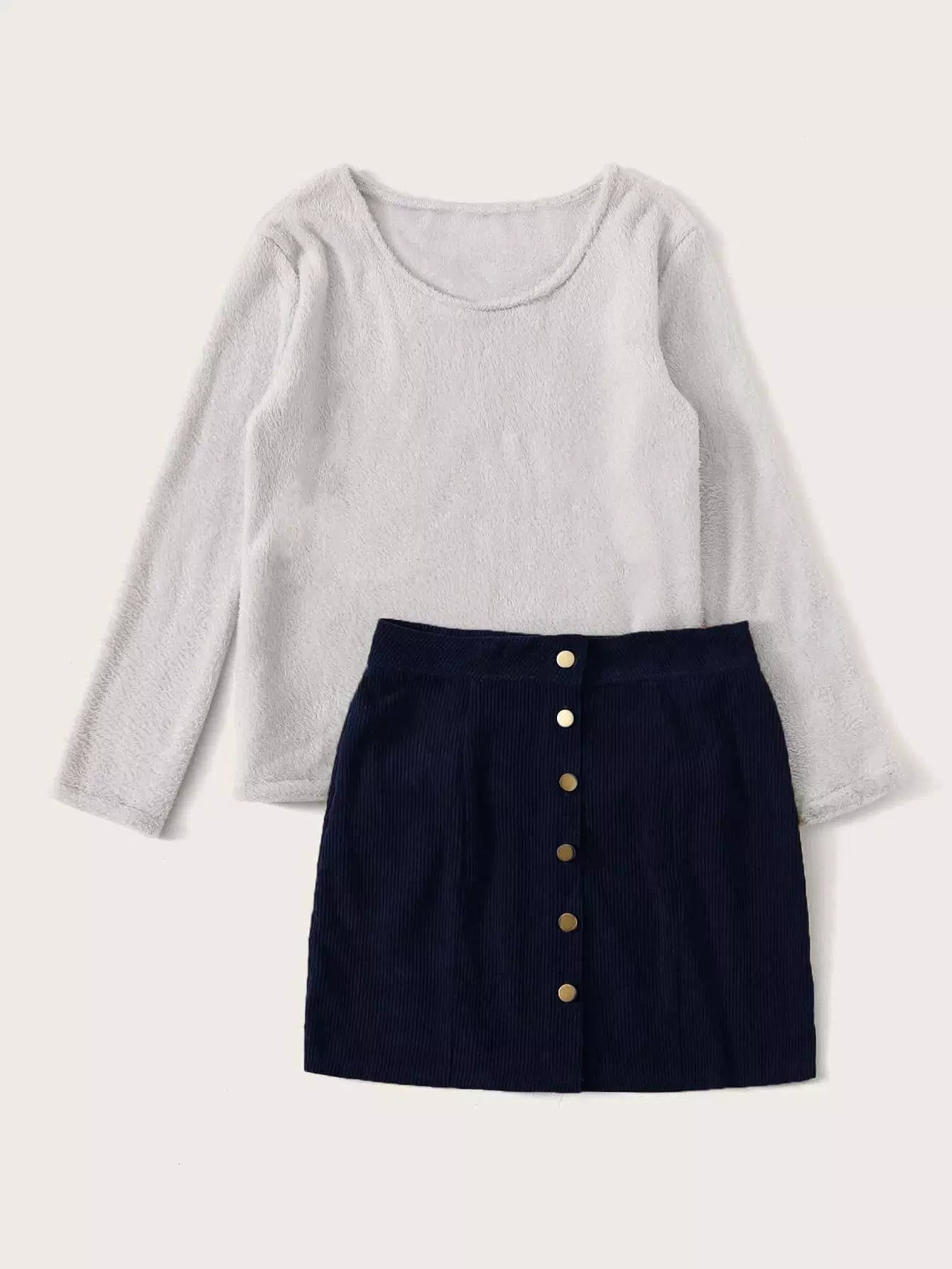 تي شيرت تي شيرت مع تنورة بأزرار أمامية من الكوردروي