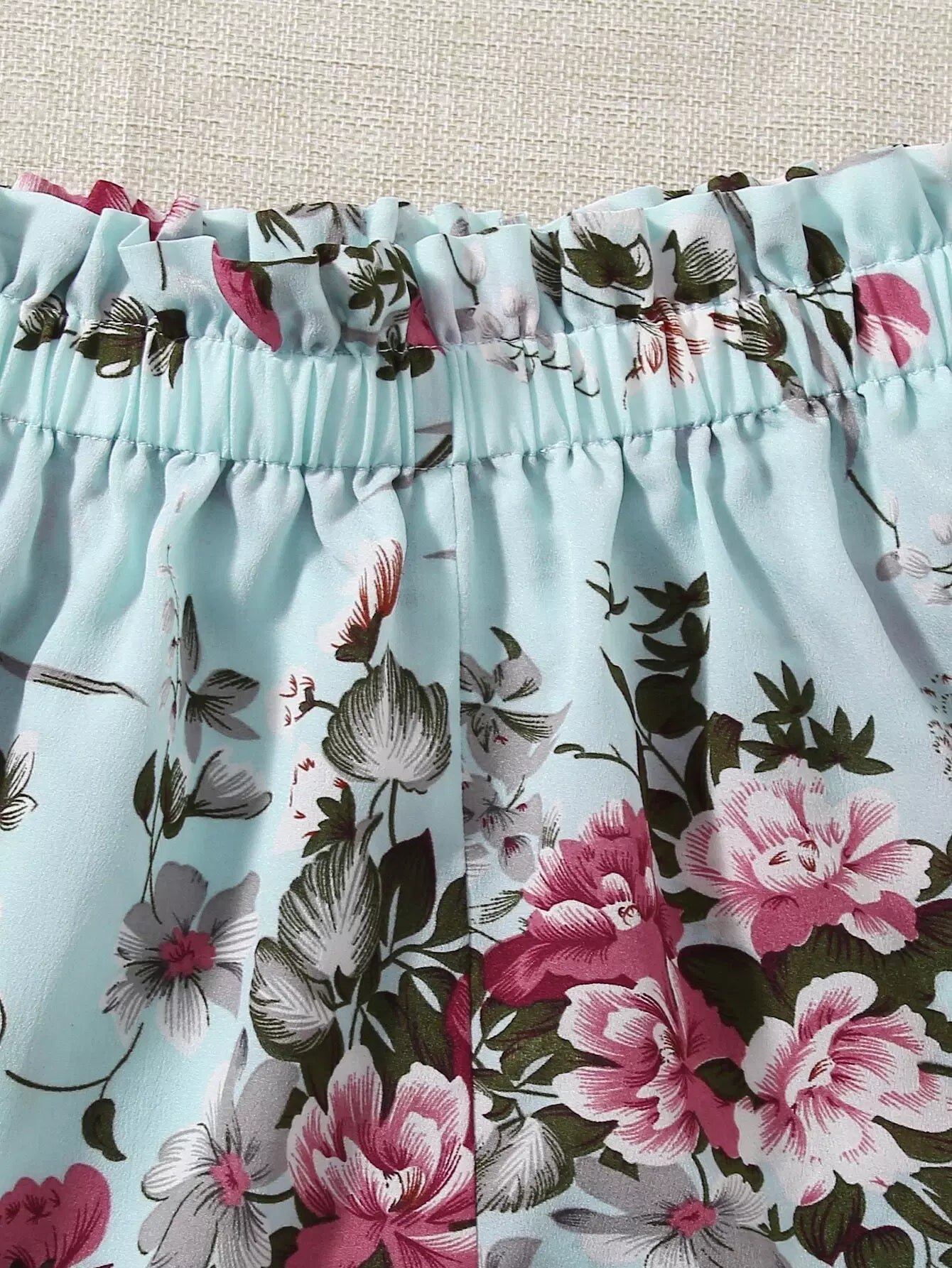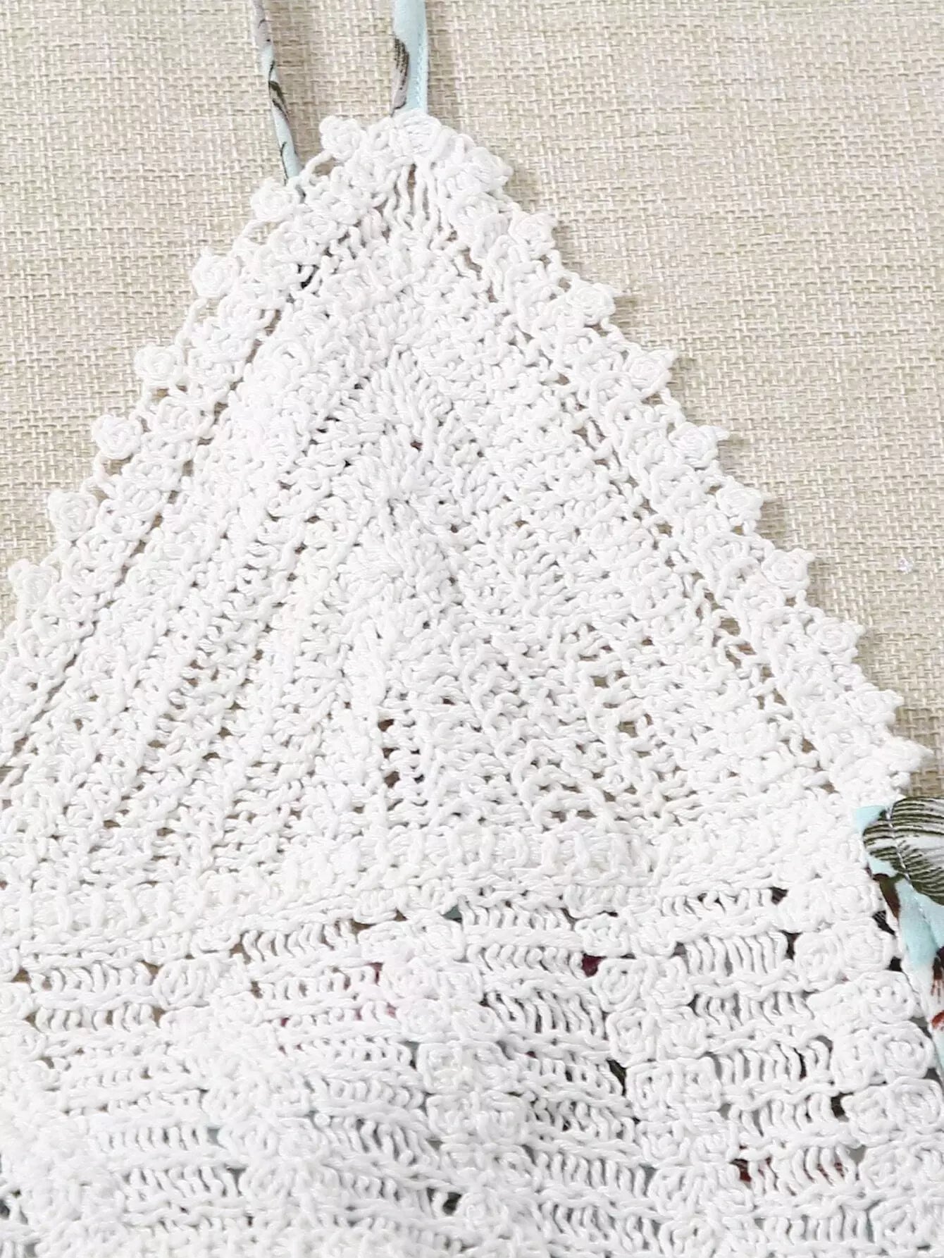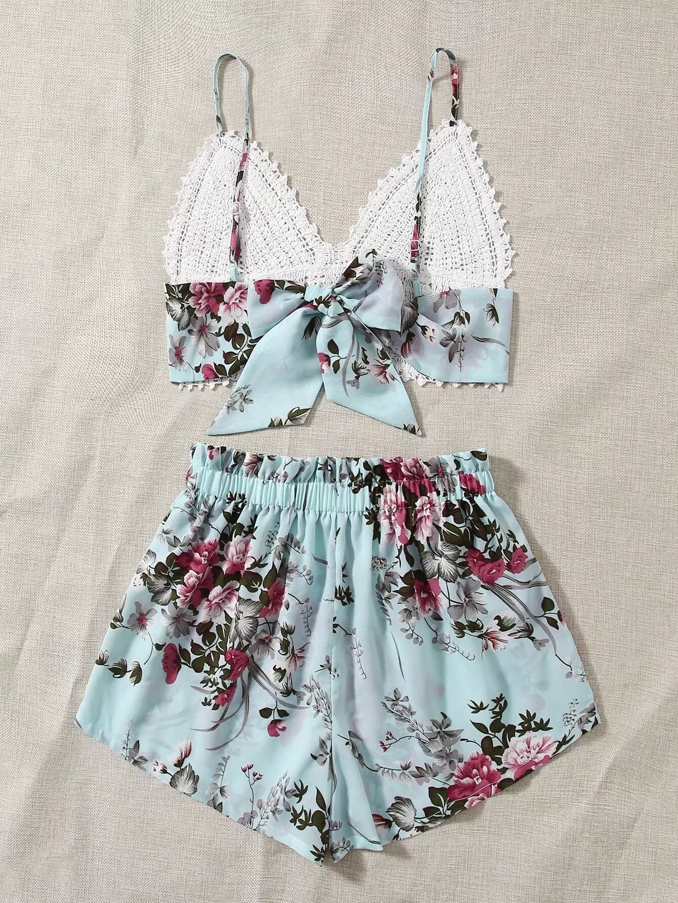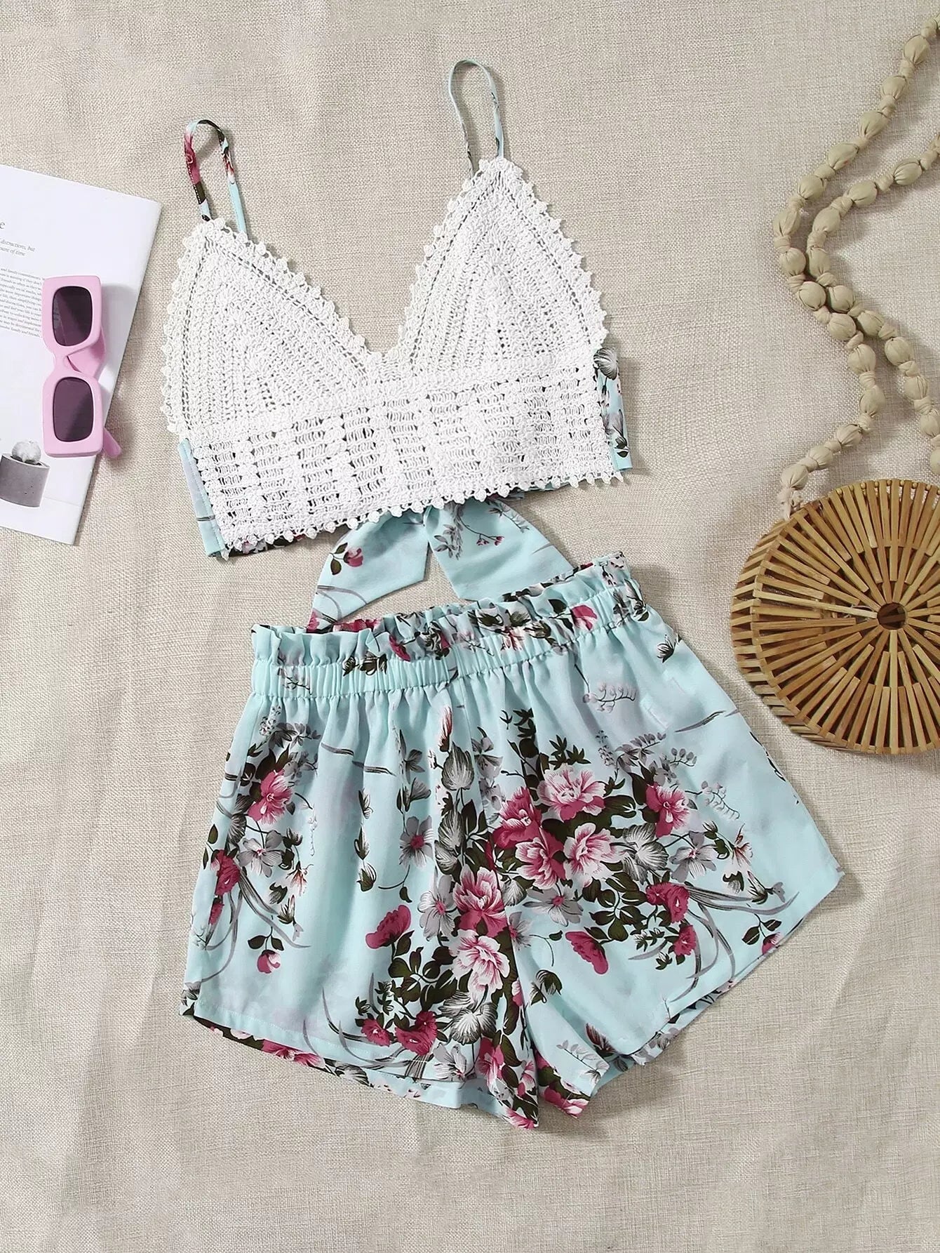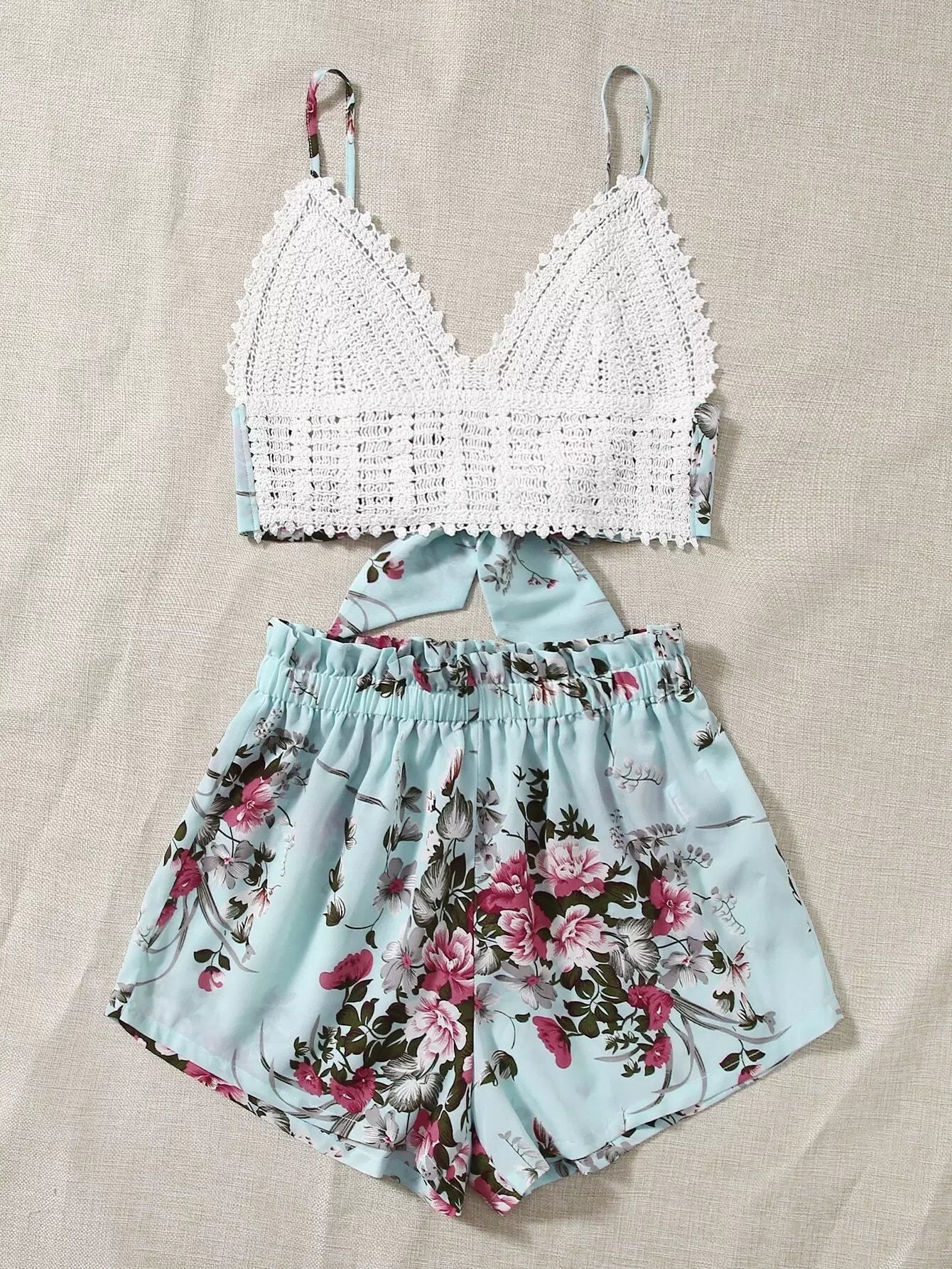 طقم بلوزة كروشيه كاميه بربطة من الخلف وشورت وردي بخصر وردي