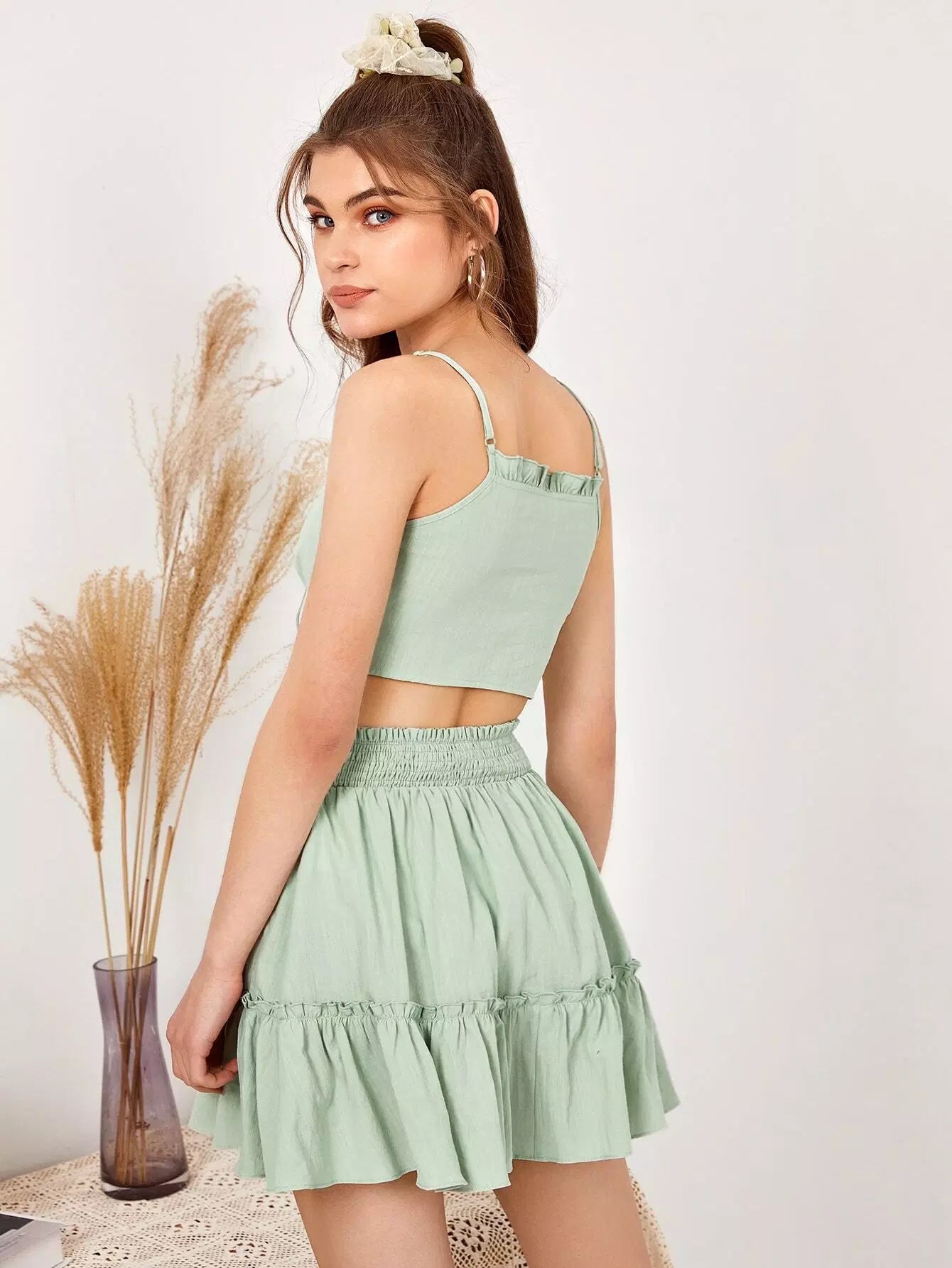 طقم قميص قصير قصير برباط أمامي مكشكش من الأمام مع تنورة مكشكشة الخصر بحافة كشكش