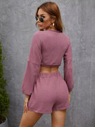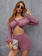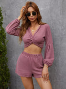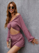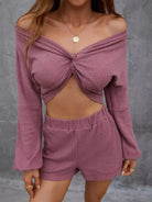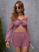 بلوزة قصيرة وشورت قصير محبوكة من الأمام ملتوية ومتماسكة من الأمام