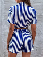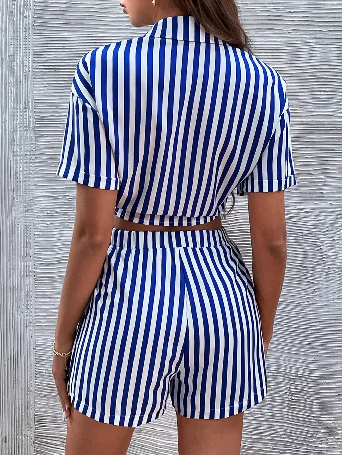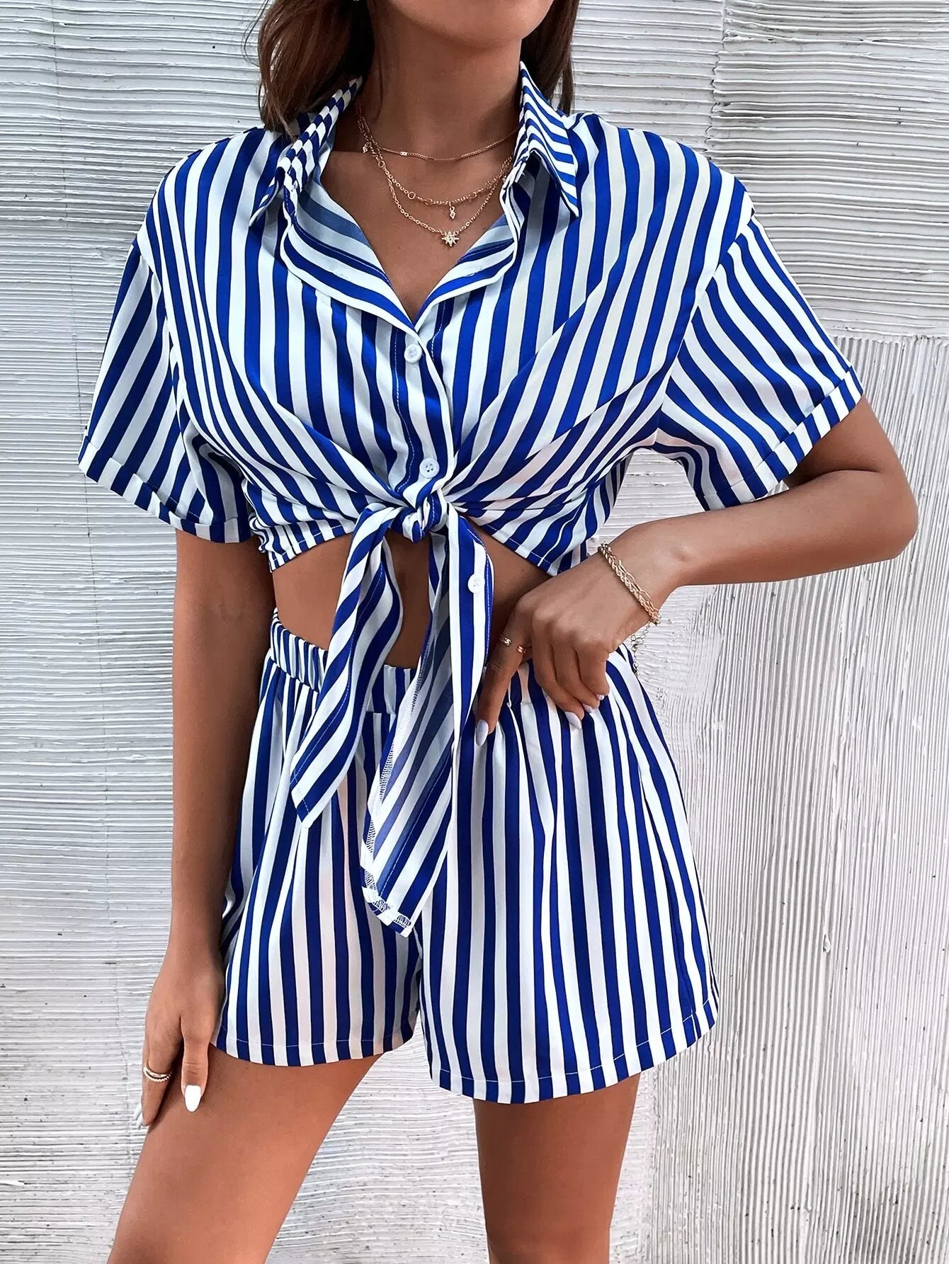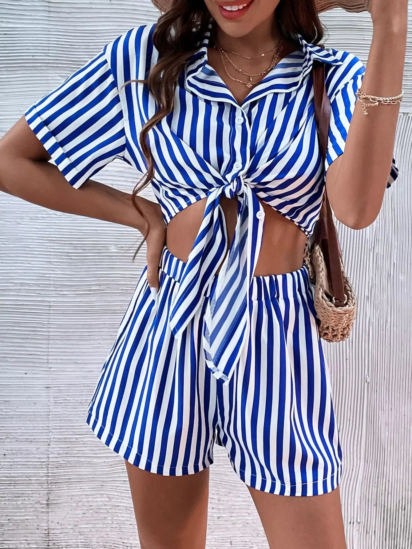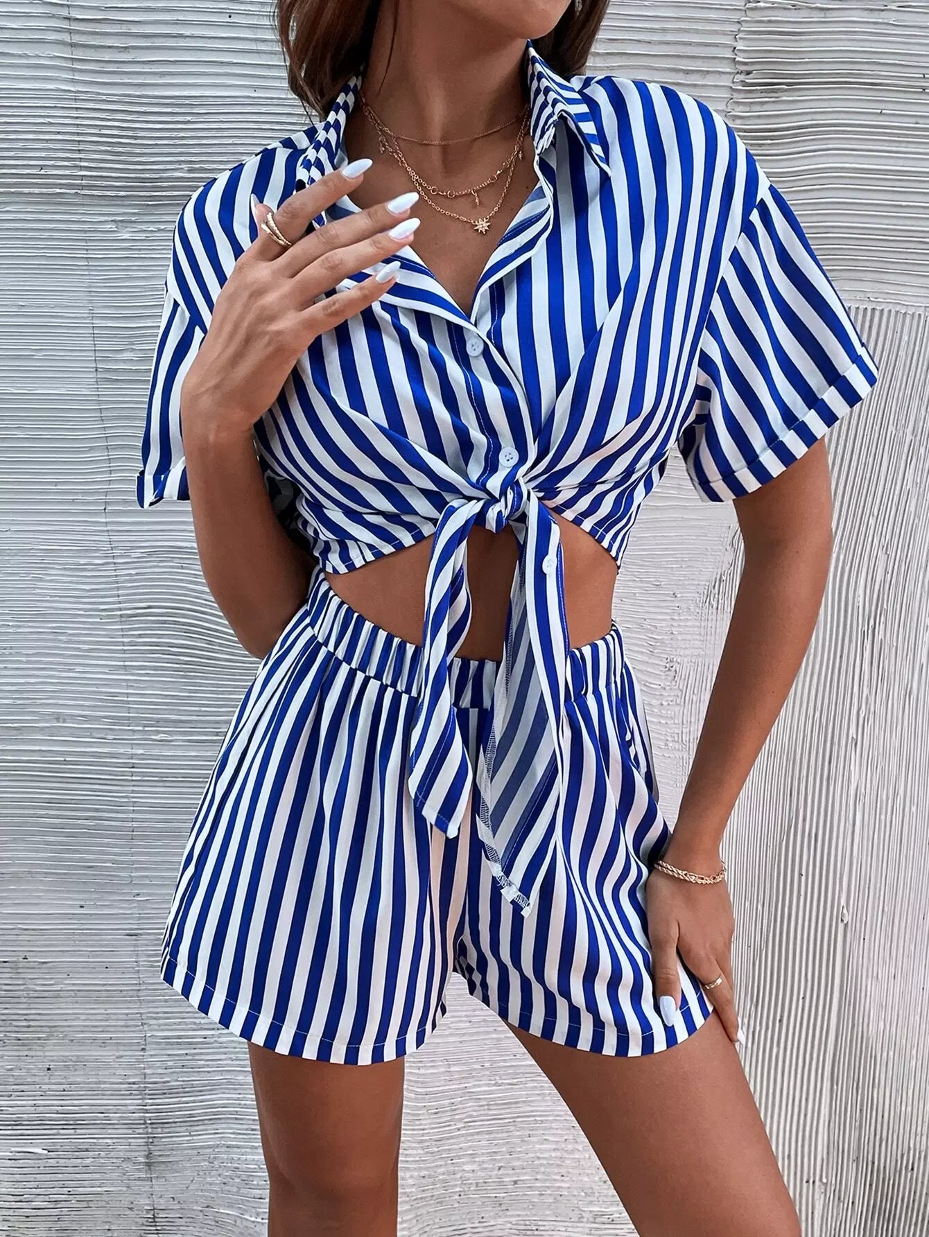 طقم بلوزة وشورت مخطط بلونين مخطط بكتفين منسدل بحاشية عقدة منسدلة