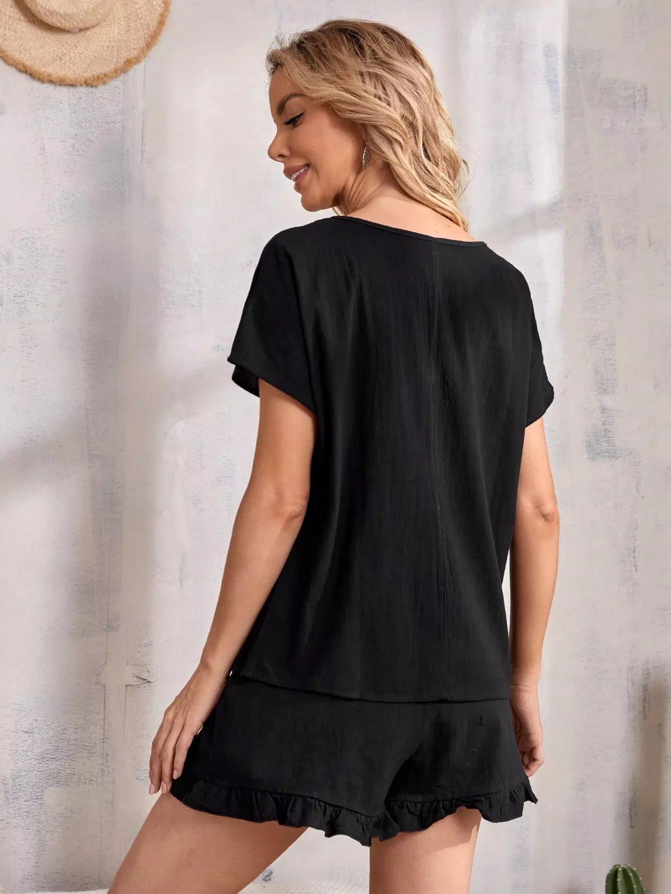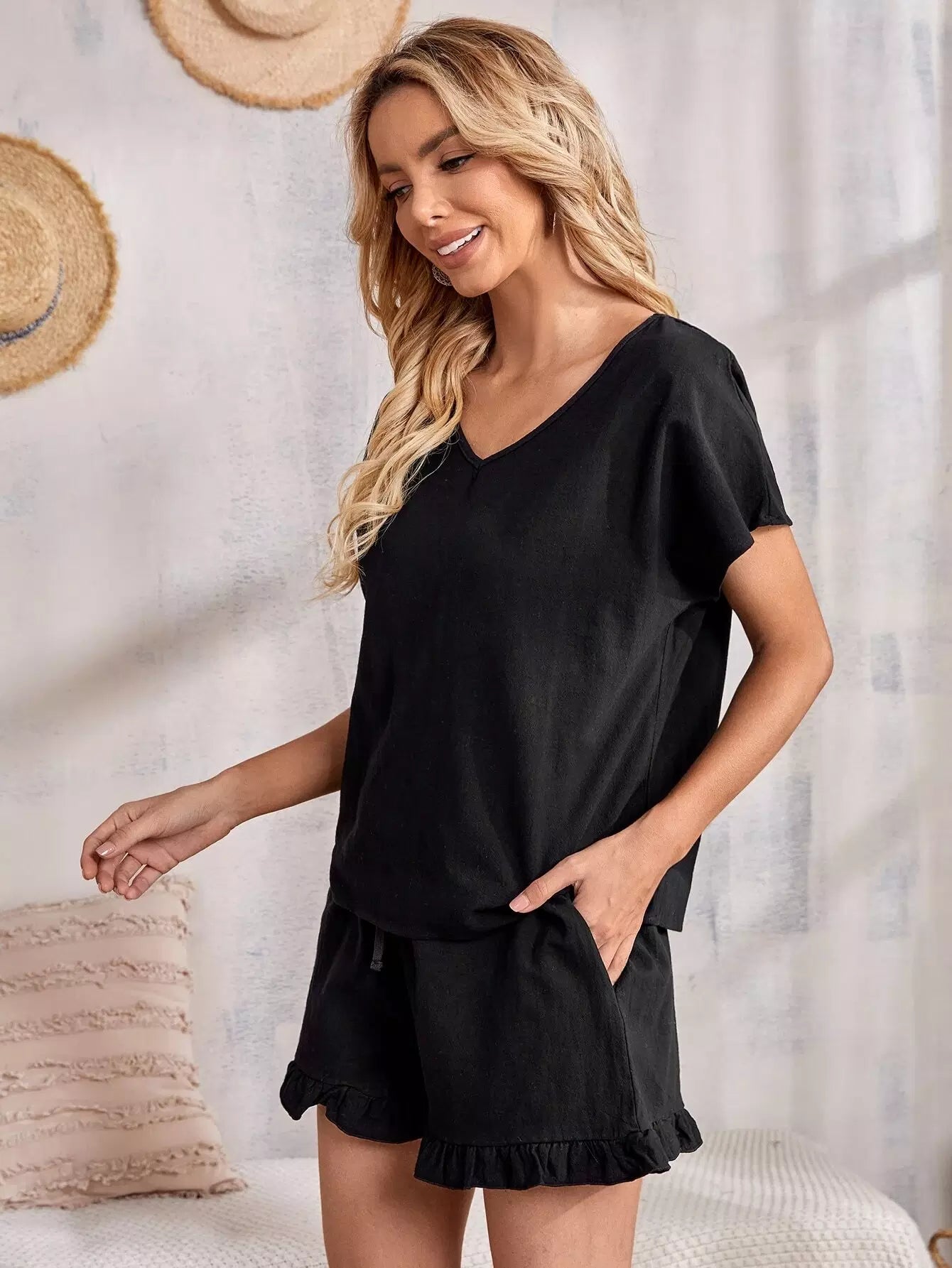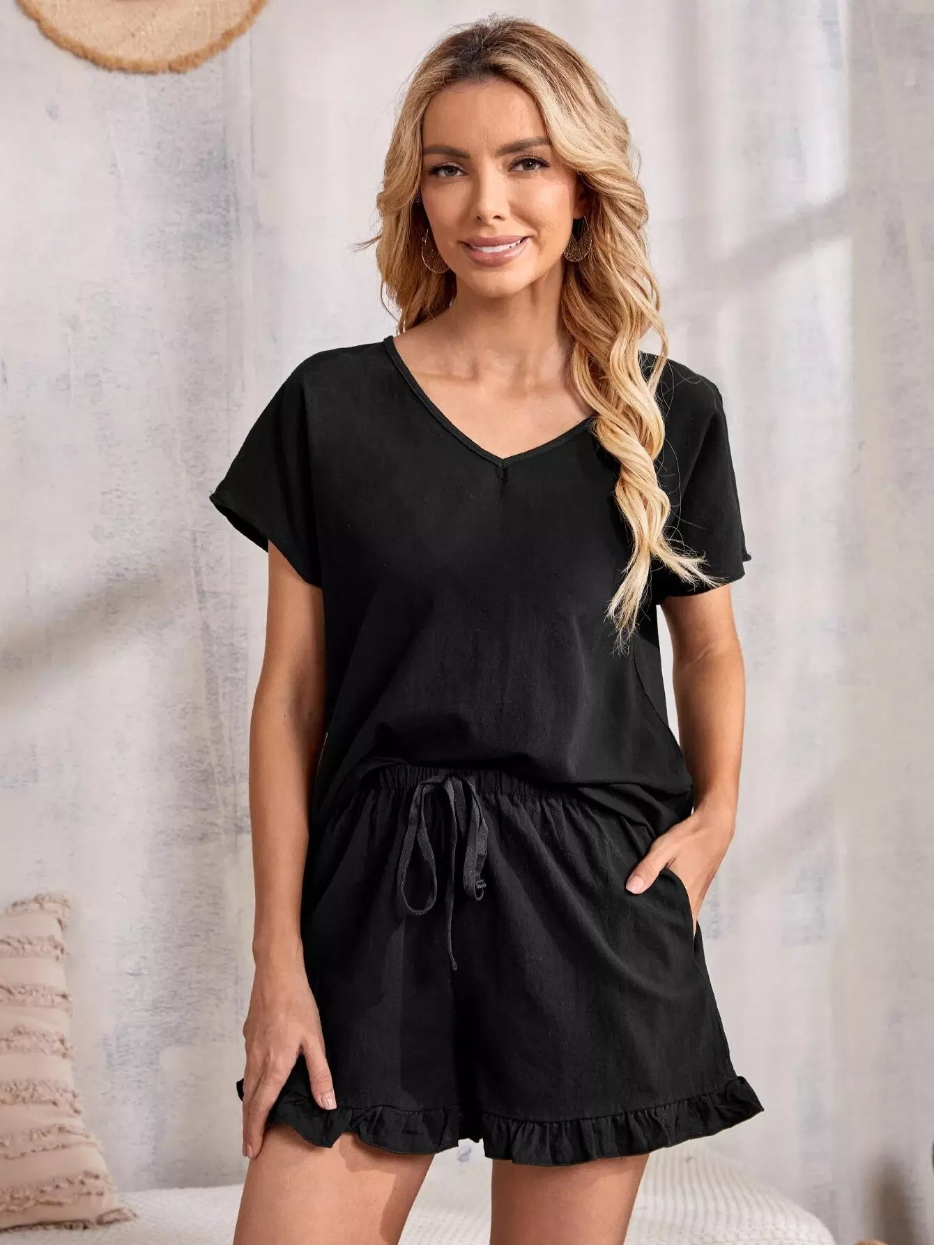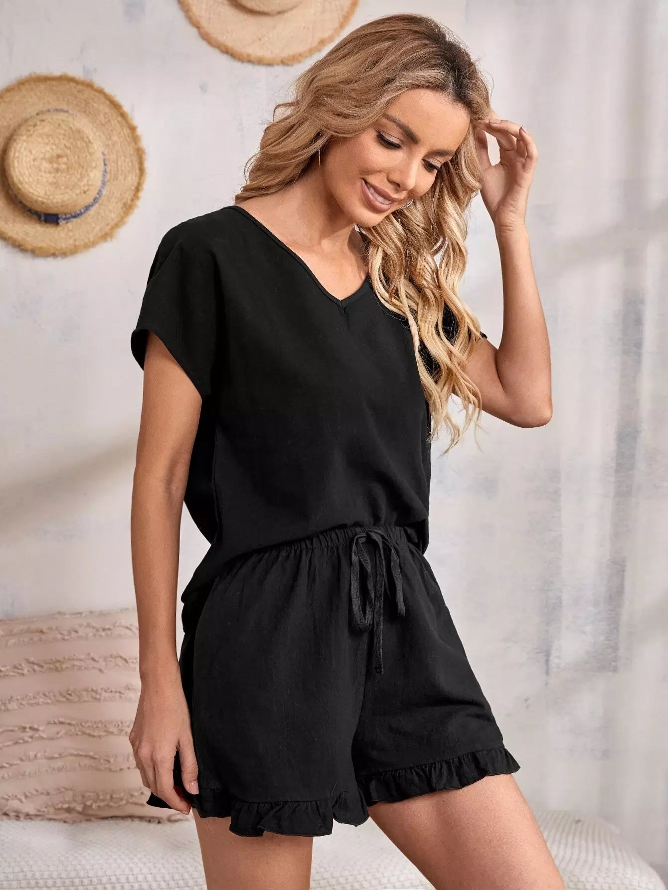 طقم بلوزة بأكمام خفاش وفتحة رقبة على شكل حرف V وشورت بخصر عقدة