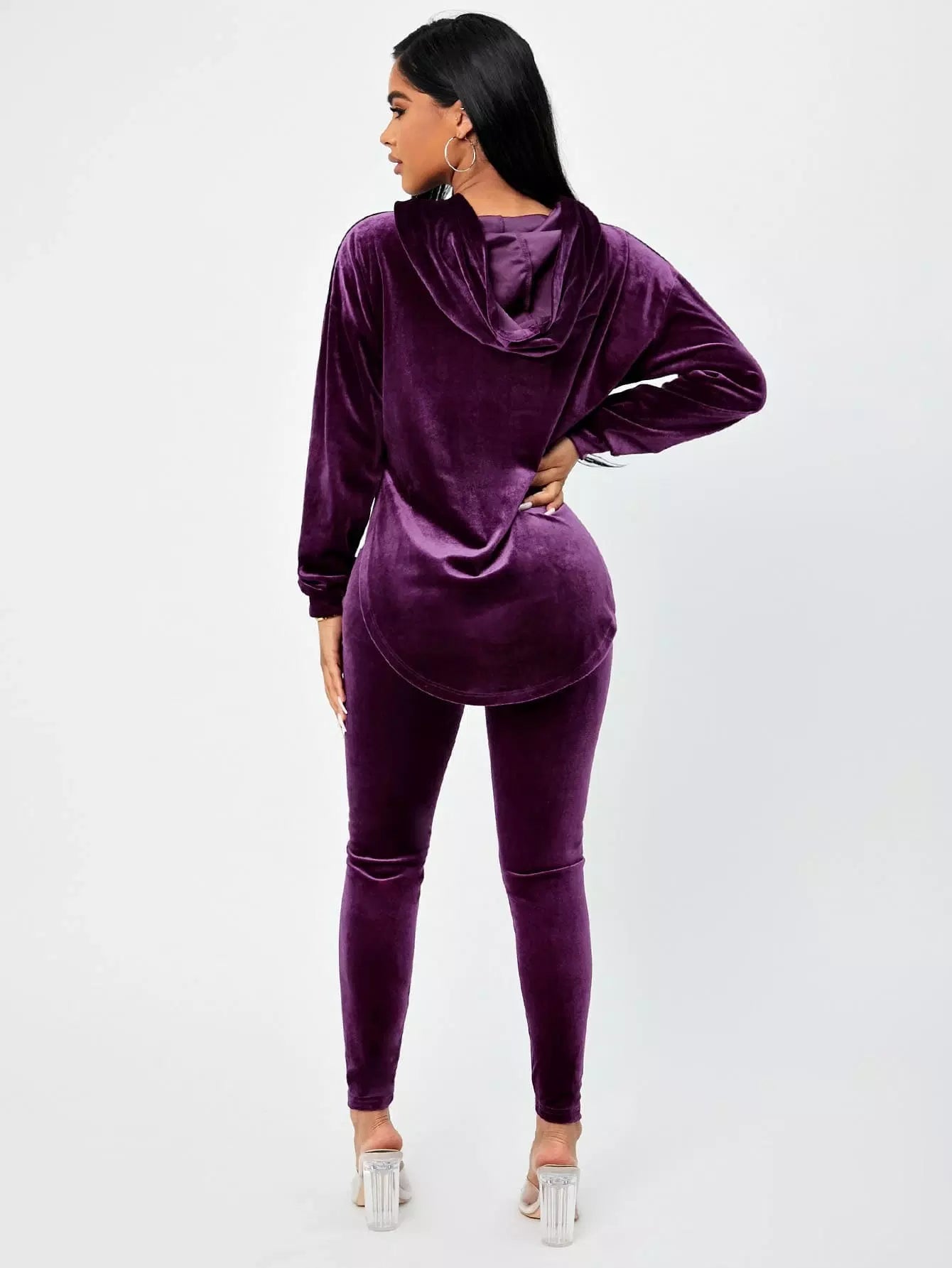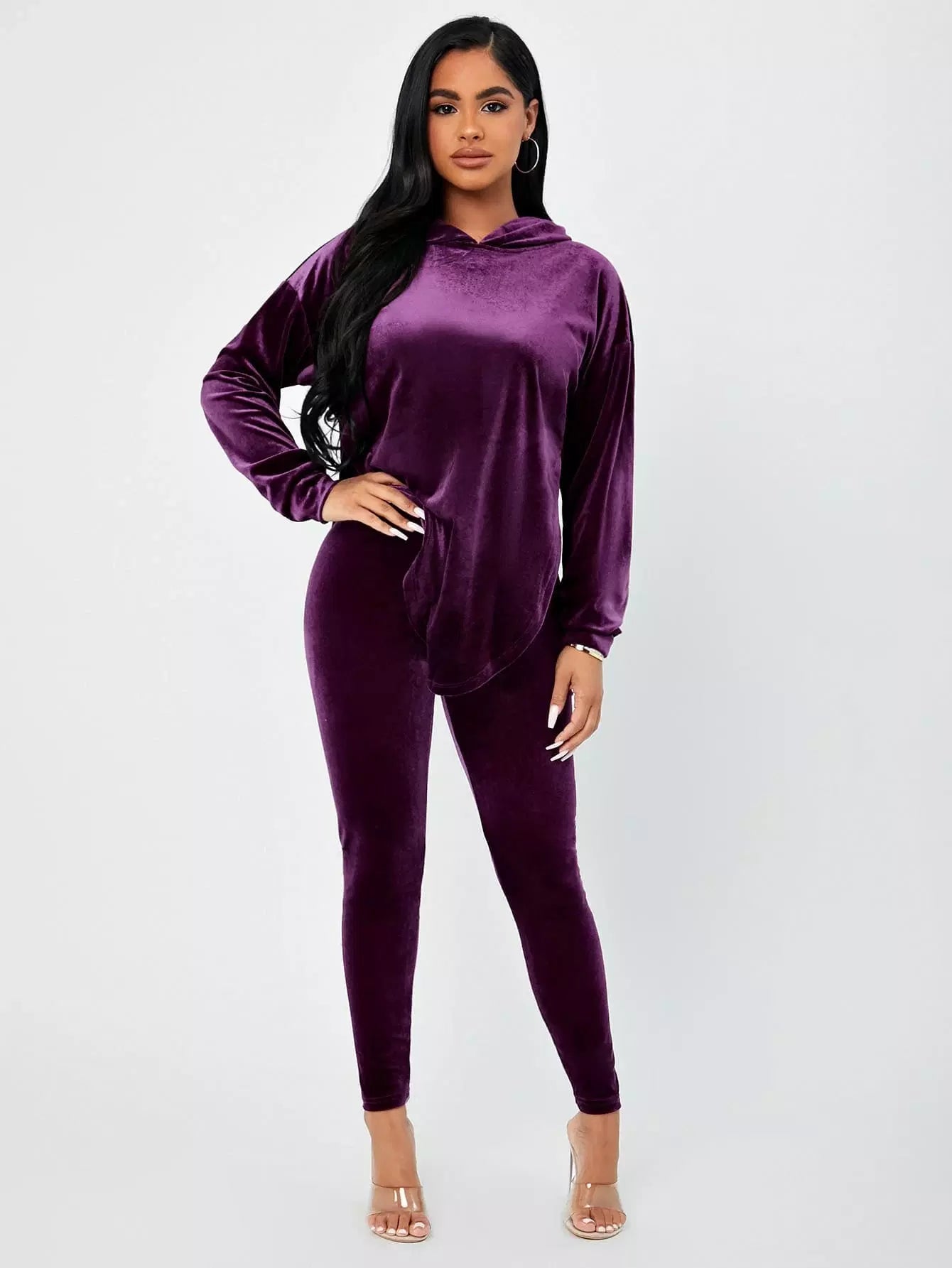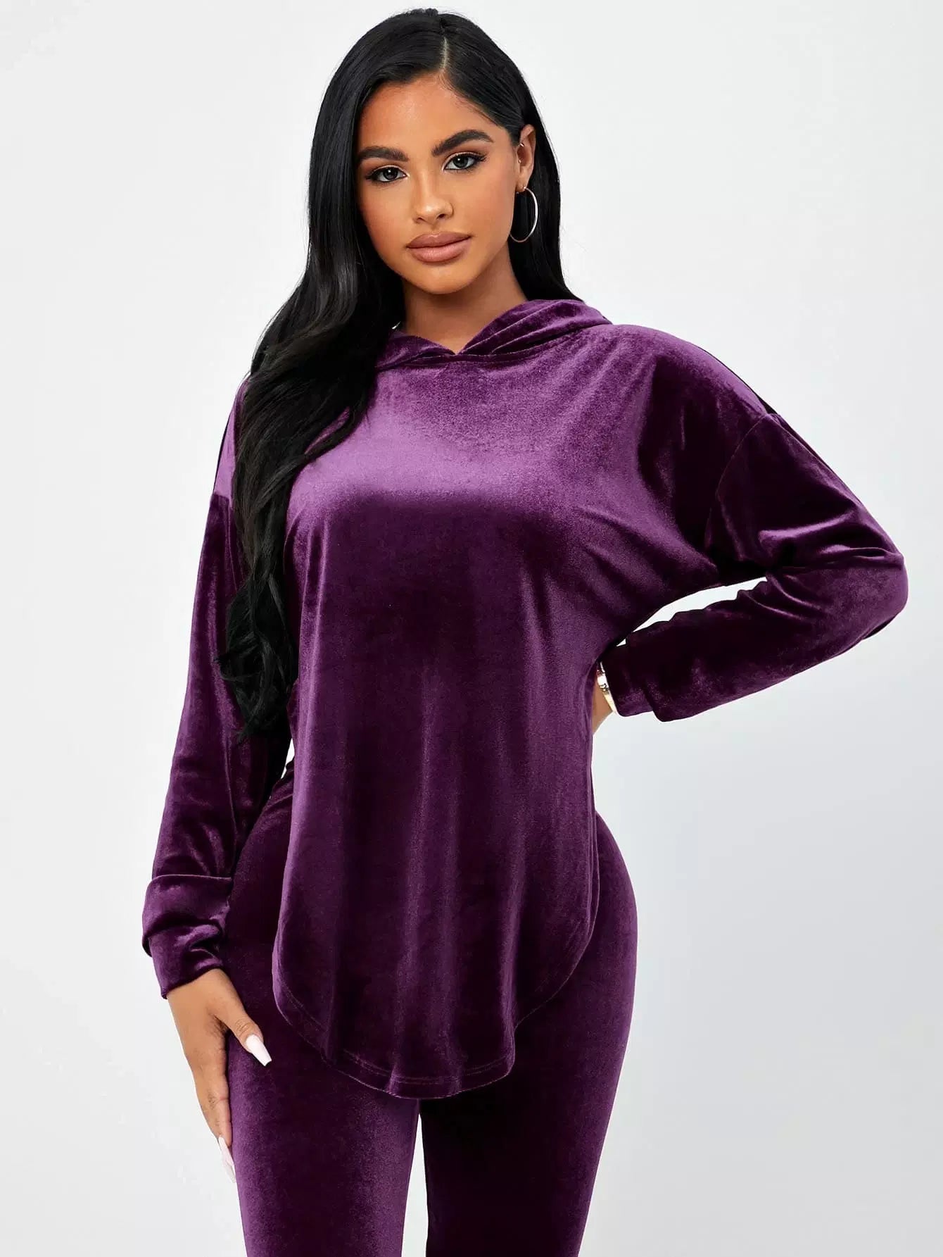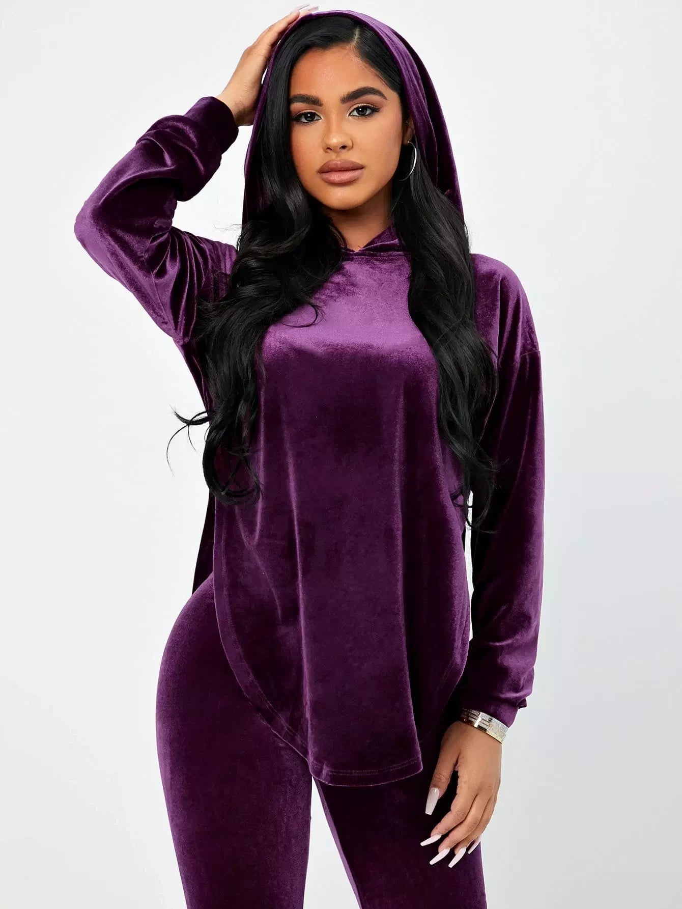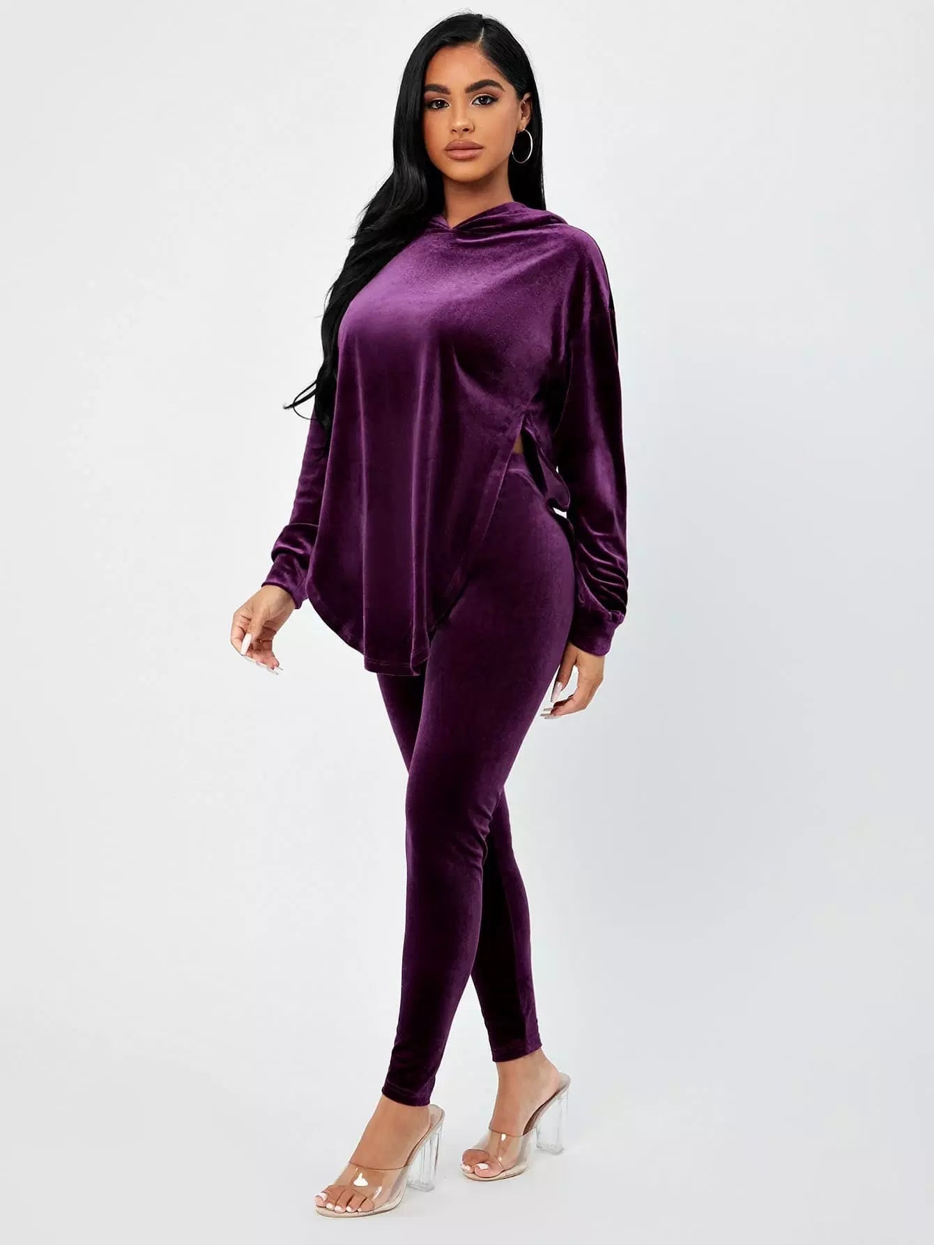 طقم هودي وبنطلون مخملي منسدل الكتفين بغطاء مخملي