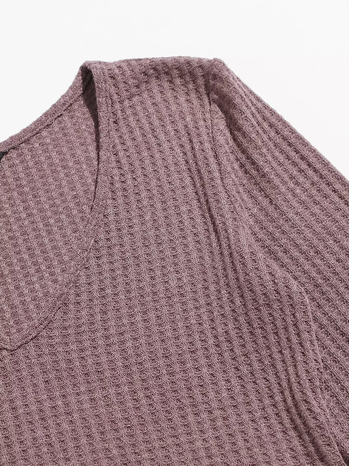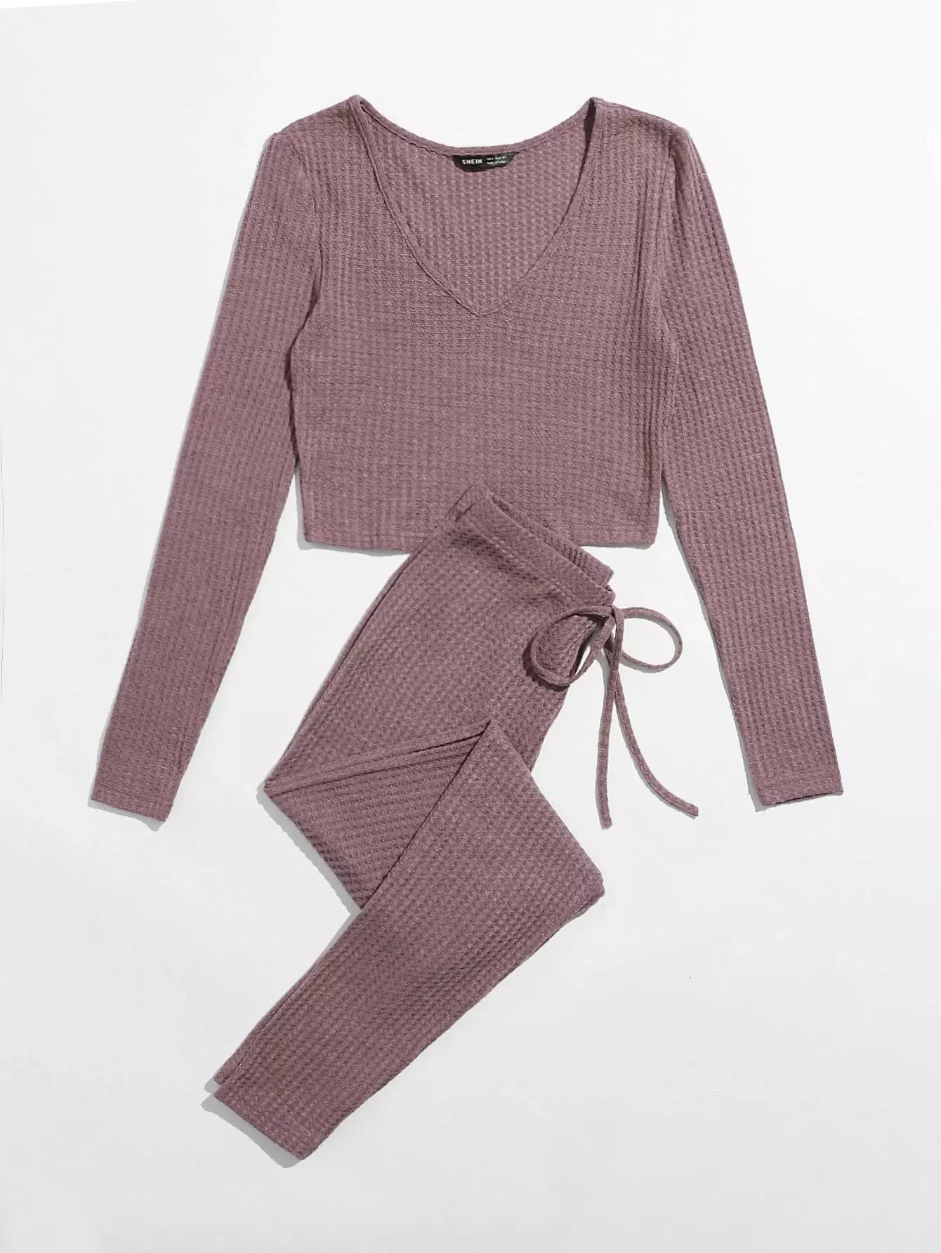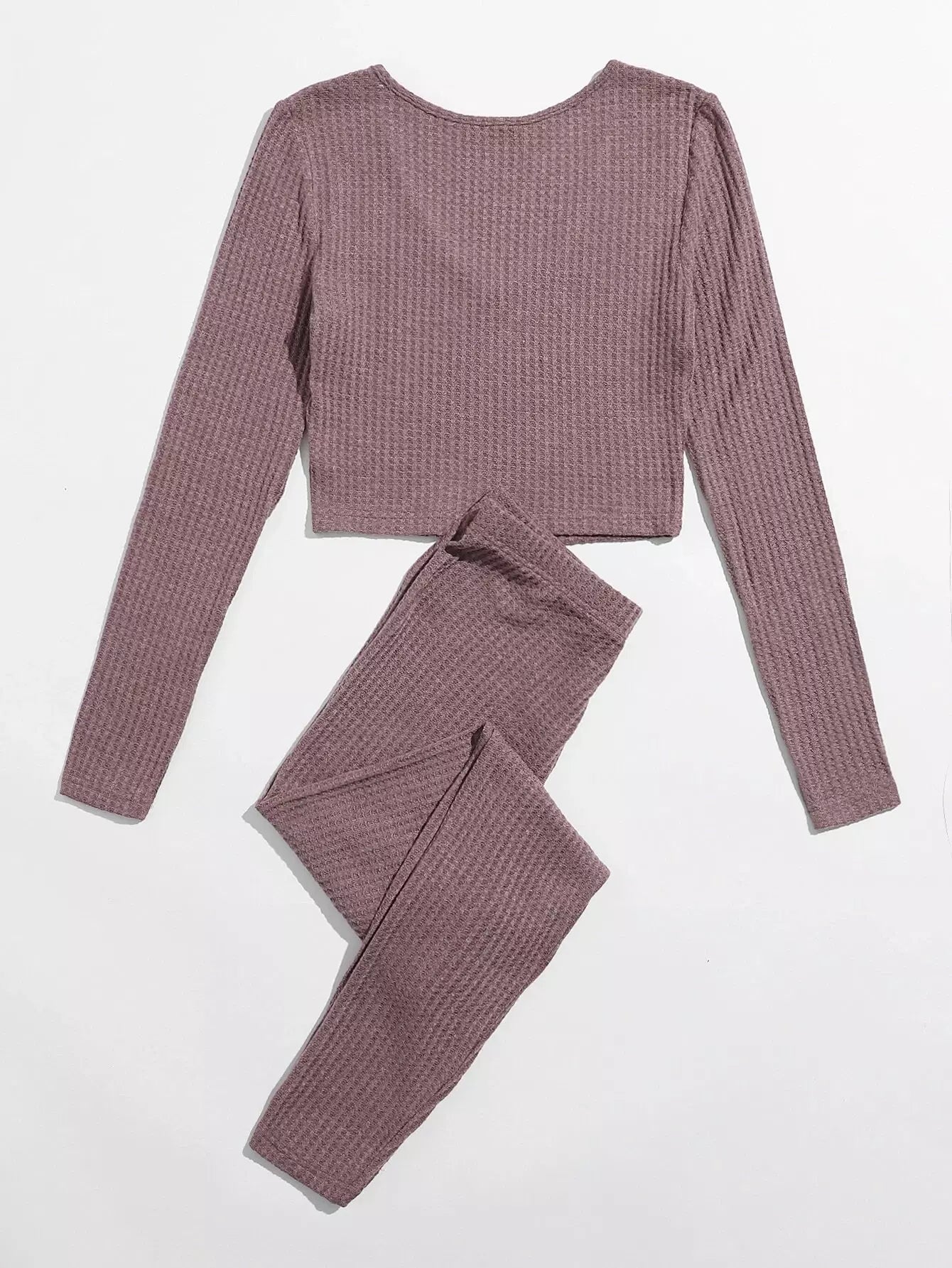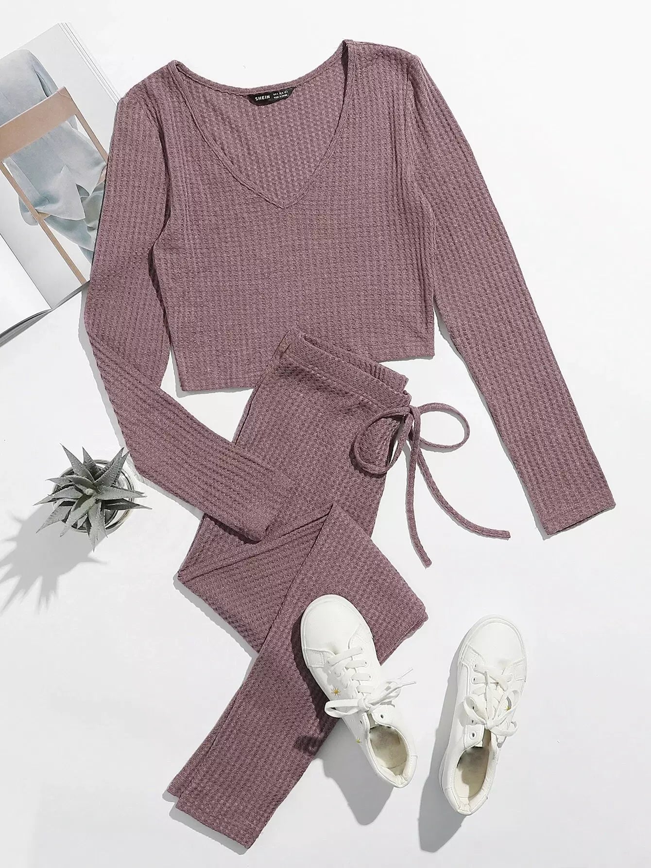 طقم بلوزة محبوكة بنقشة وافل وطقم بنطلون ضيق بخصر معقود