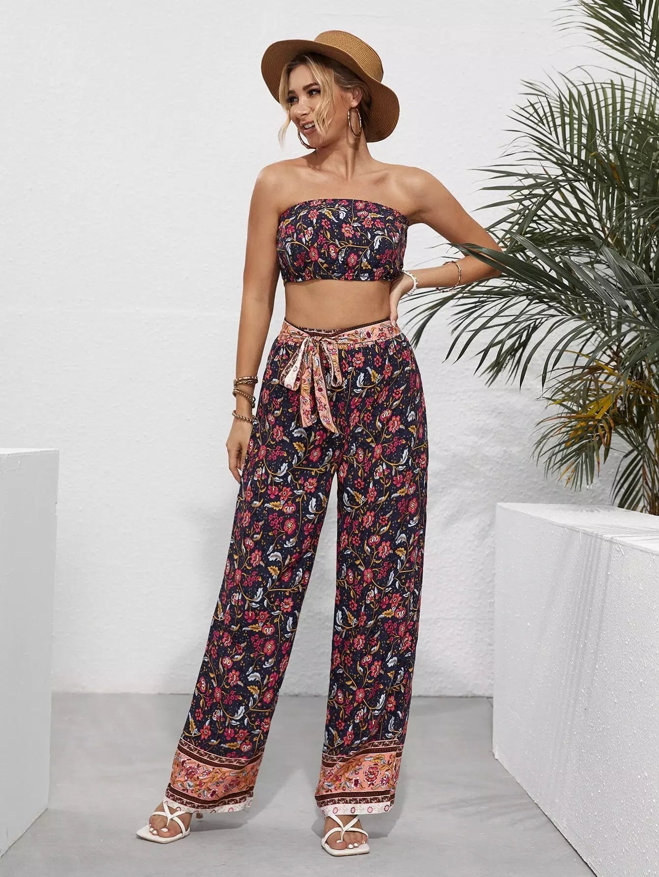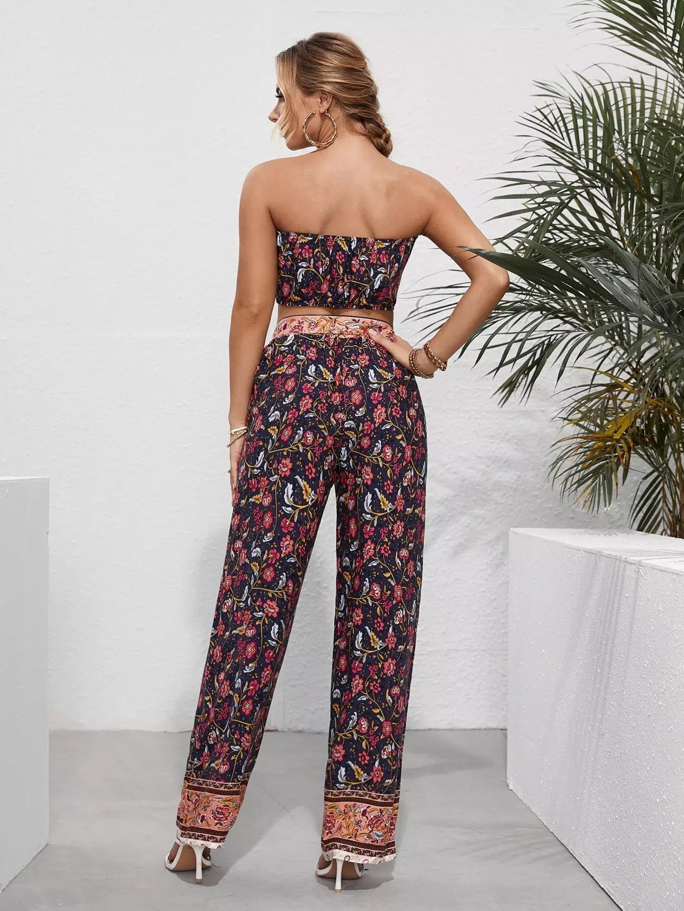 طقم سروال وقميص باندو بطبعة زهور بالكامل بدون حزام