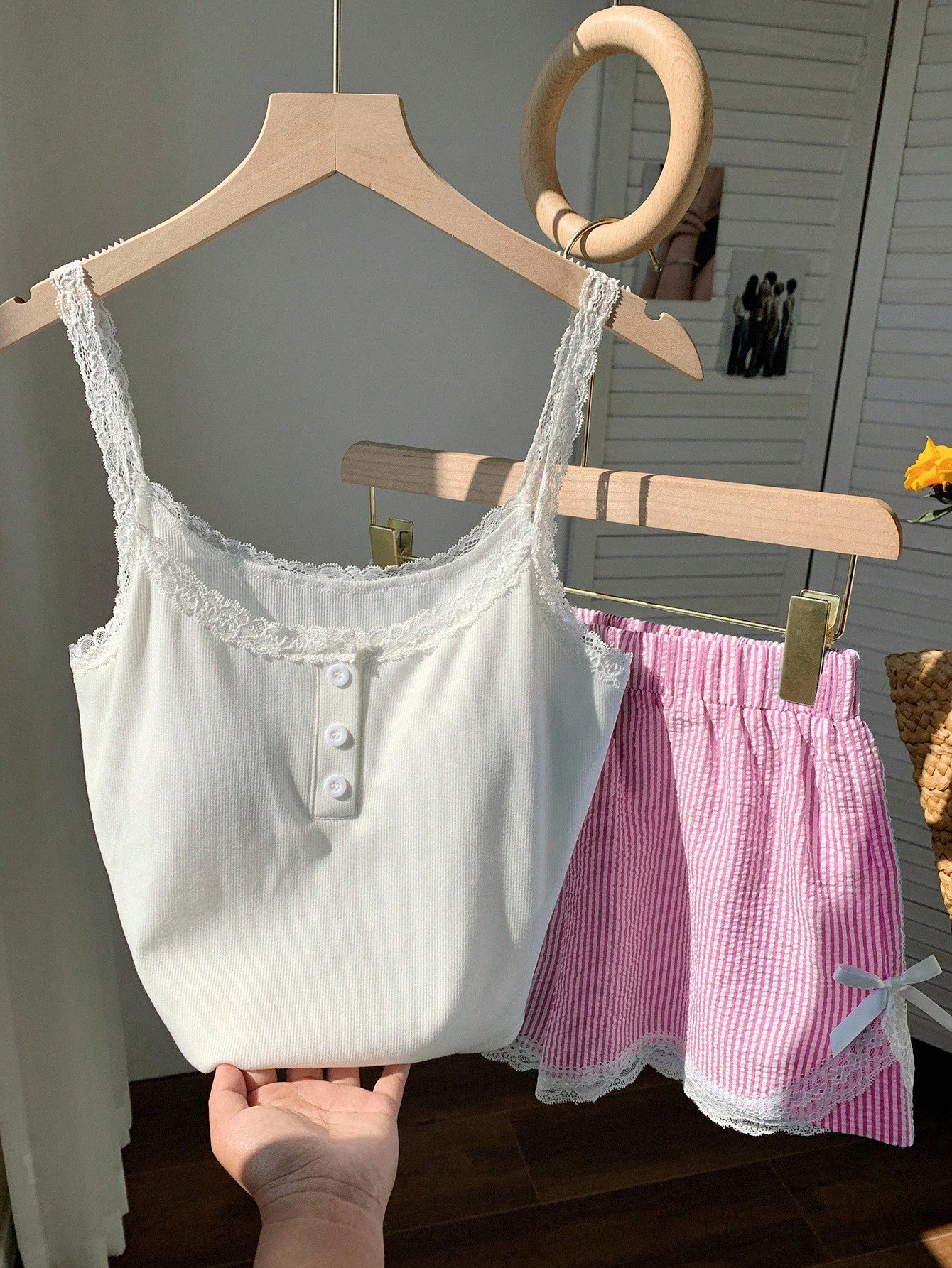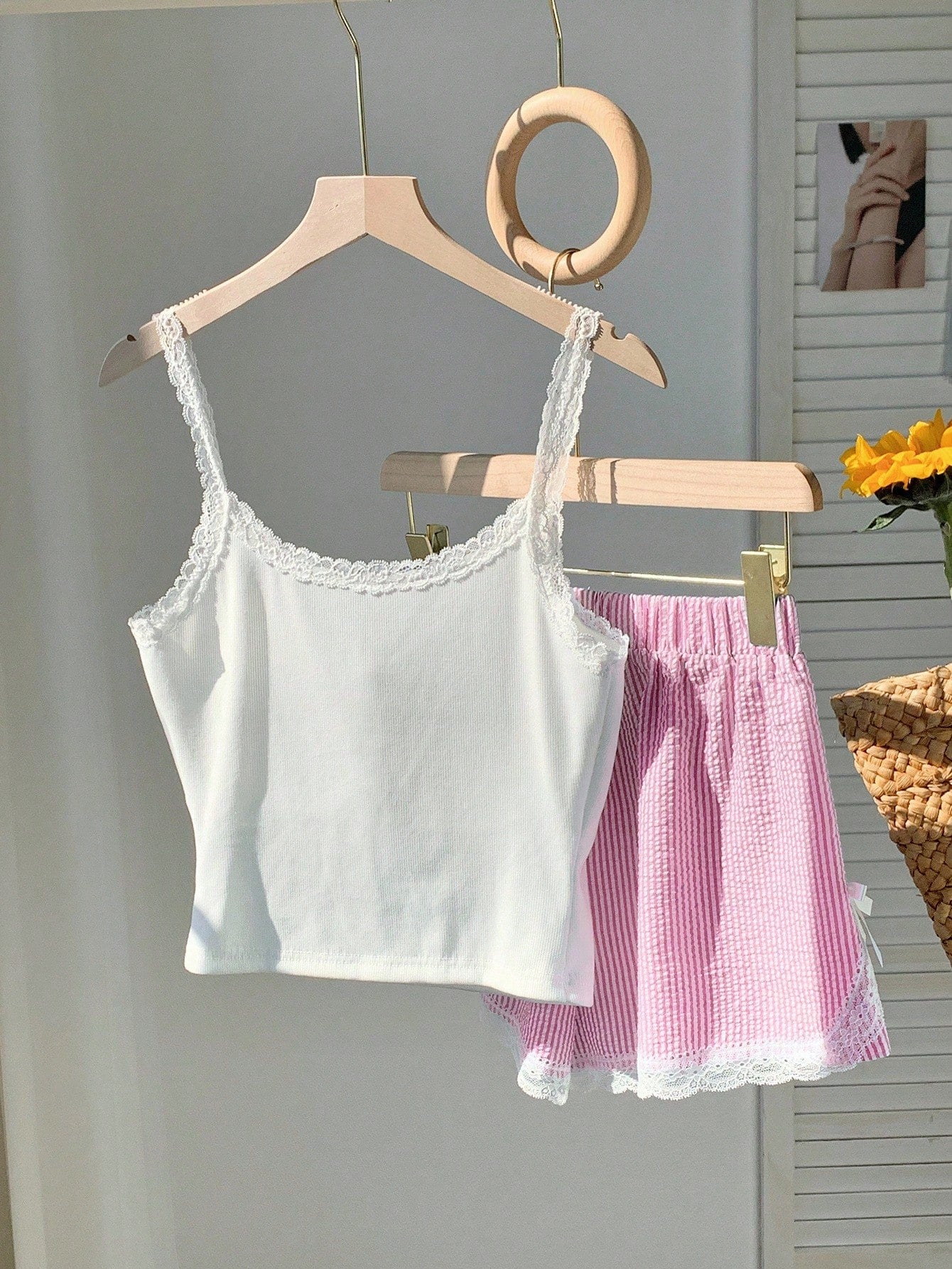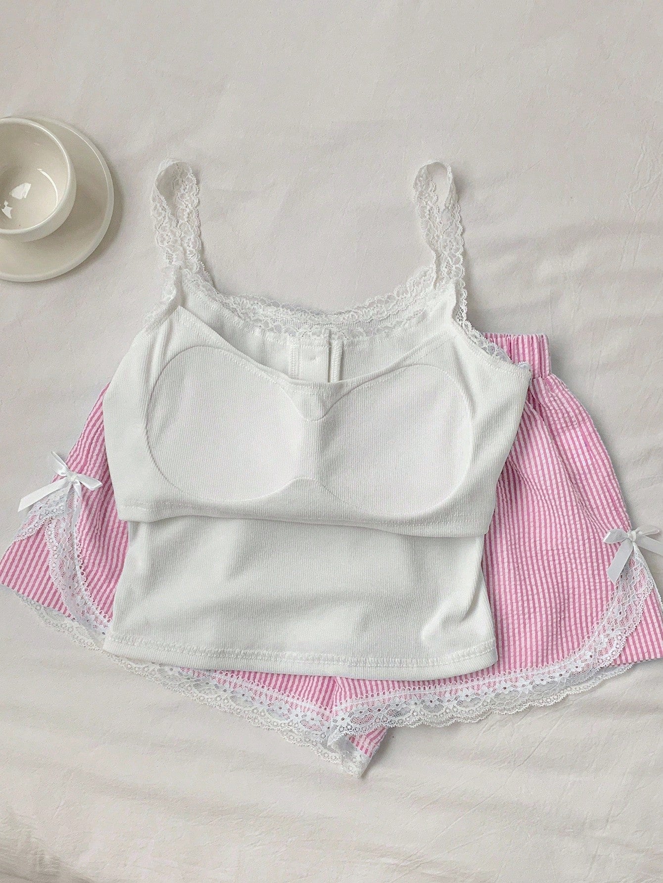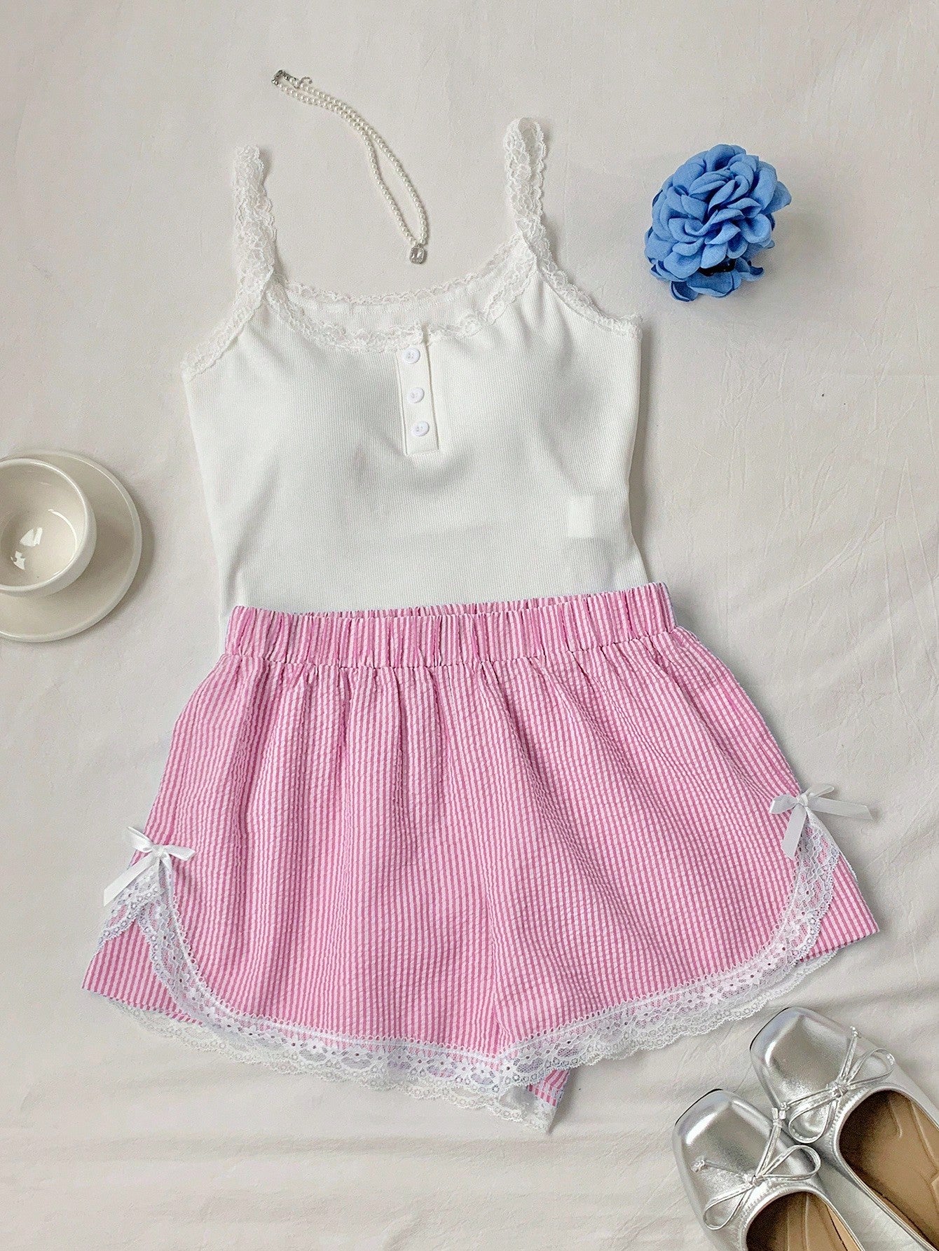 Comfortcana 2pcs/Set Women's Summer Casual Lace Trim Stripe Print Camisole & Shorts Set Island Vacation