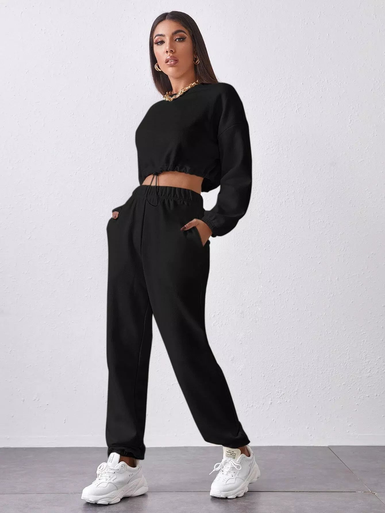 طقم كنزة صوفية بحافة رباط قصير وبنطلون رياضي عالي الارتفاع