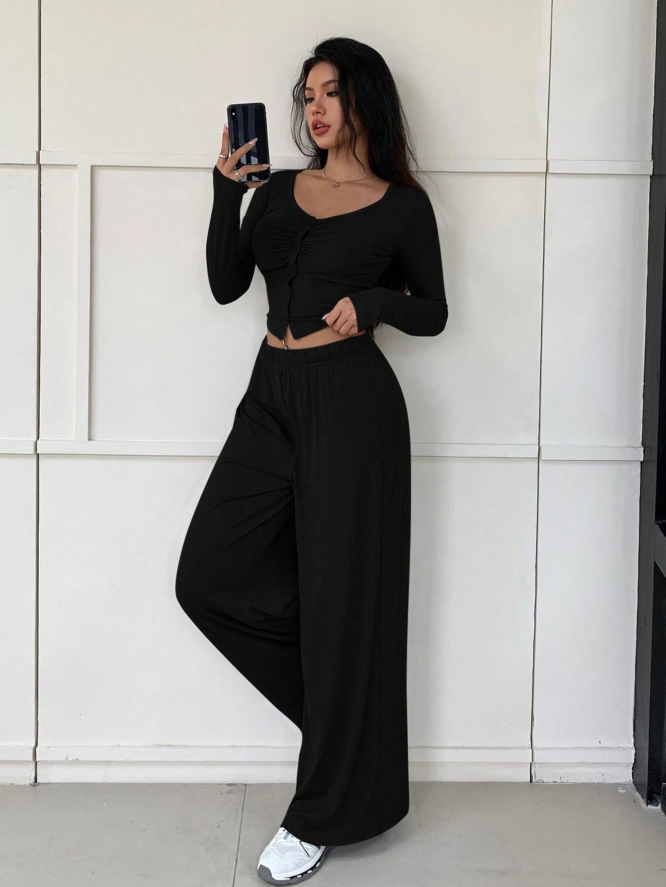 طقم DAZY مكون من قطعتين من بلوزة نسائية ملائمة مع بنطلون مبطن بالصوف للخريف والشتاء