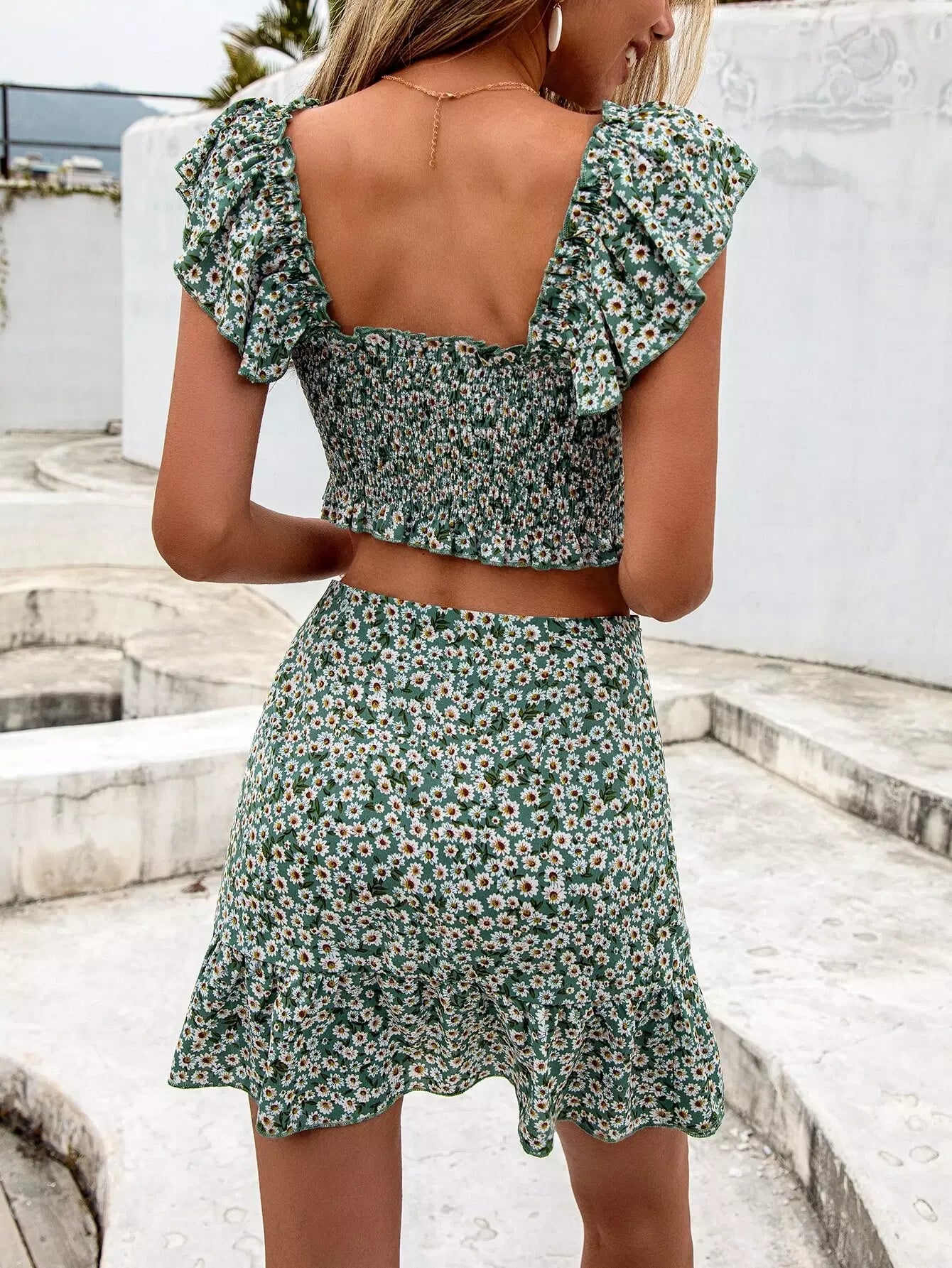 بلوزة بأكمام زهرية مزركشة بأكمام رفرفة بأكمام زهرية وتنورة ملفوفة بحواف مكشكشة