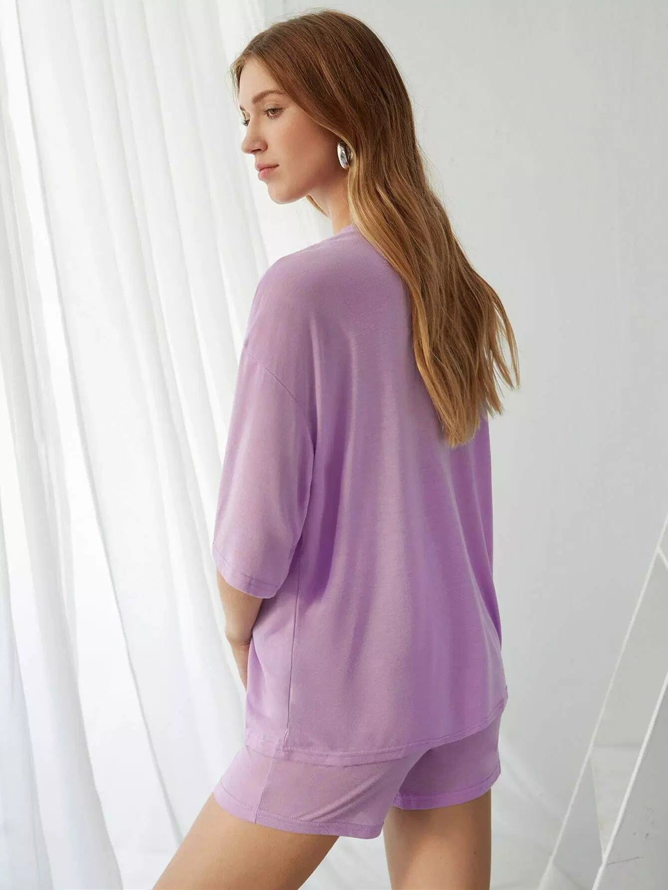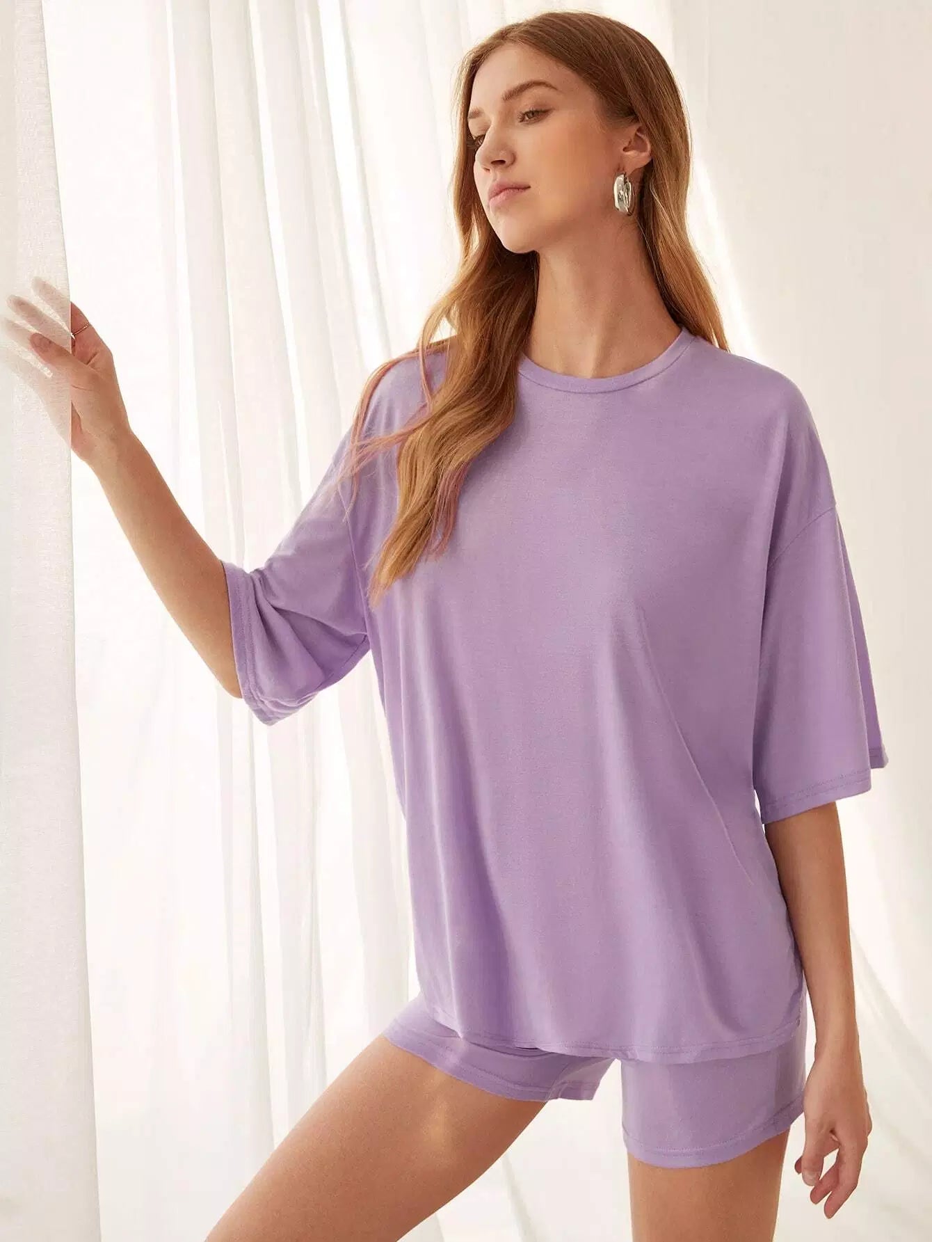 طقم تي شيرت بأكتاف منسدلة بقصّة طويلة وشورت قصير