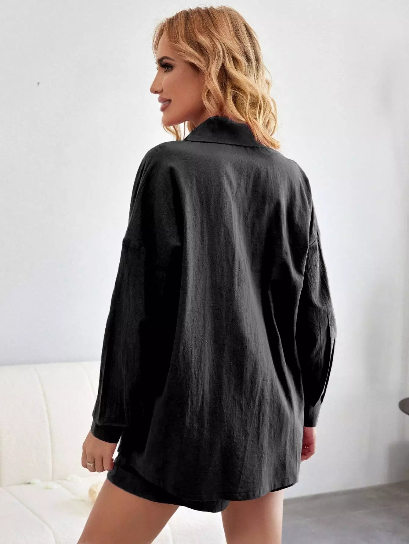 بلوزة منسدلة الكتفين مرقعة بجيب منسدل وشورت بحافة مطوية