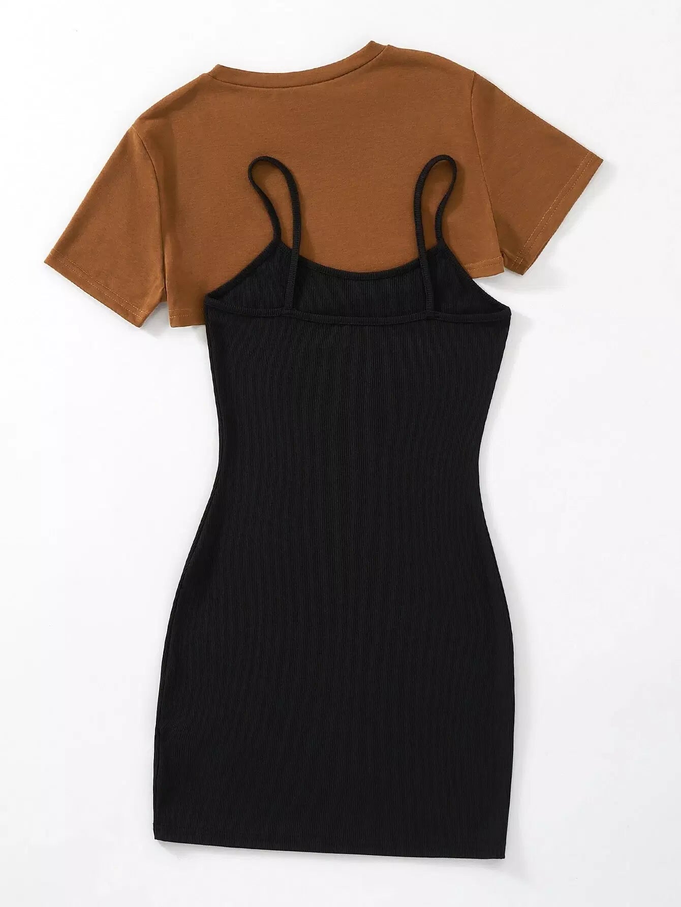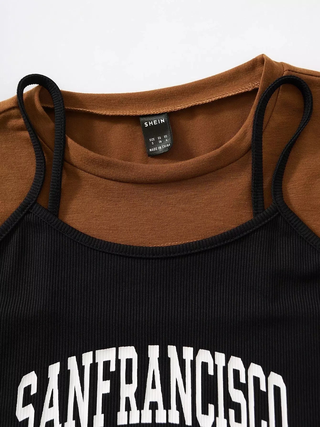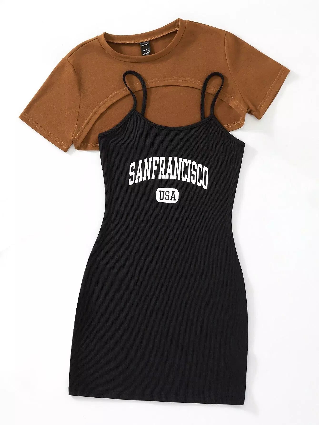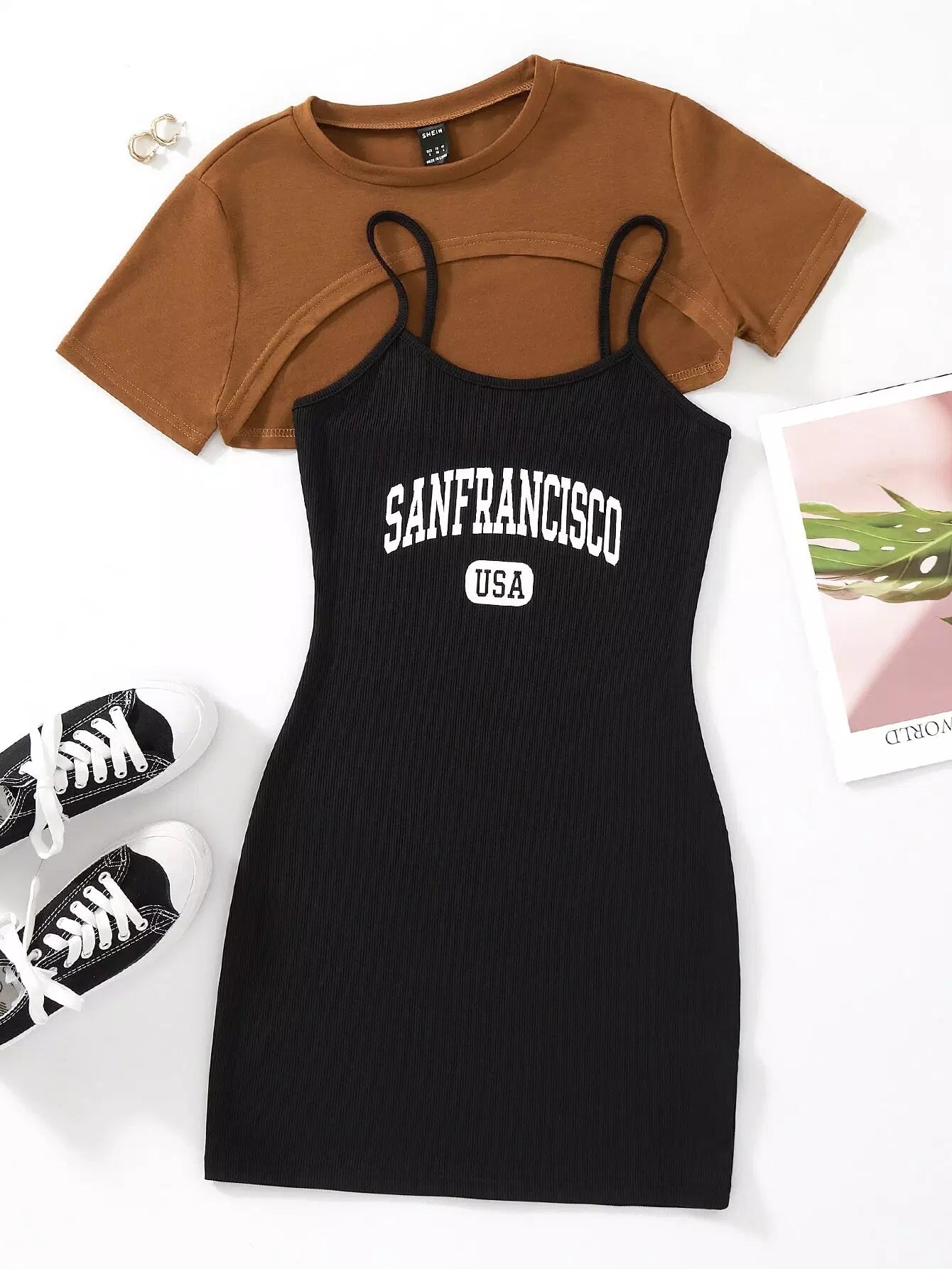 تي شيرت بحافة عالية منخفضة منخفضة وفستان قصير قصير بحافة منخفضة وفستان قصير برسومات حروف