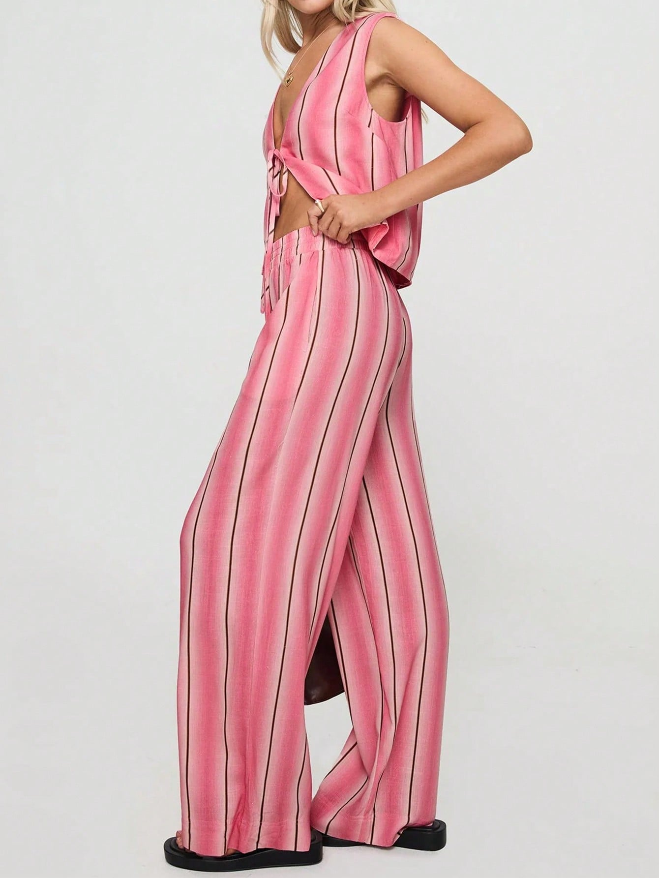 INAWLY 2pcs Women Summer Stripe Front Tie Vest And Loose Casual Pants Set