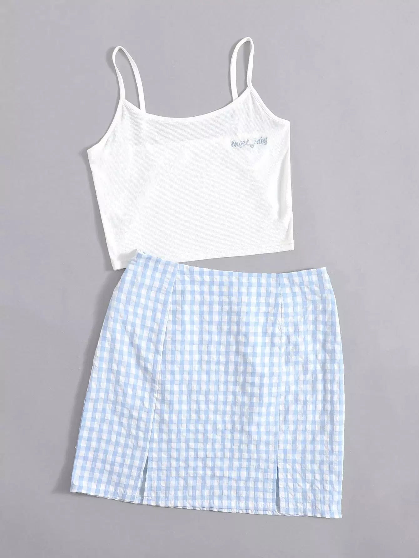 قميص قصير مزين بتطريزات حروف وتنورة قطنية منقسمة