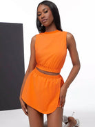 طقم تانك بدون أكمام برتقالي نيون وطقم سروال قصير ملفوف من الأمام