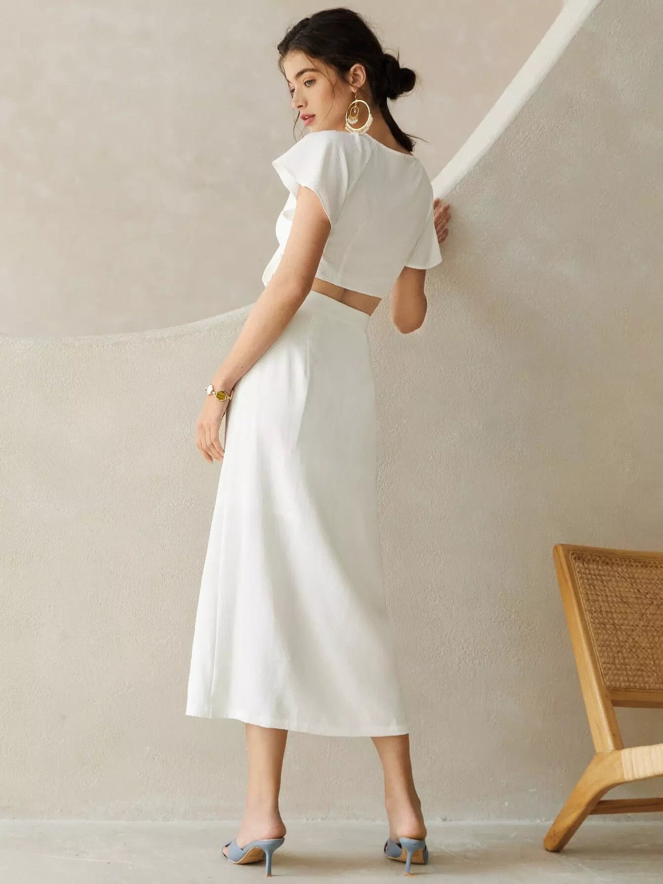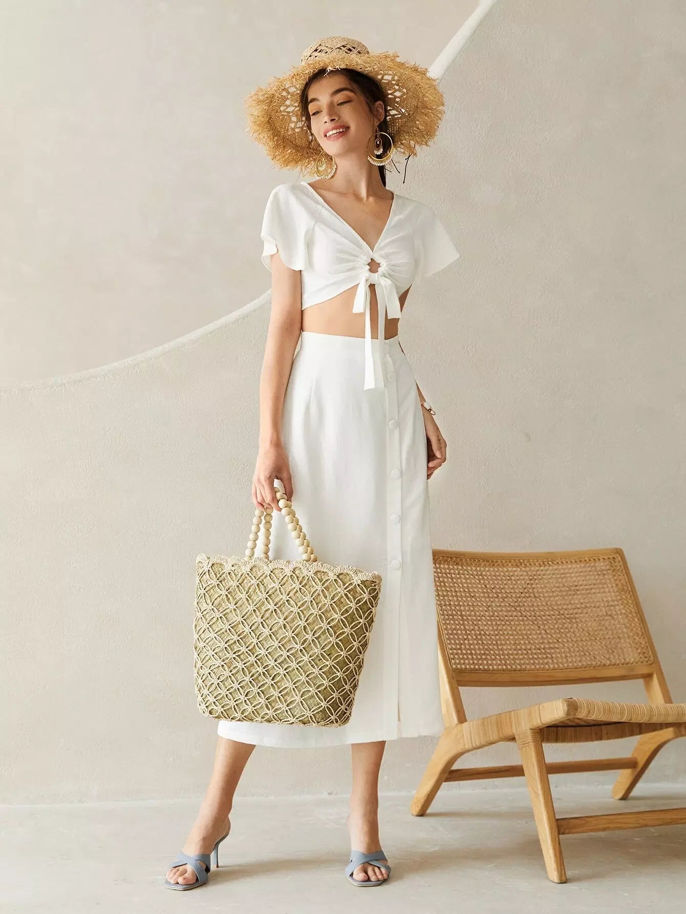 طقم بلوزة برباط على شكل حلقة على شكل حرف O مع تنورة بأزرار أمامية