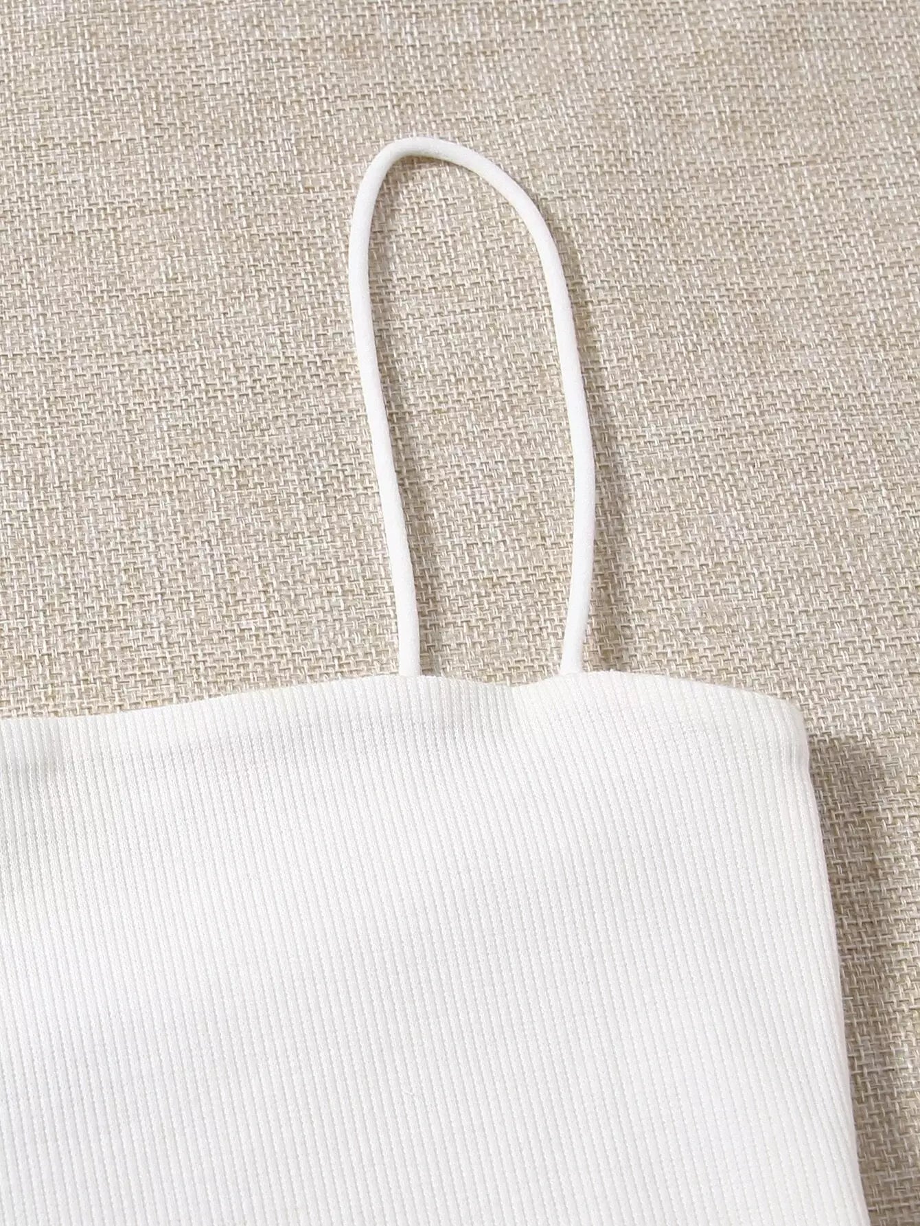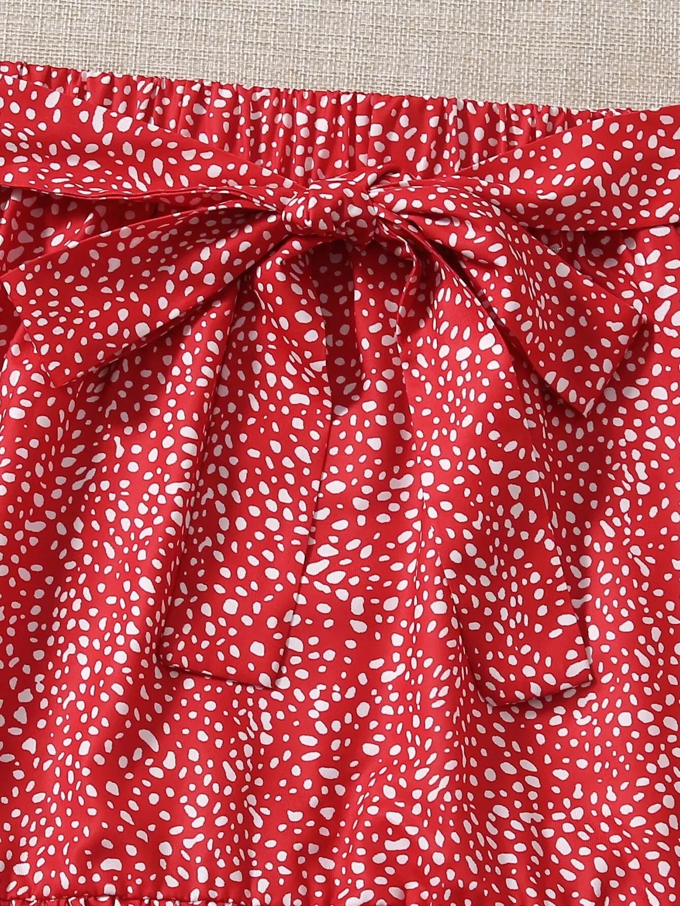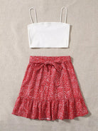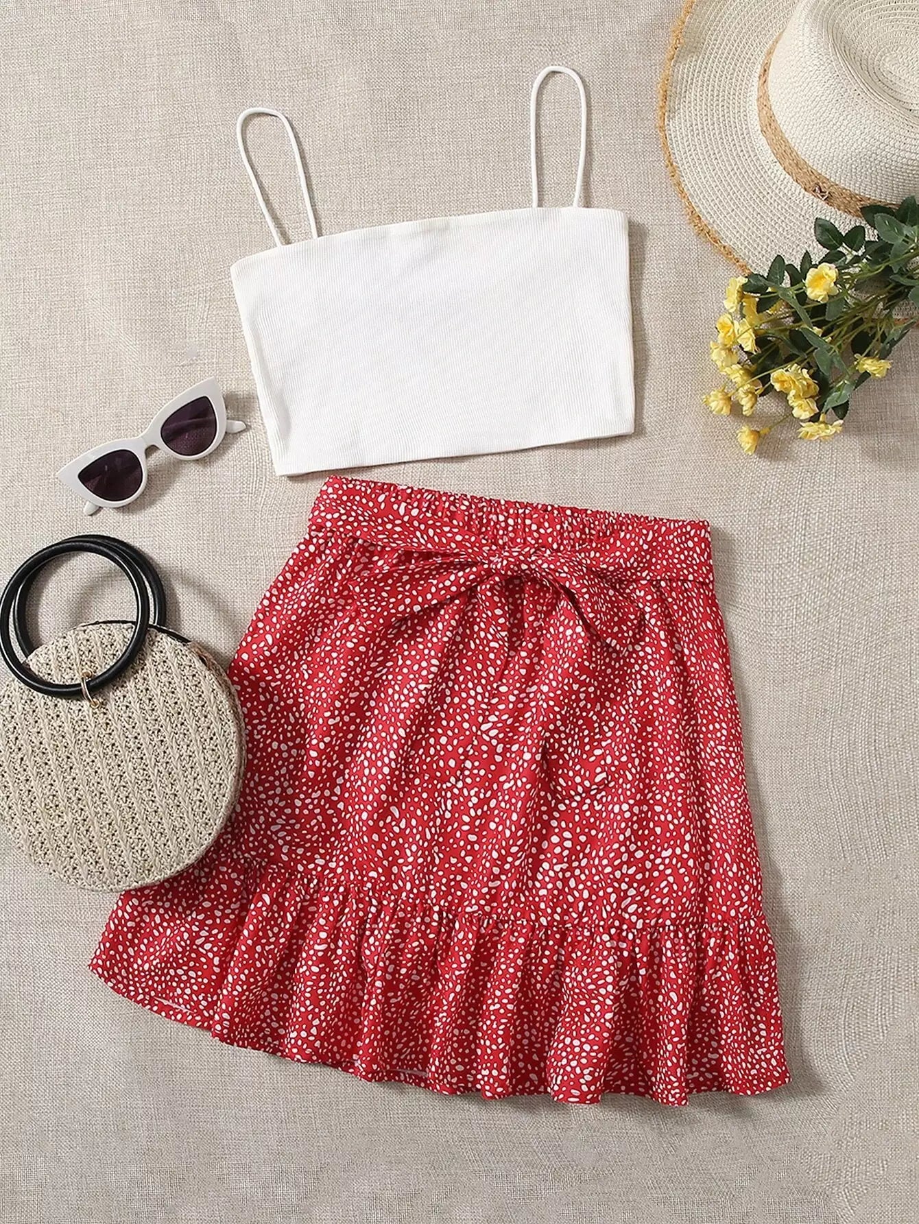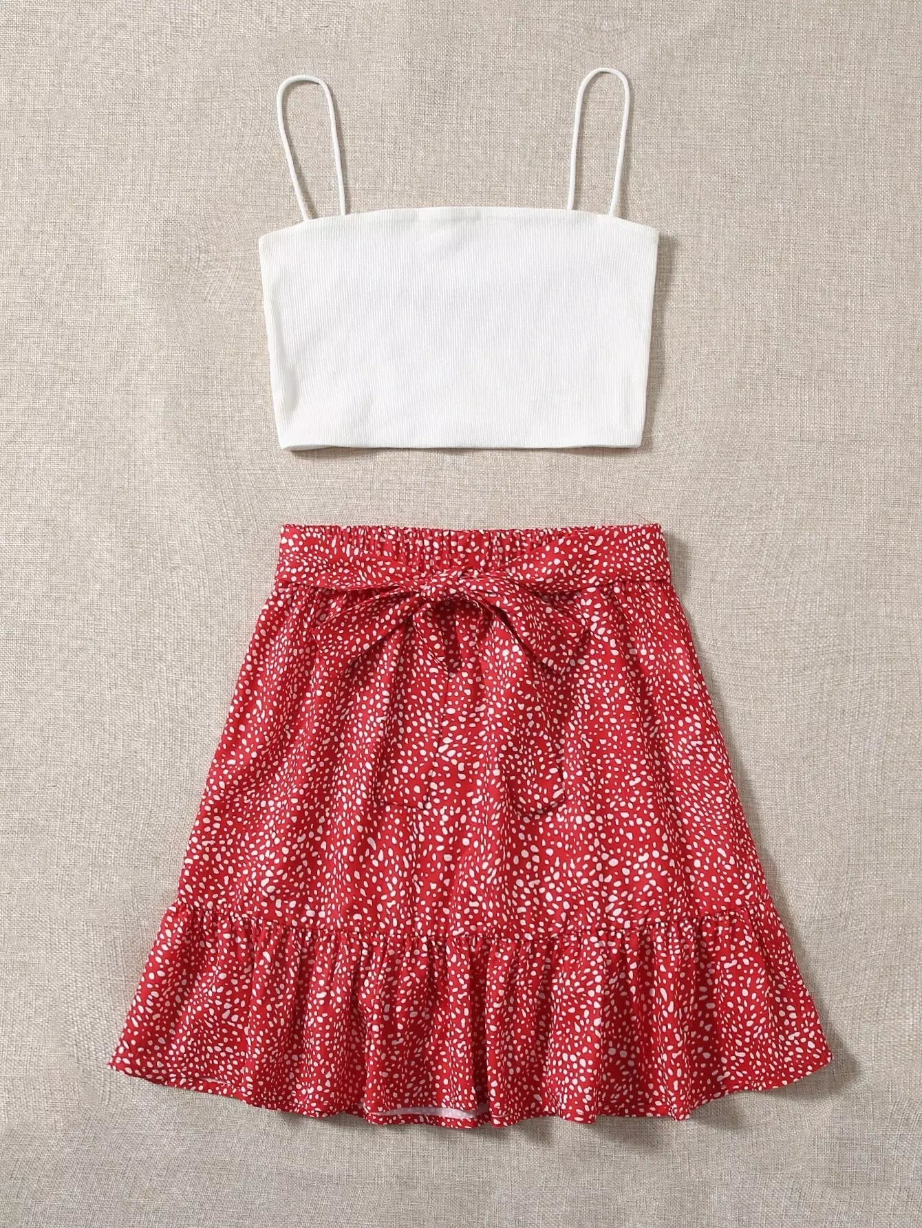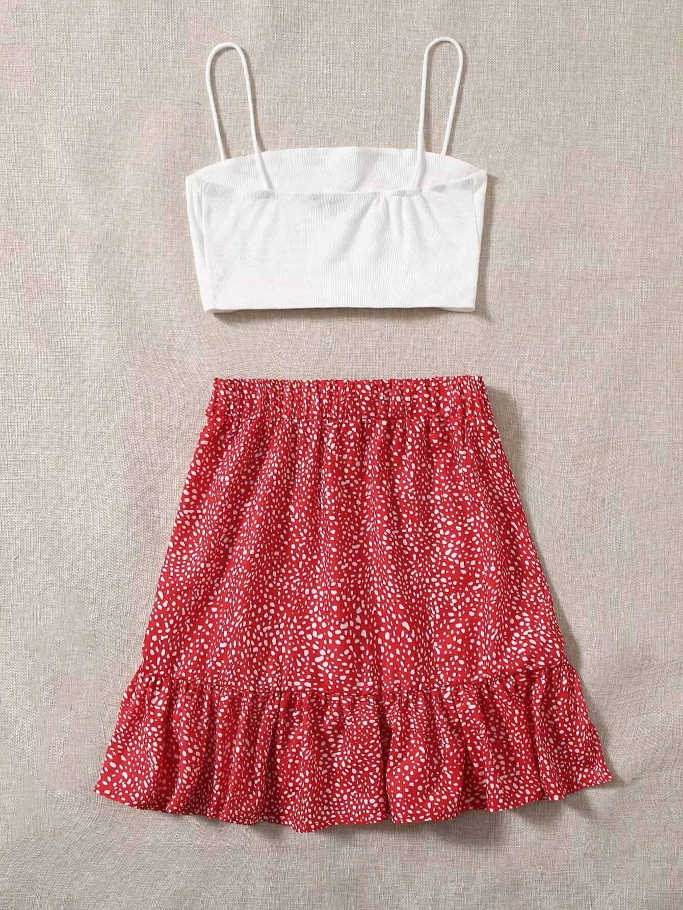 طقم قميص كامي قصير مضلع متماسك وتنورة دلماسية بحاشية مكشكشة بدون حزام