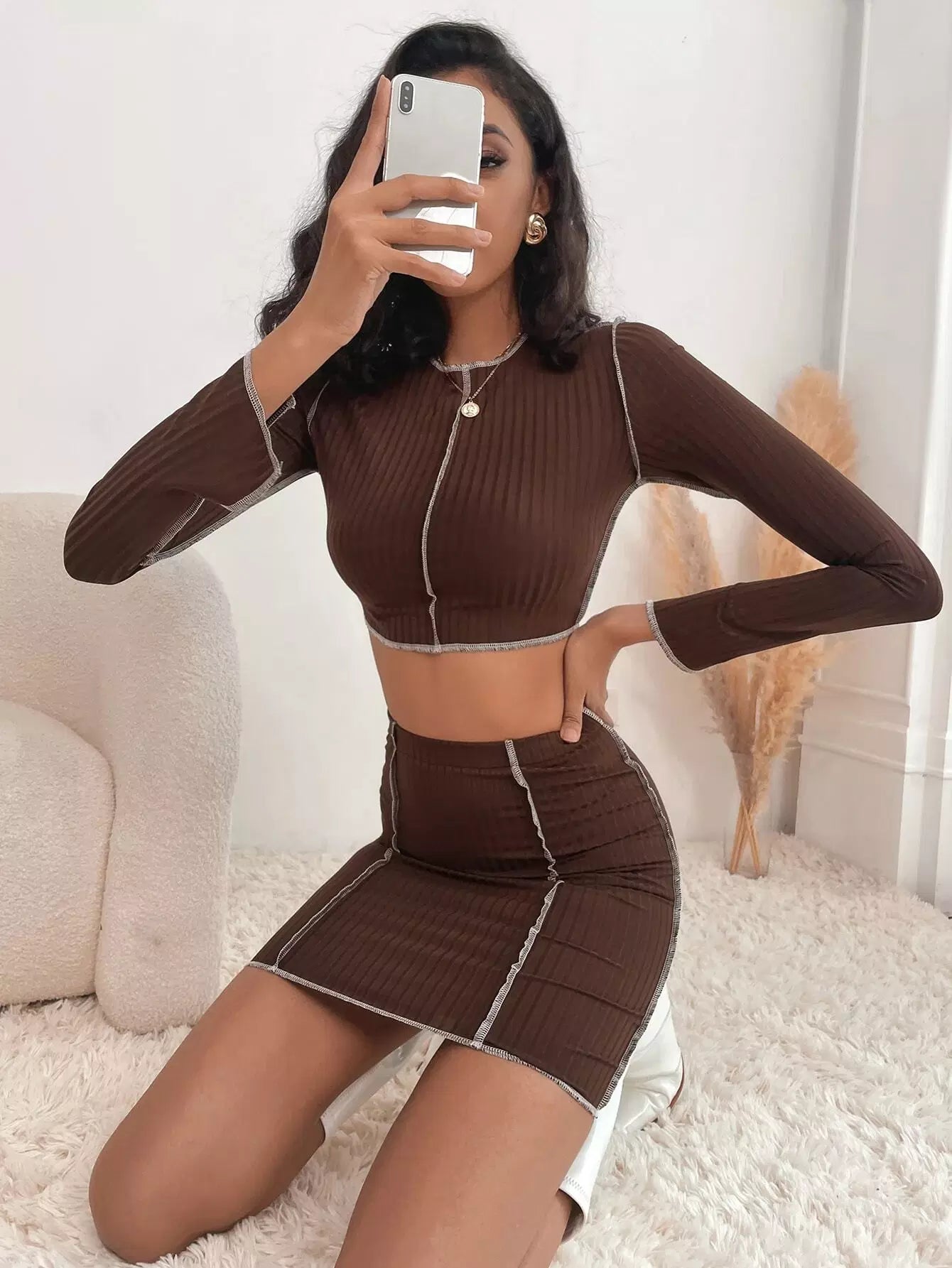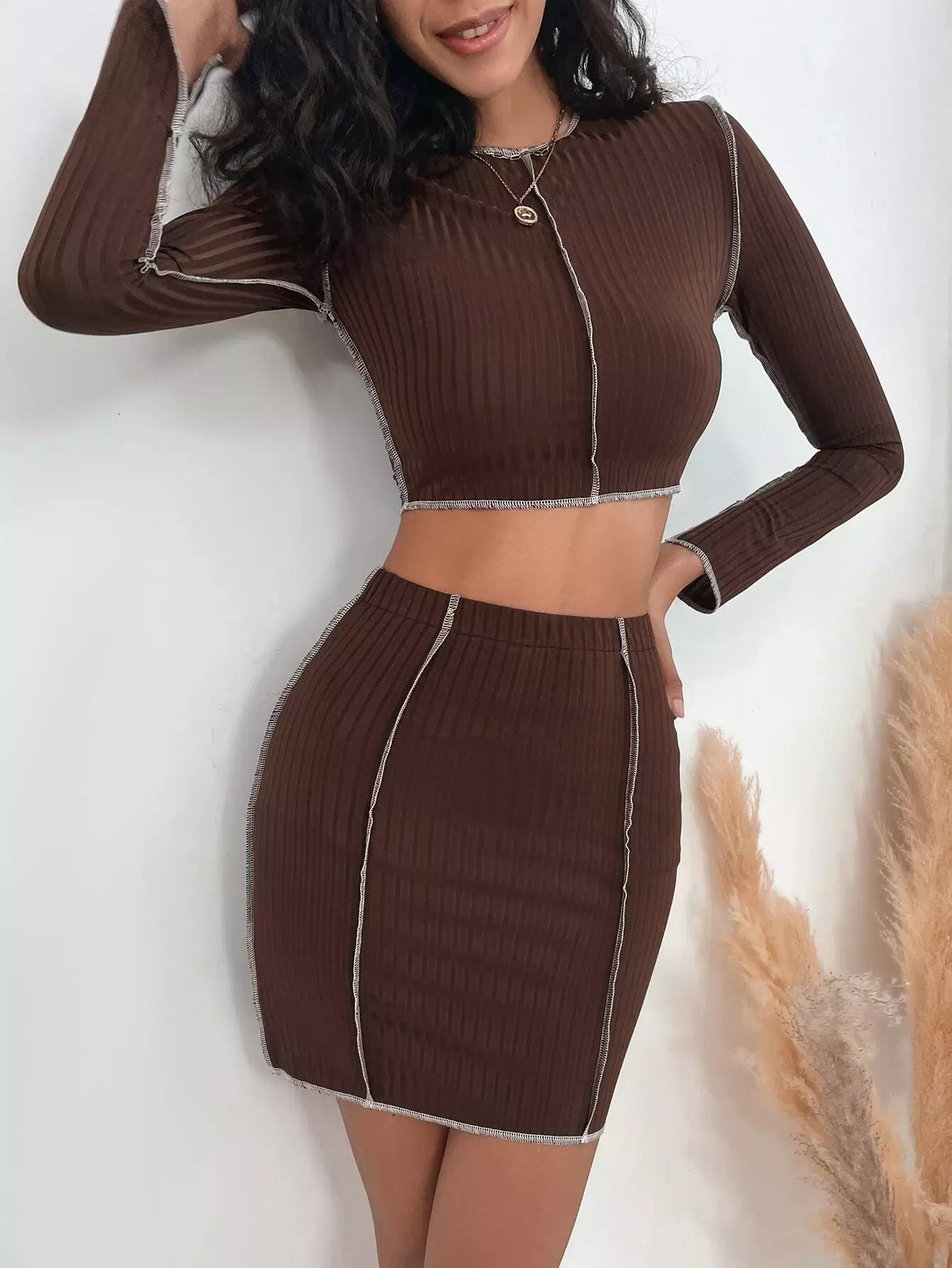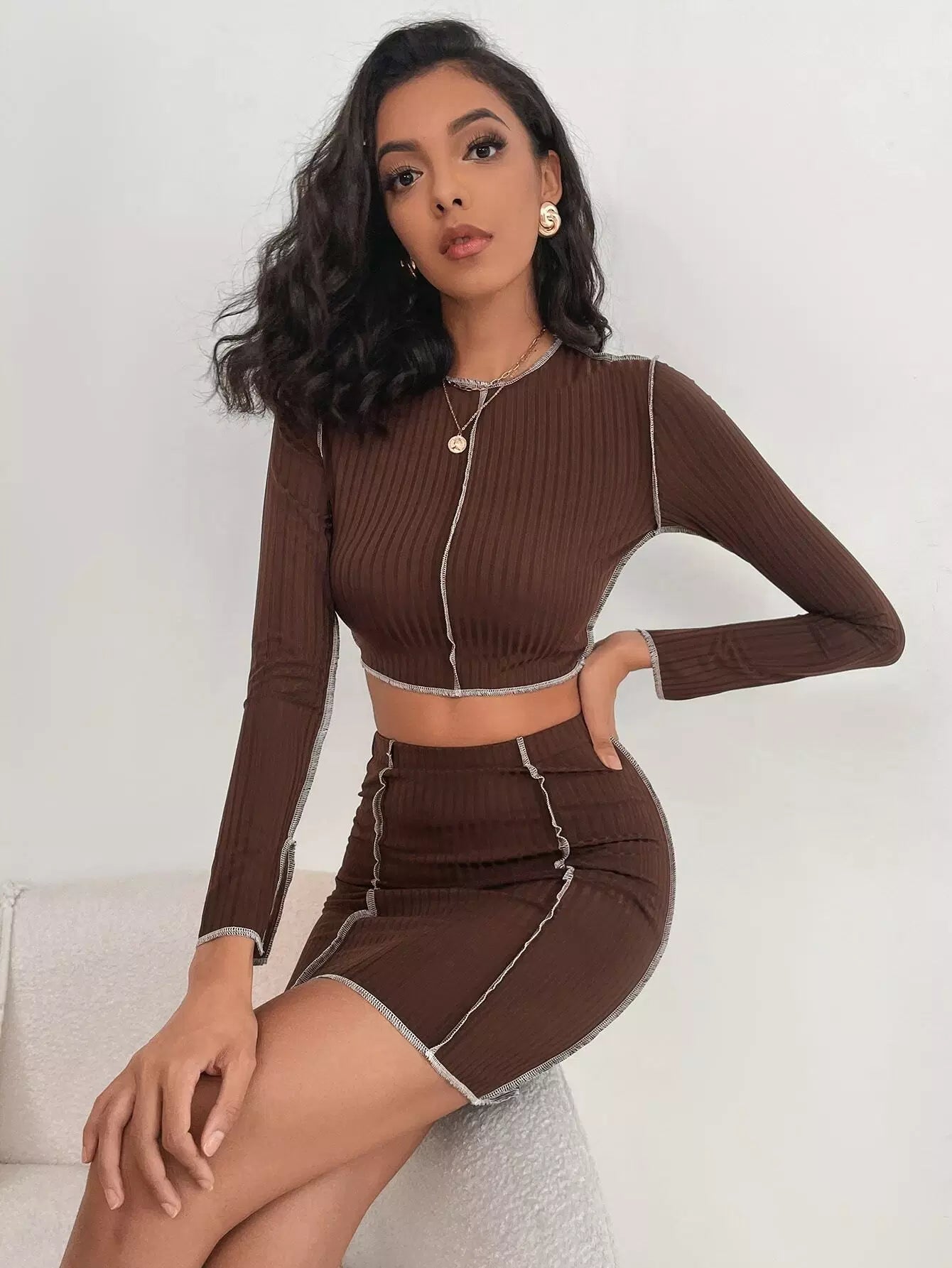النساء - بلوزة قصيرة وتنورة منسوجة بخياطة مضلعة