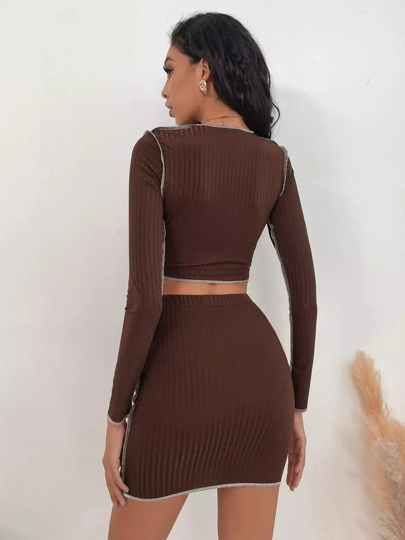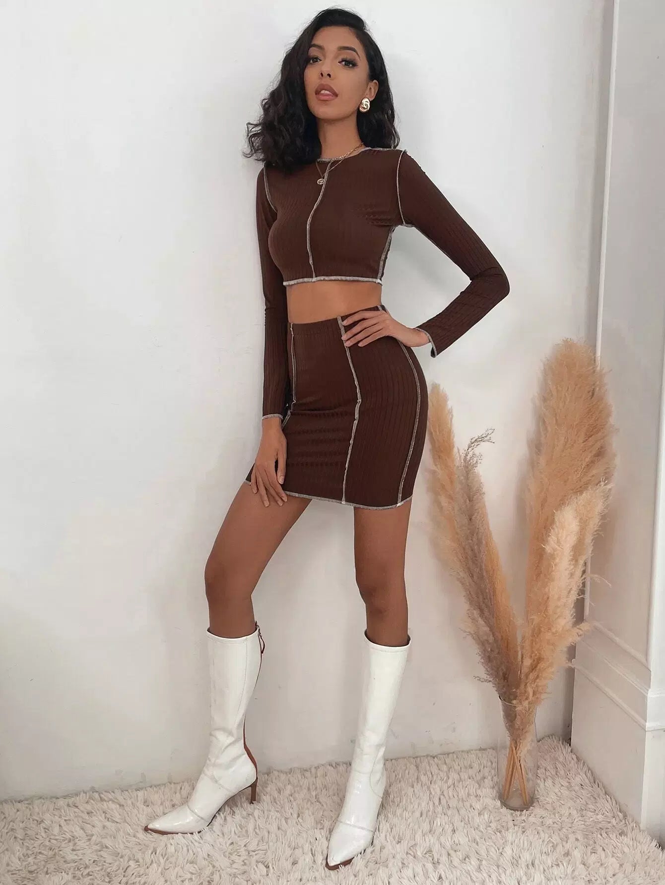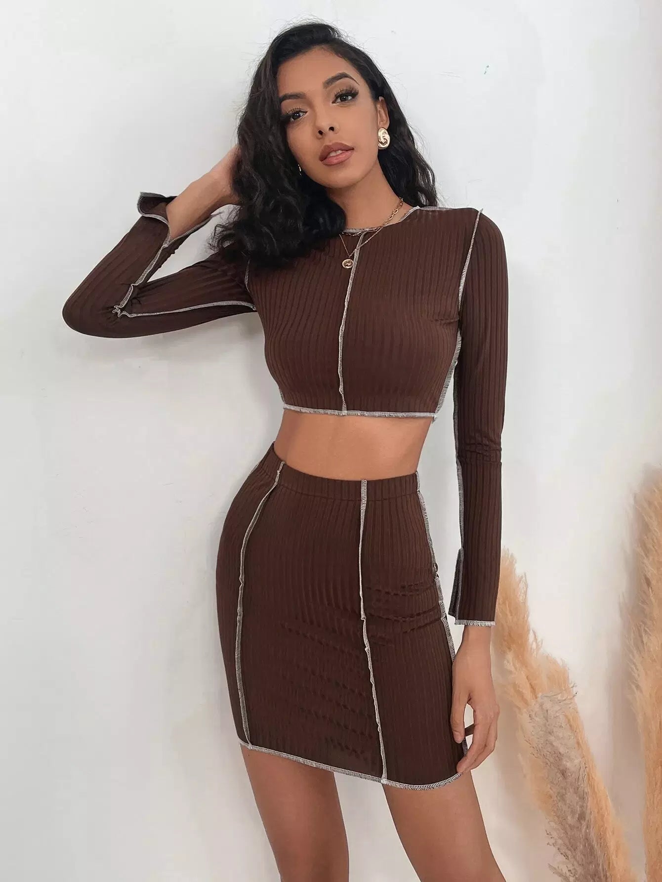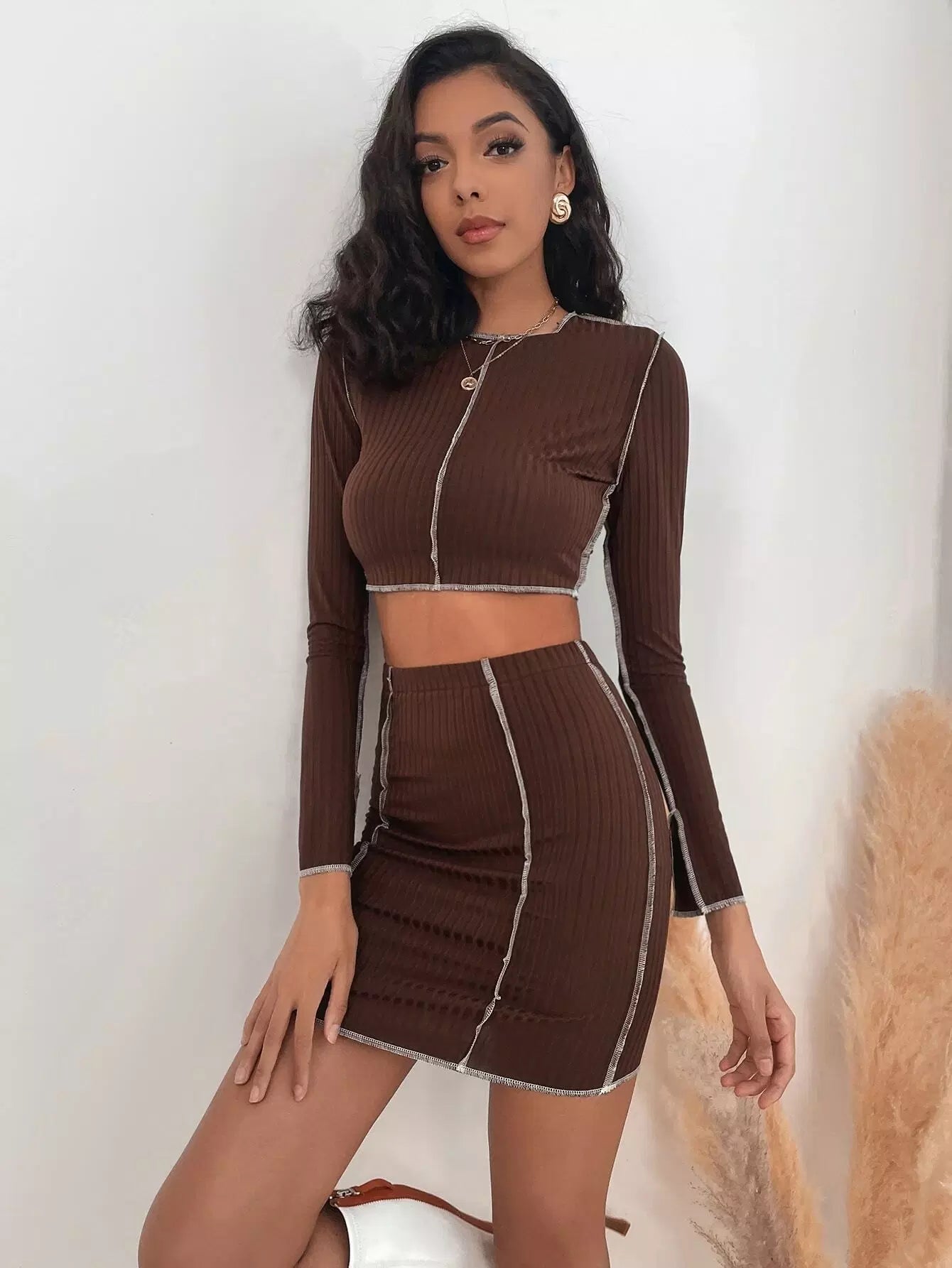 النساء - بلوزة قصيرة وتنورة منسوجة بخياطة مضلعة