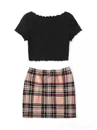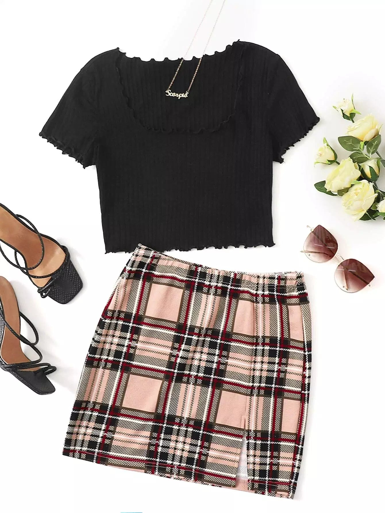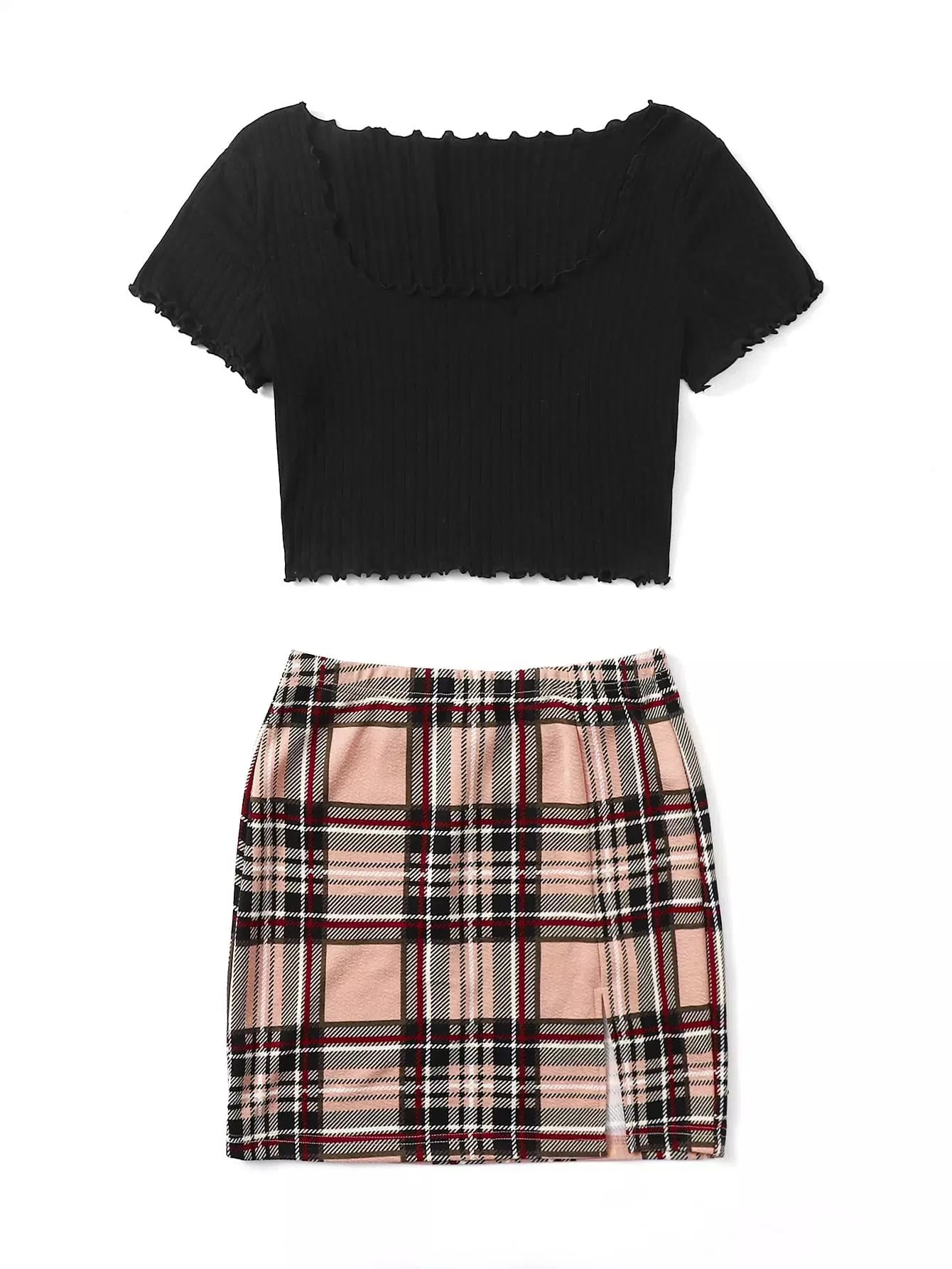 طقم تي شيرت قصير بياقة دائرية بياقة دائرية بياقة دائرية مع تنورة منقوشة بحافة منقسمة