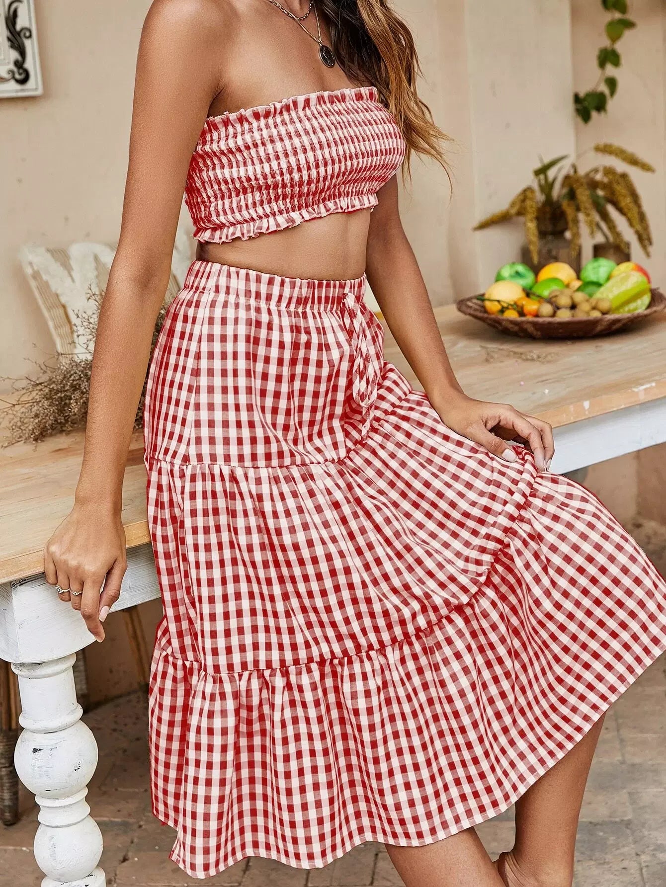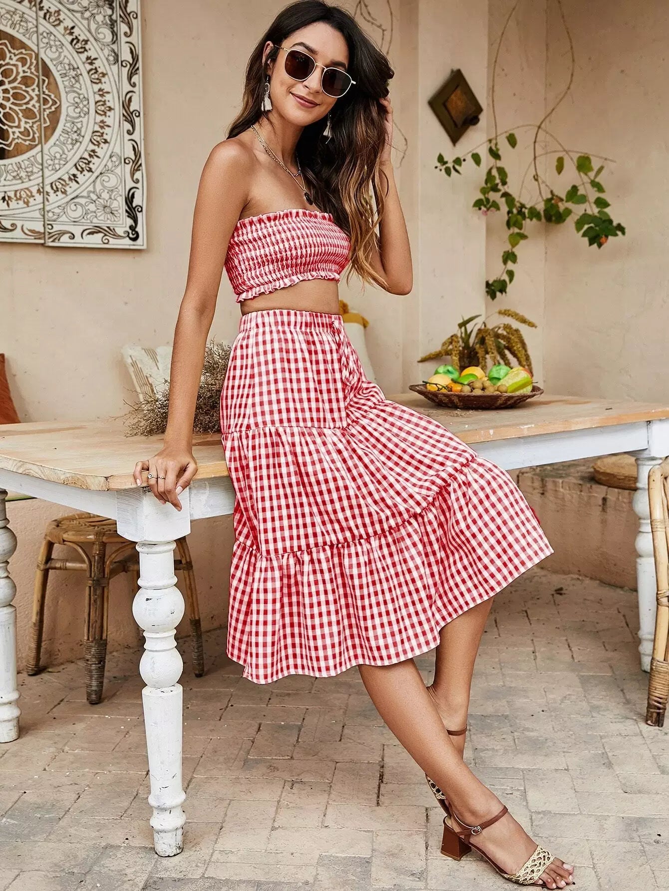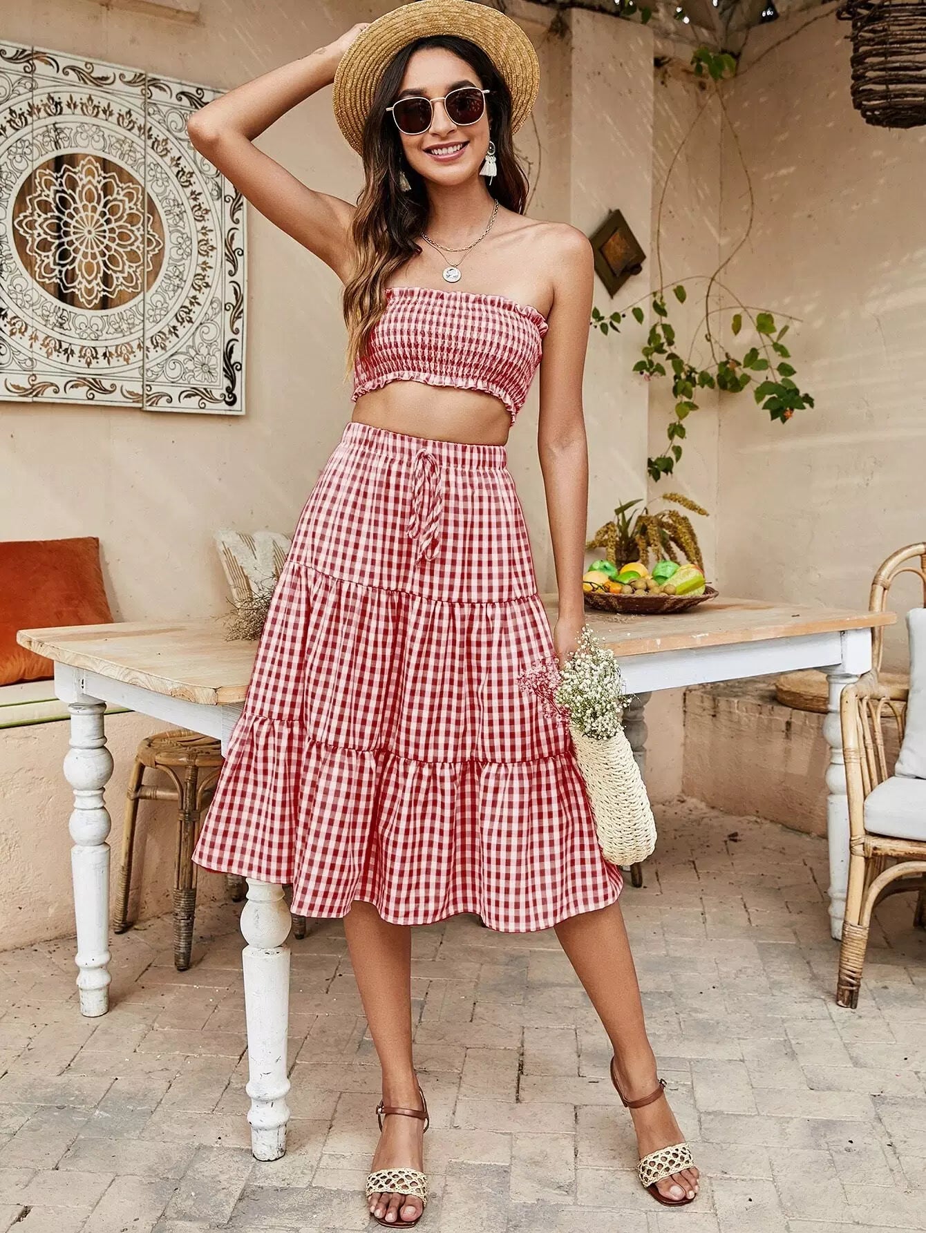 طقم بلوزة أنبوبي من القماش القطني بشريط قطني مع تنورة بطبقات