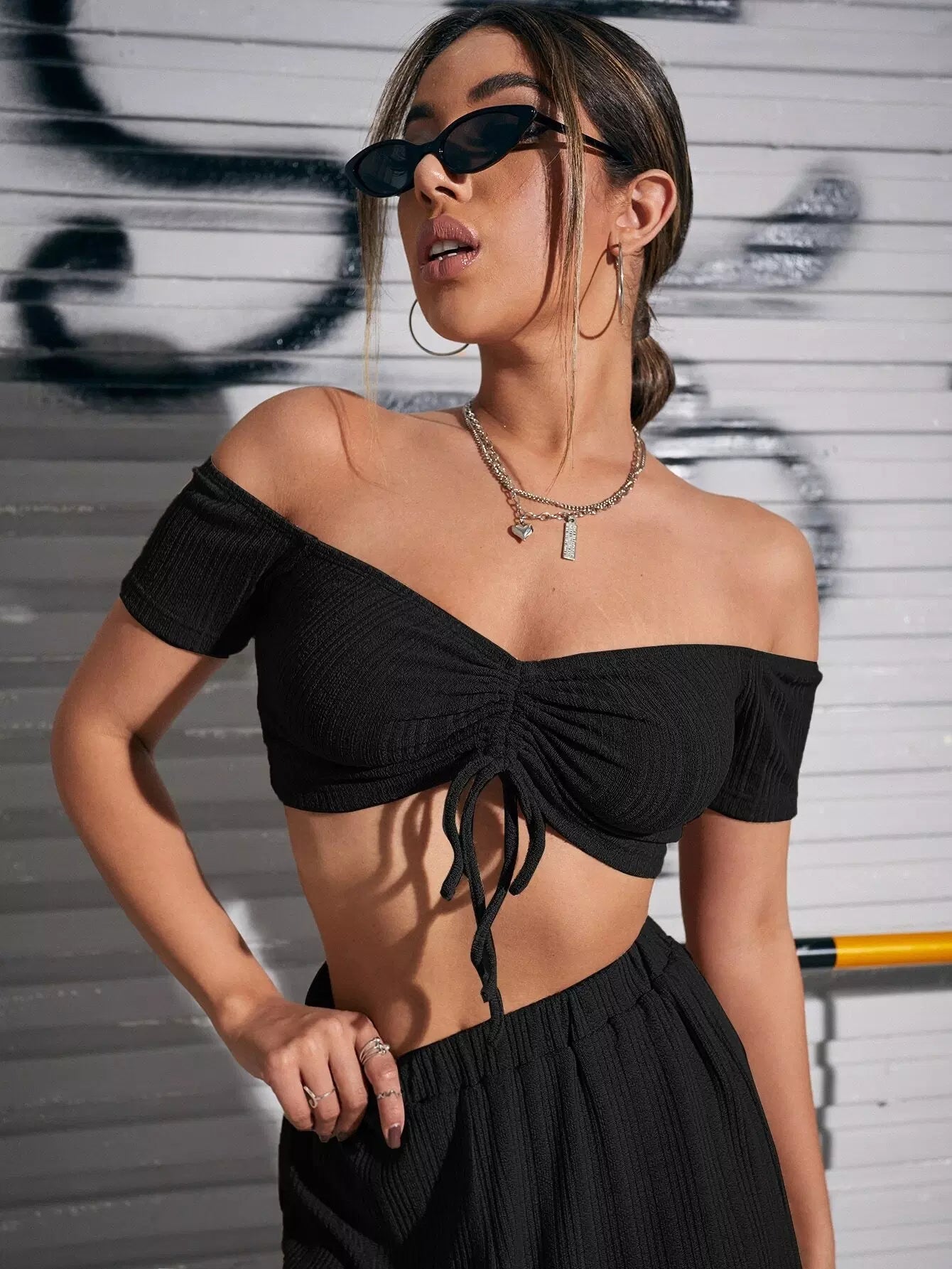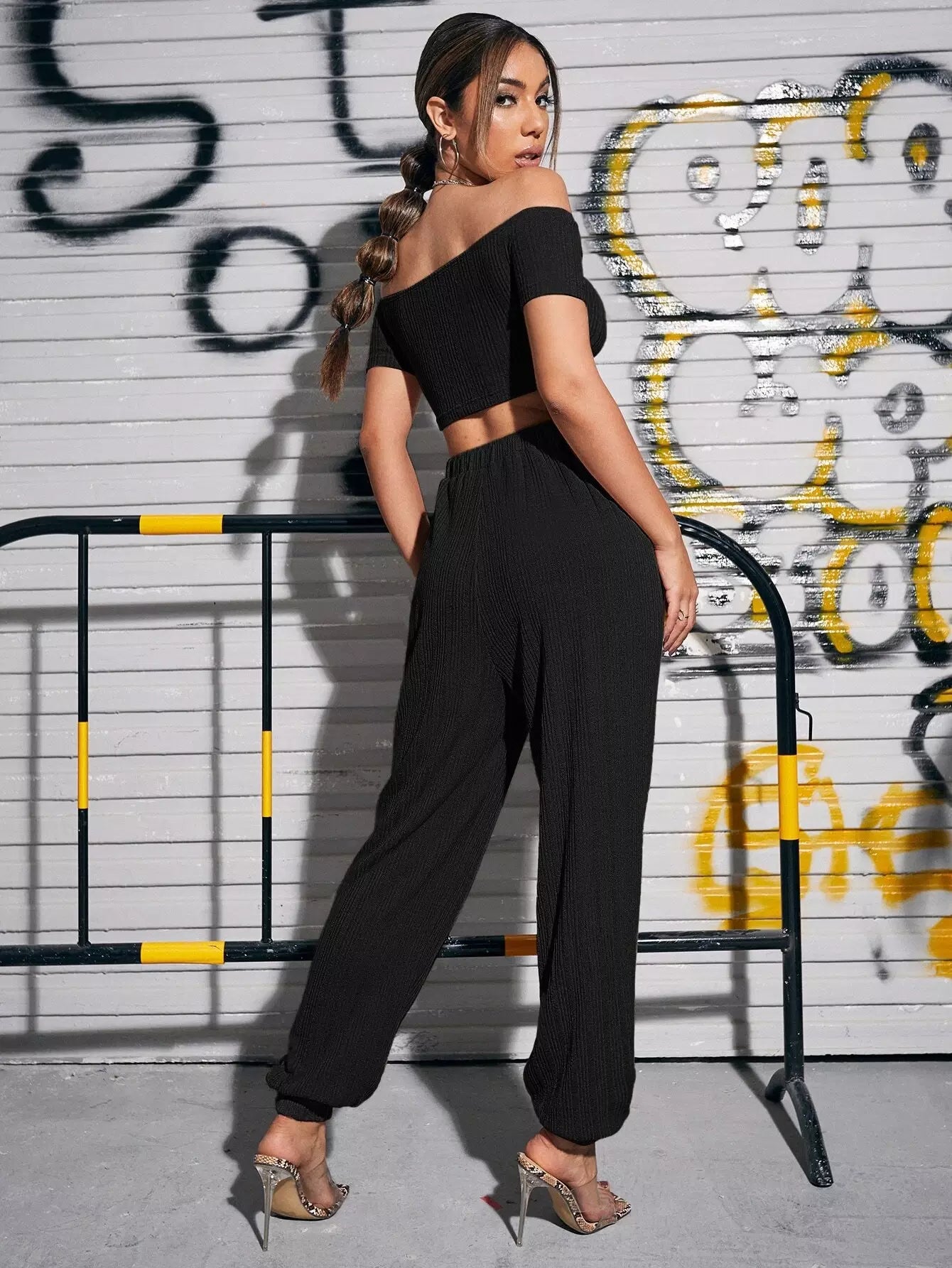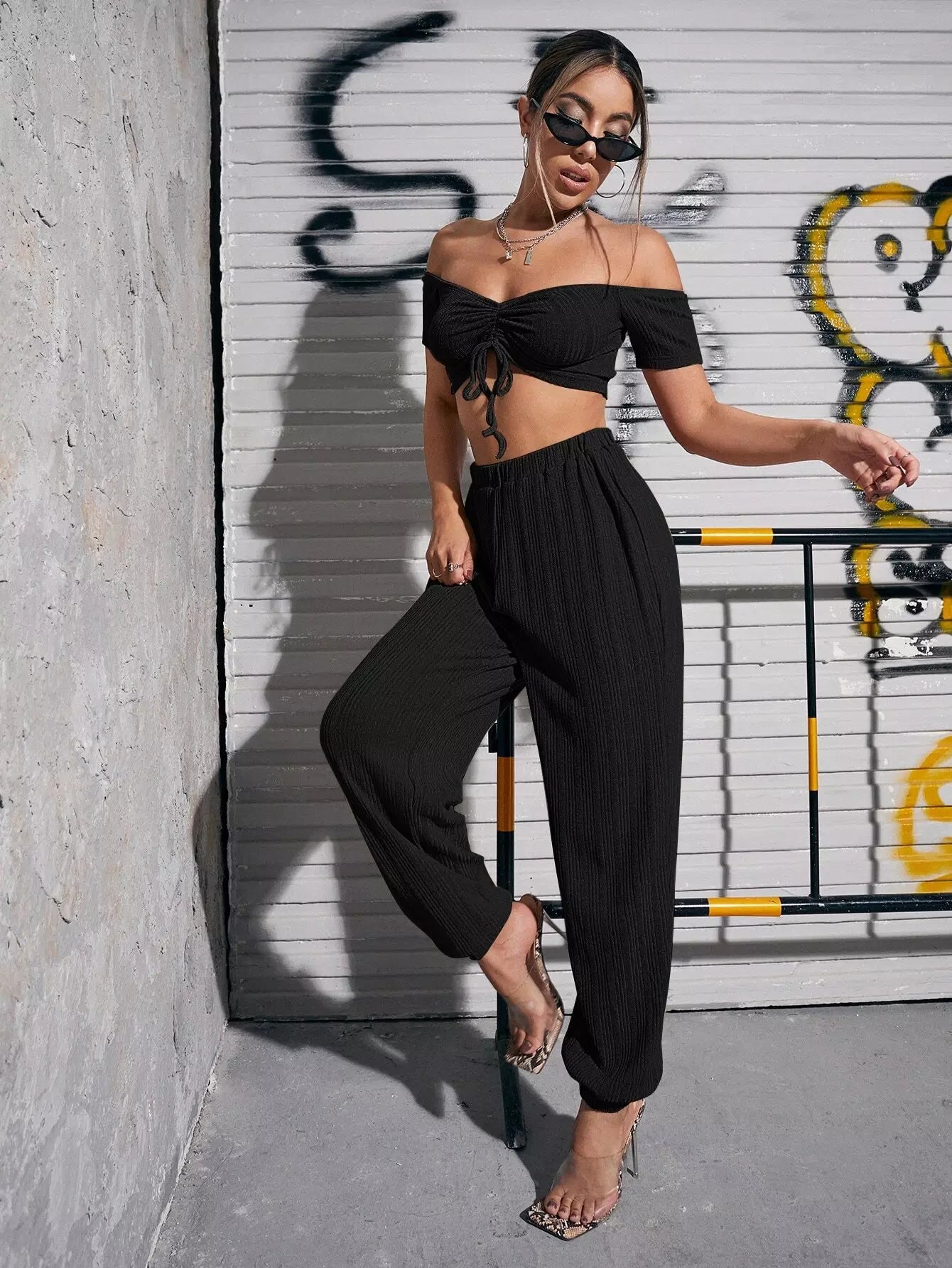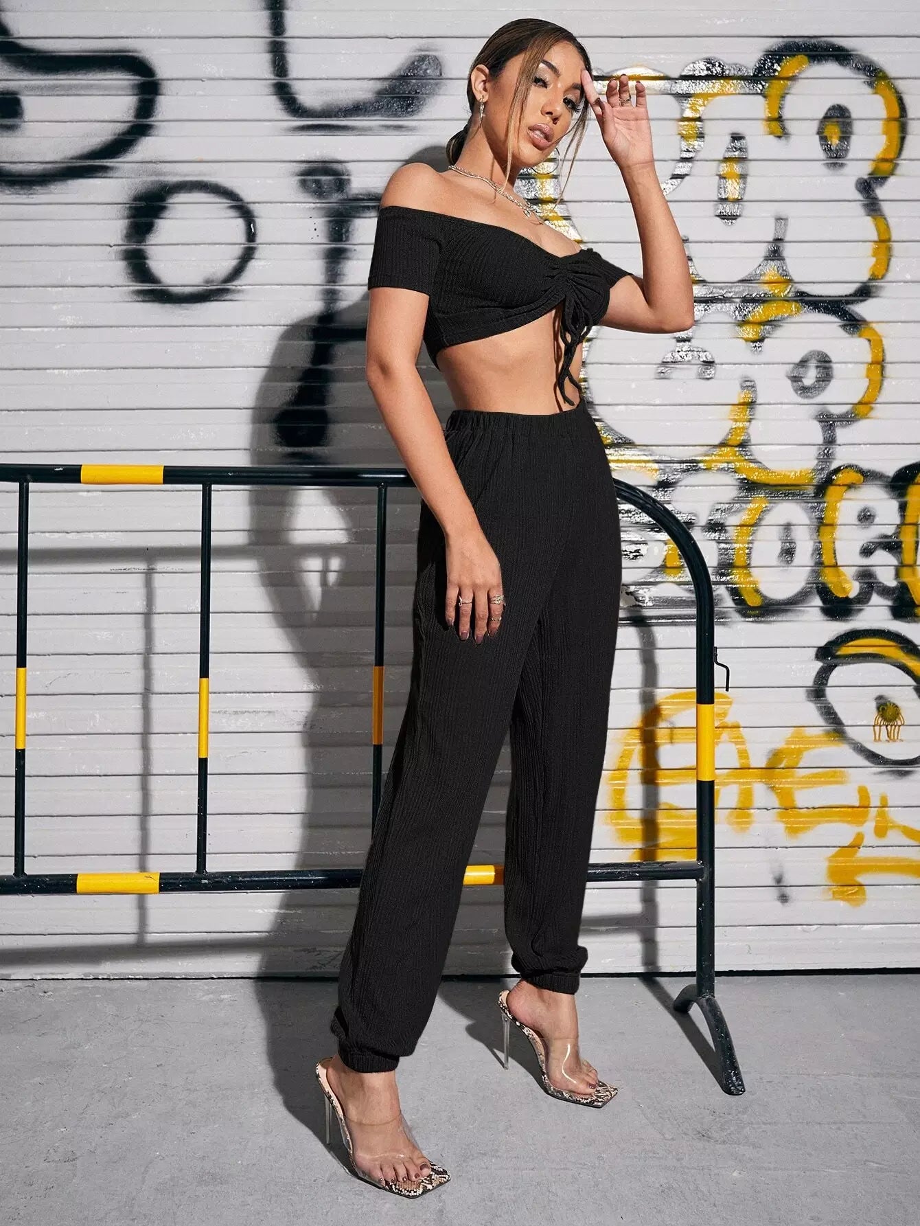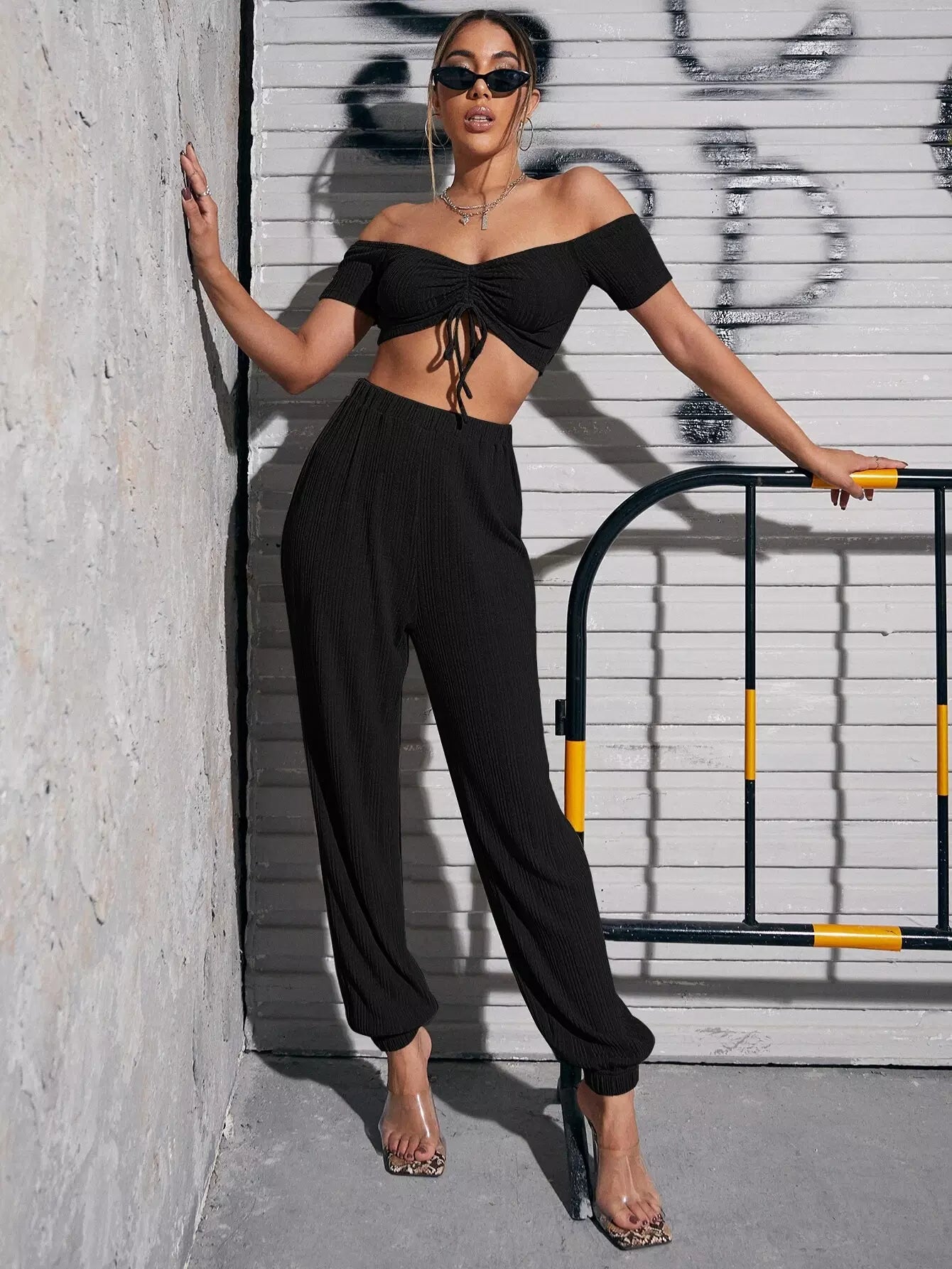 طقم بلوزة وبنطلون رياضي محبوك برباط سادة برباط مضلع محبوك