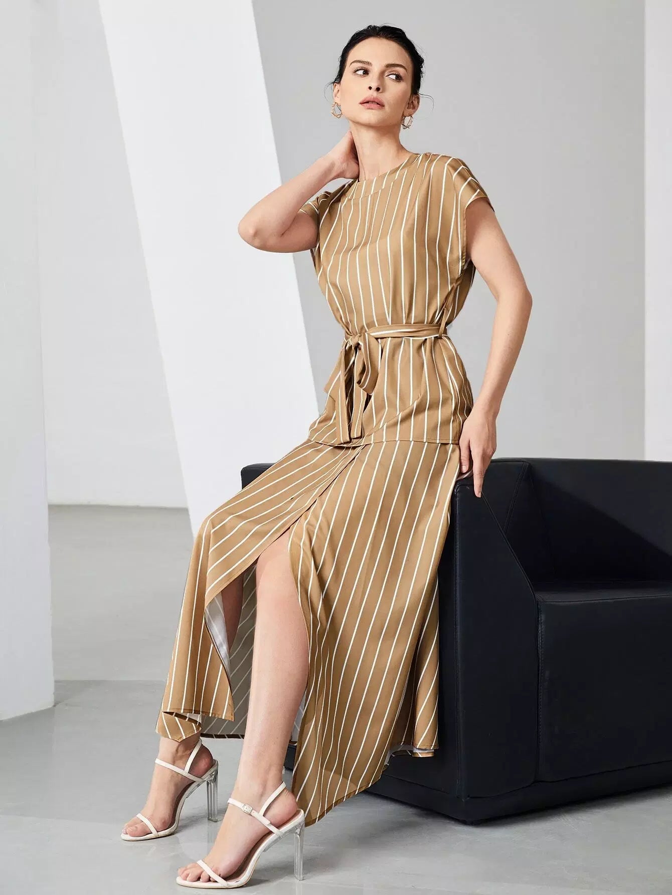 للنساء - بلوزة مخططة برباط ذاتي وتنورة غير متماثلة