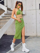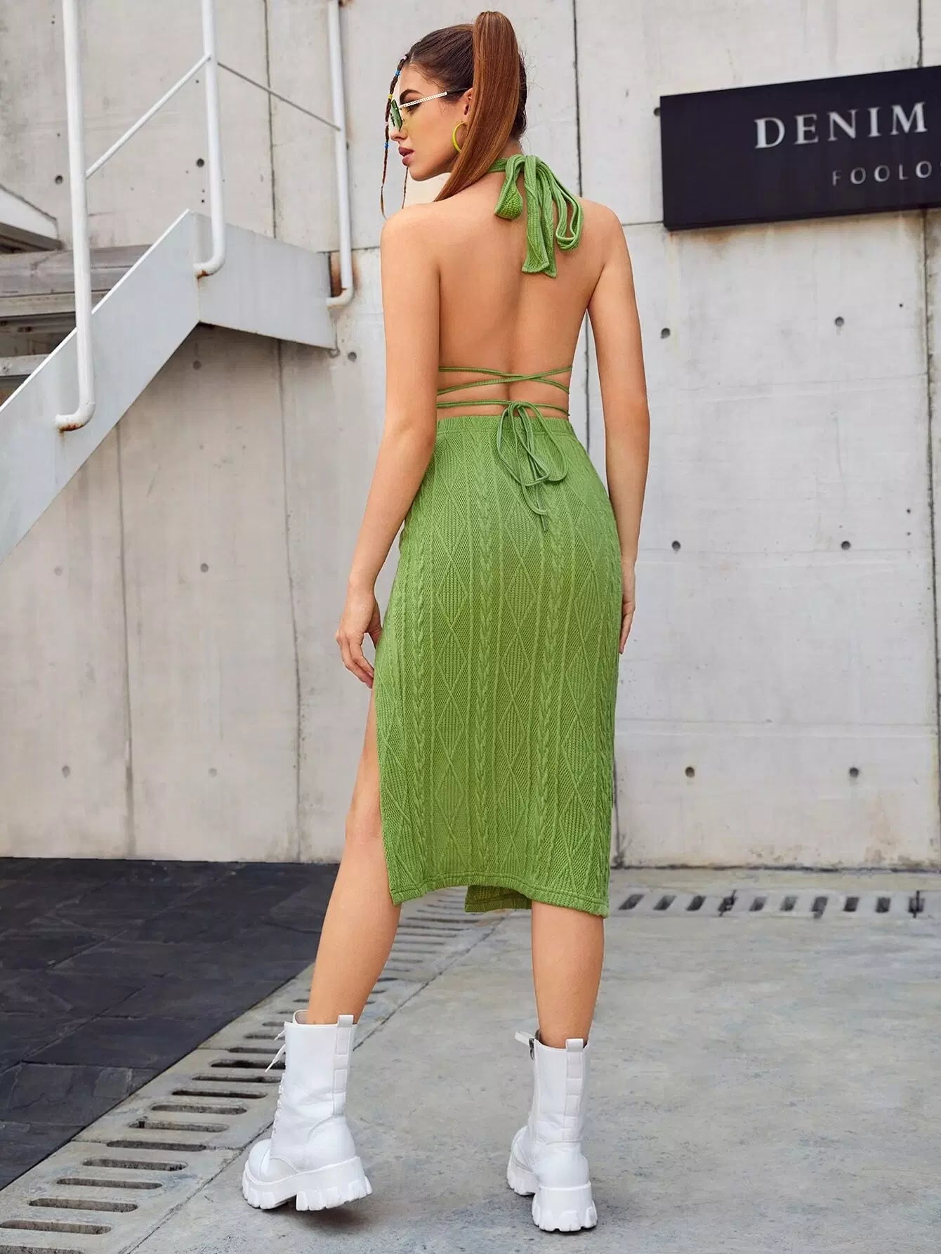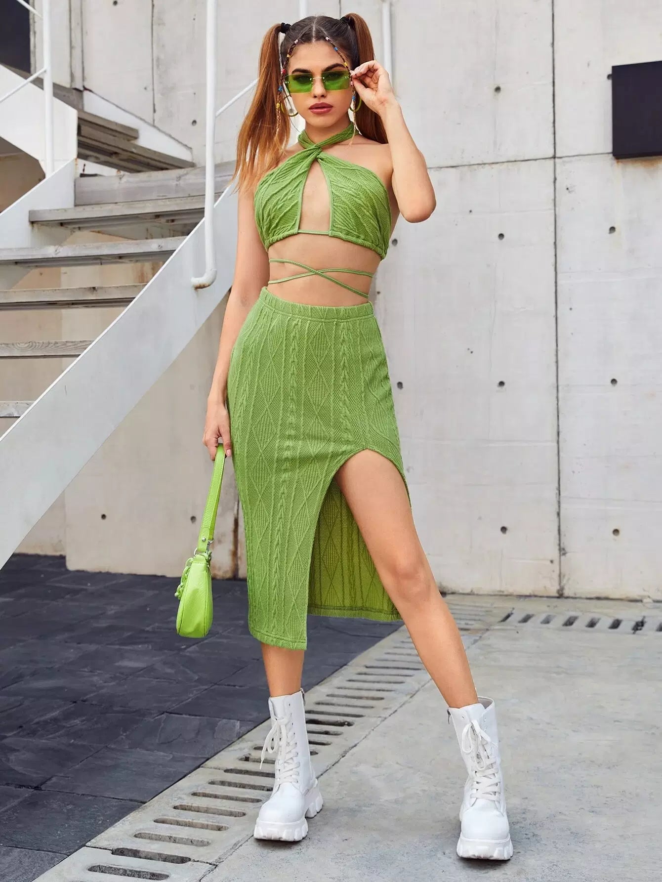 بلوزة بفتحة رسن أمامية ملتوية من الأمام وتنورة فخذين مقسمة برباط متقاطع من الخلف