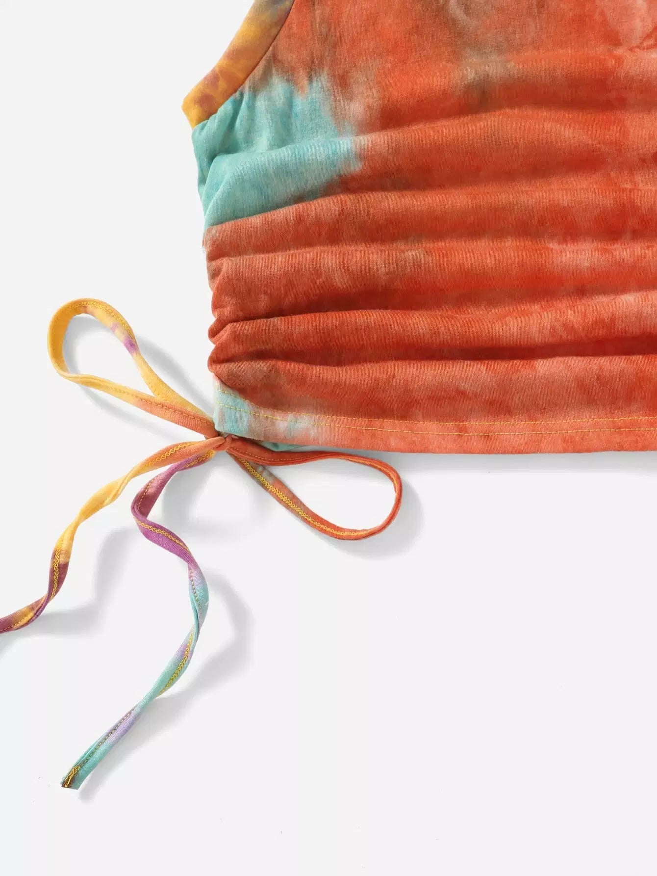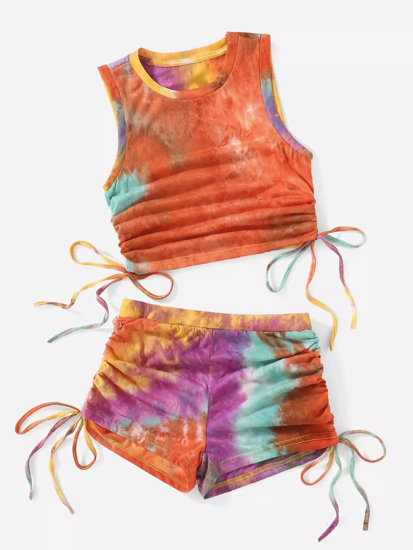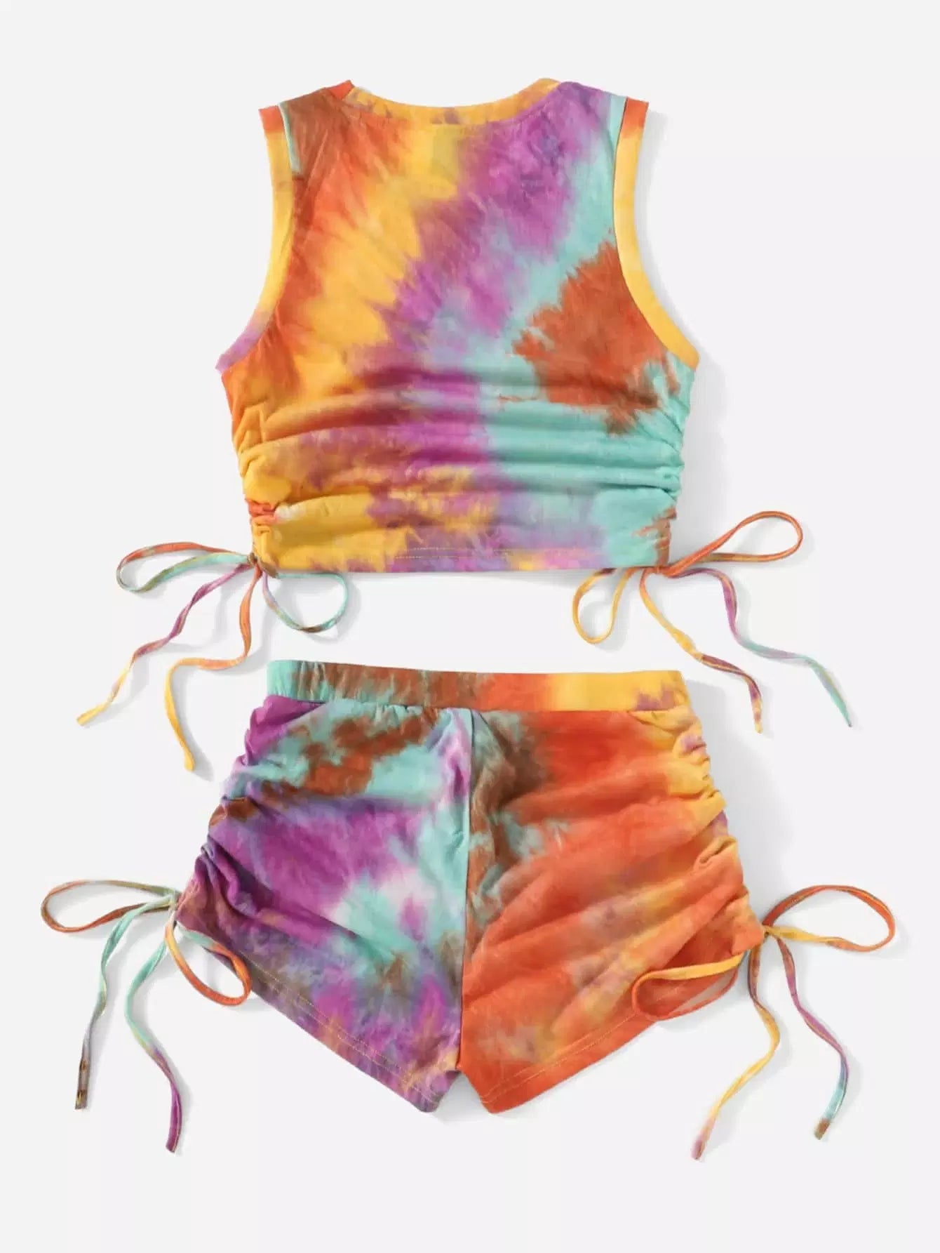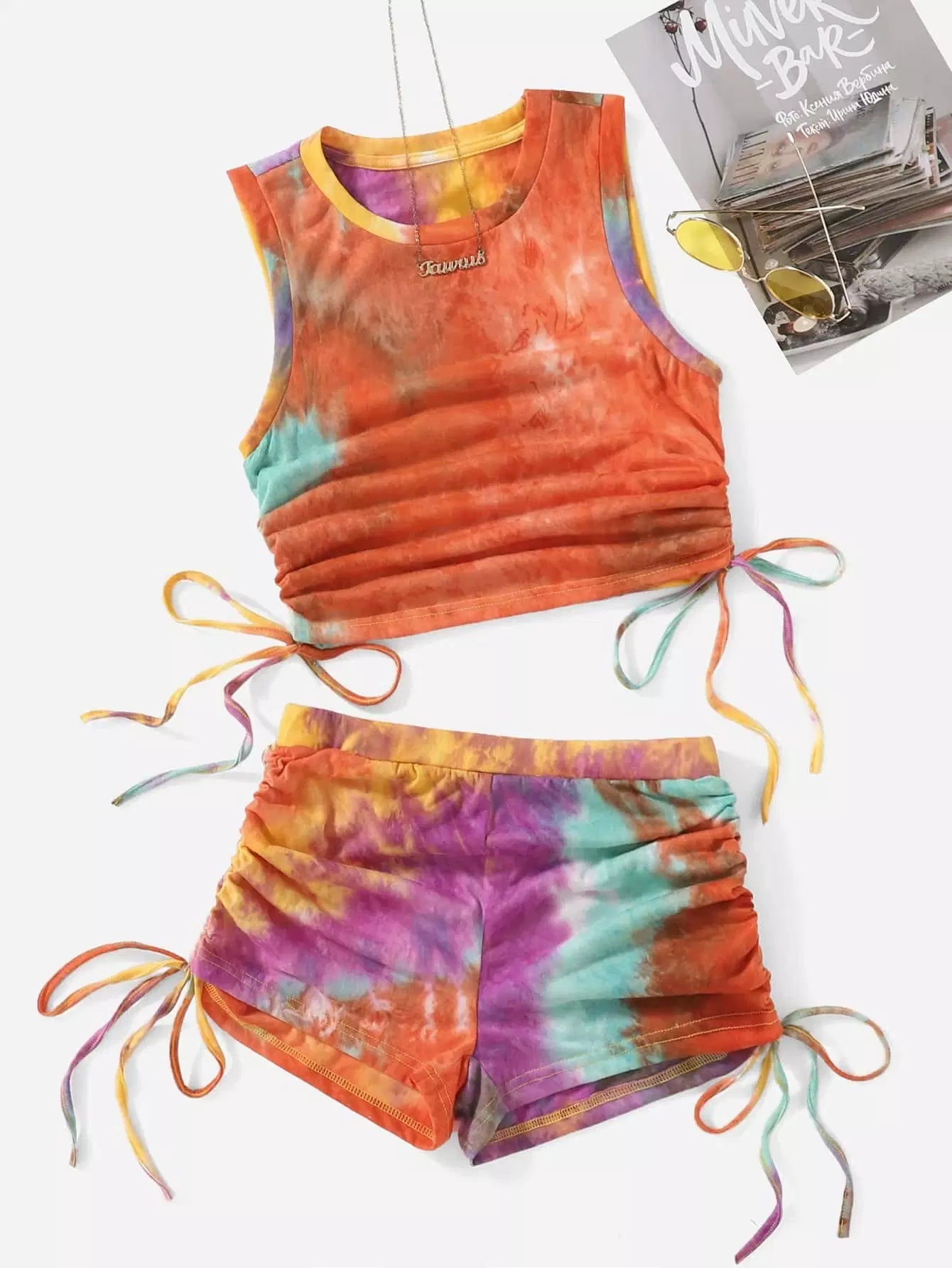 طقم تانك قصير وشورت قصير برباط مربوط برباط مكشكش ذو عقدة جانبية