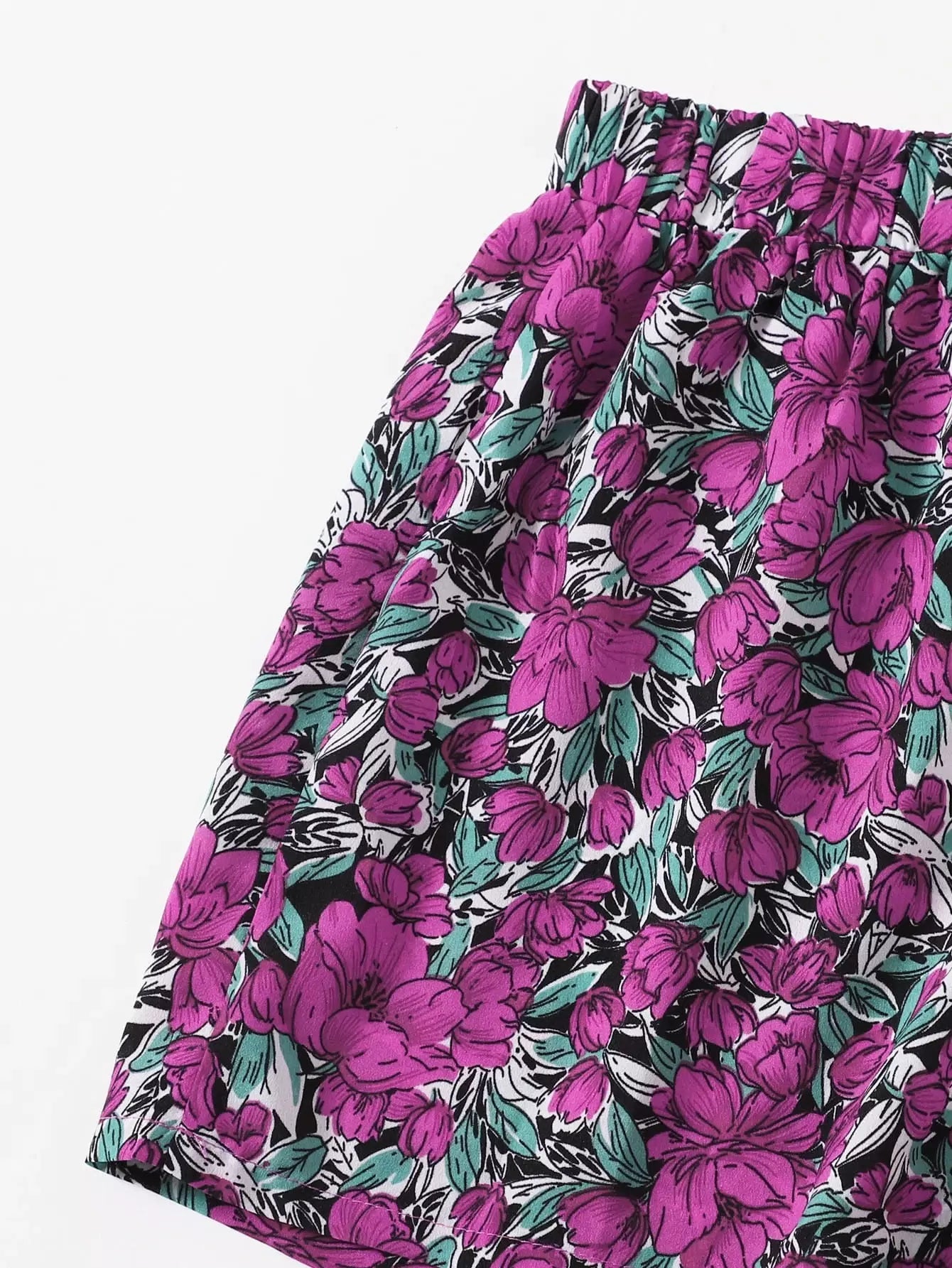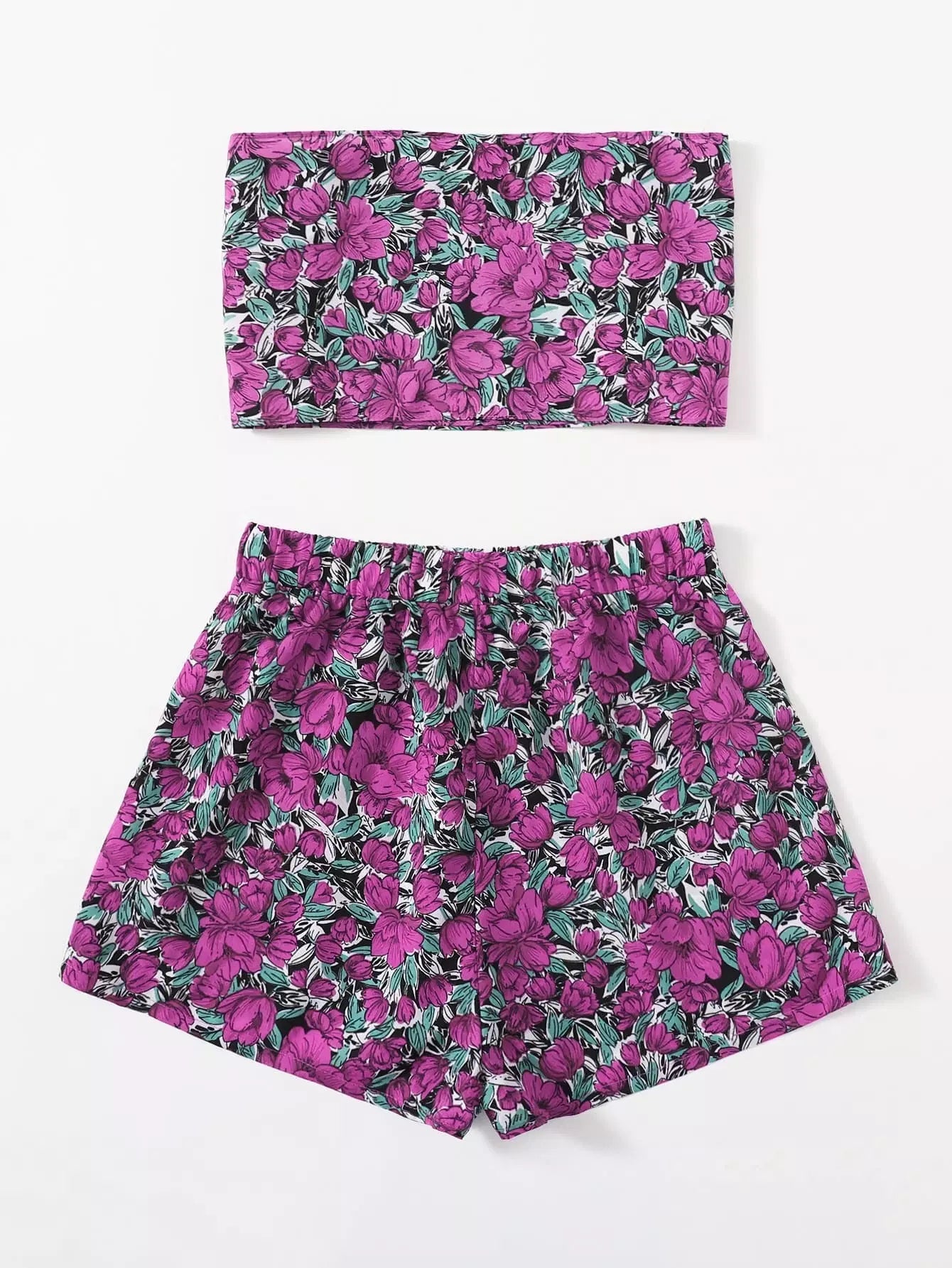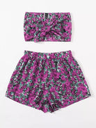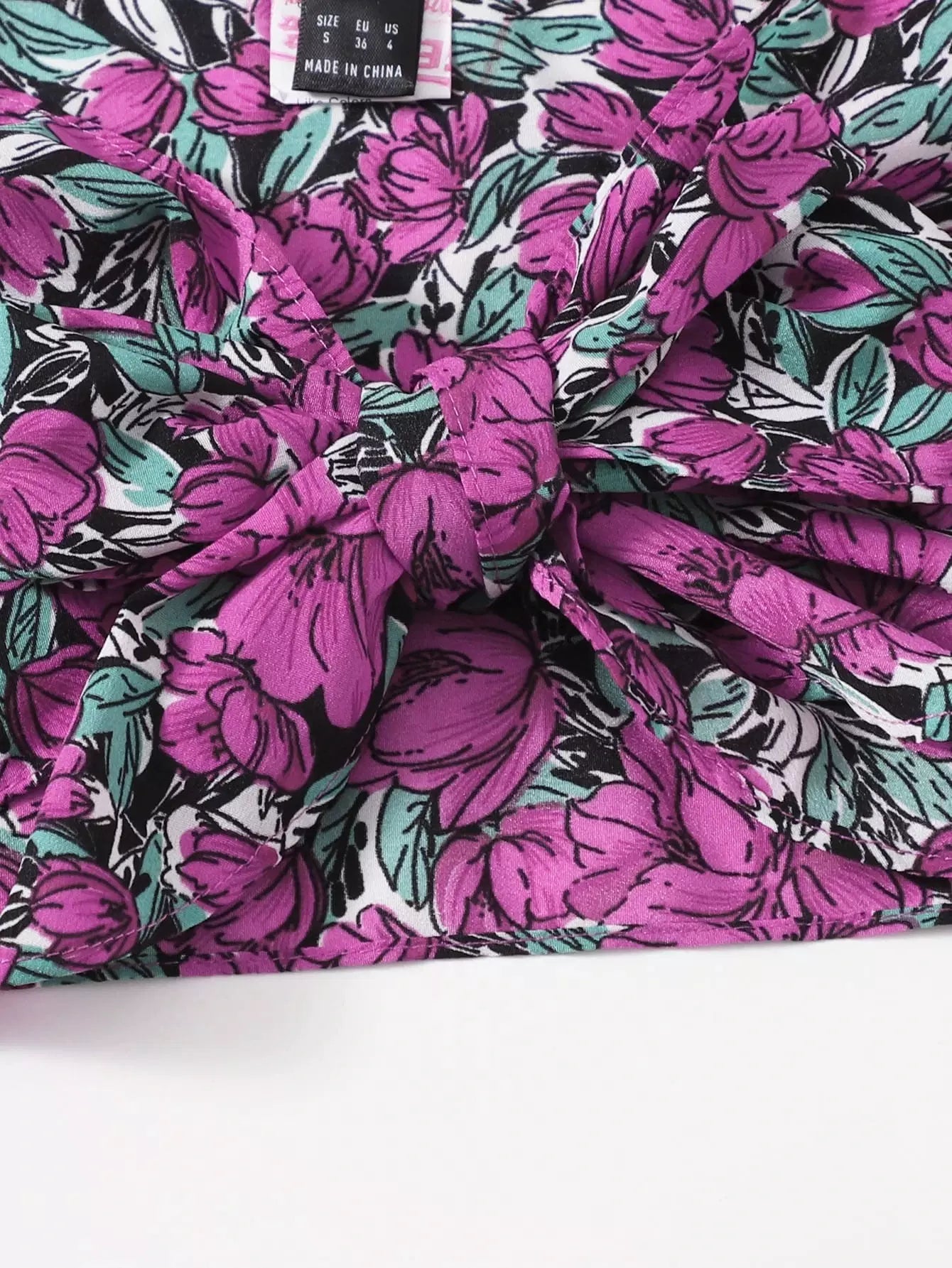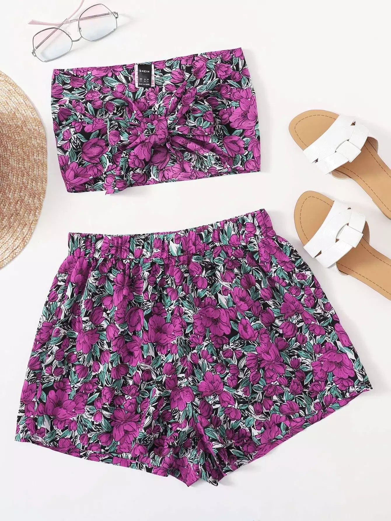 طقم بلوزة وشورت قصير بربطة عنق أمامية مزينين بالزهور