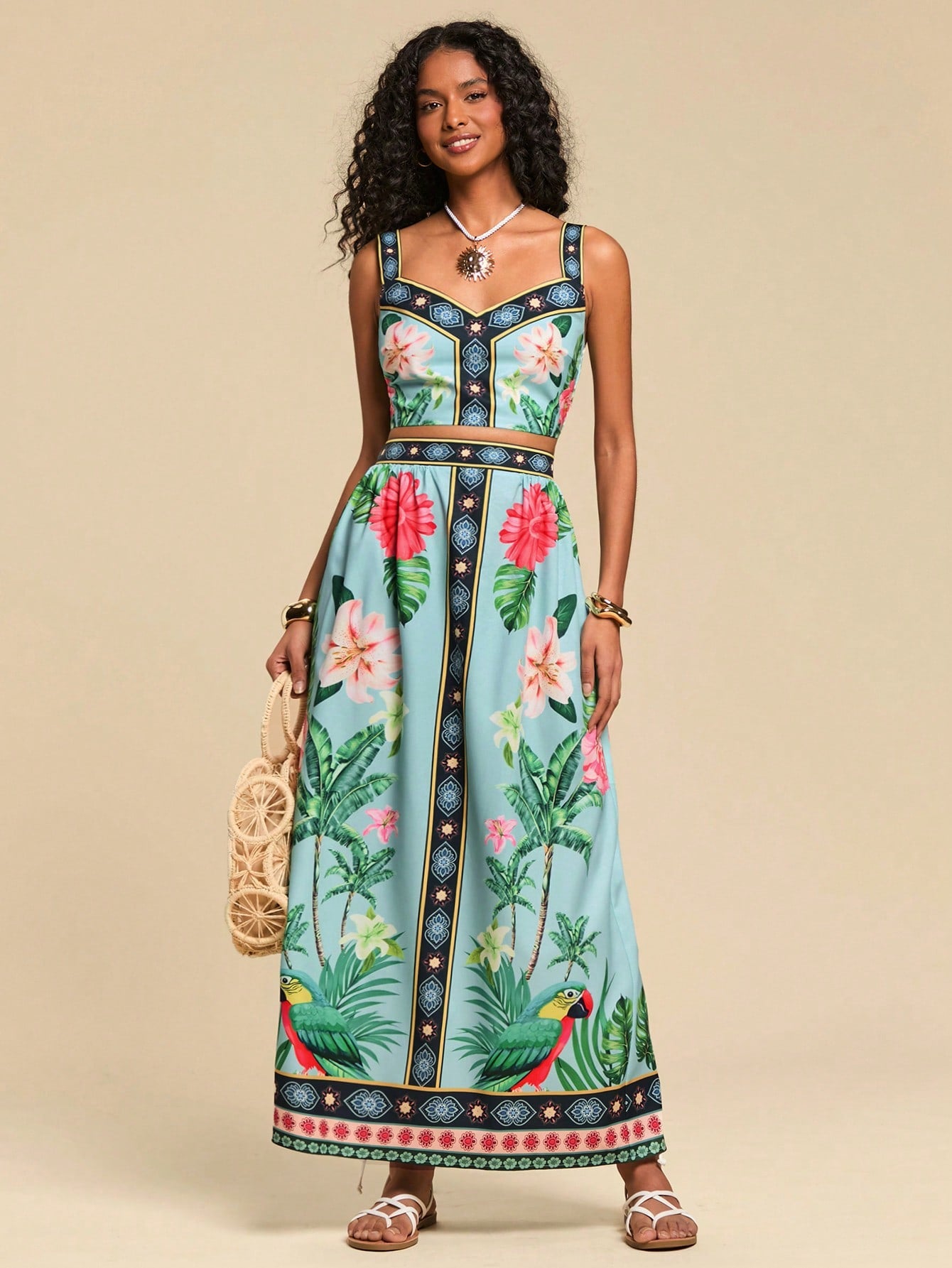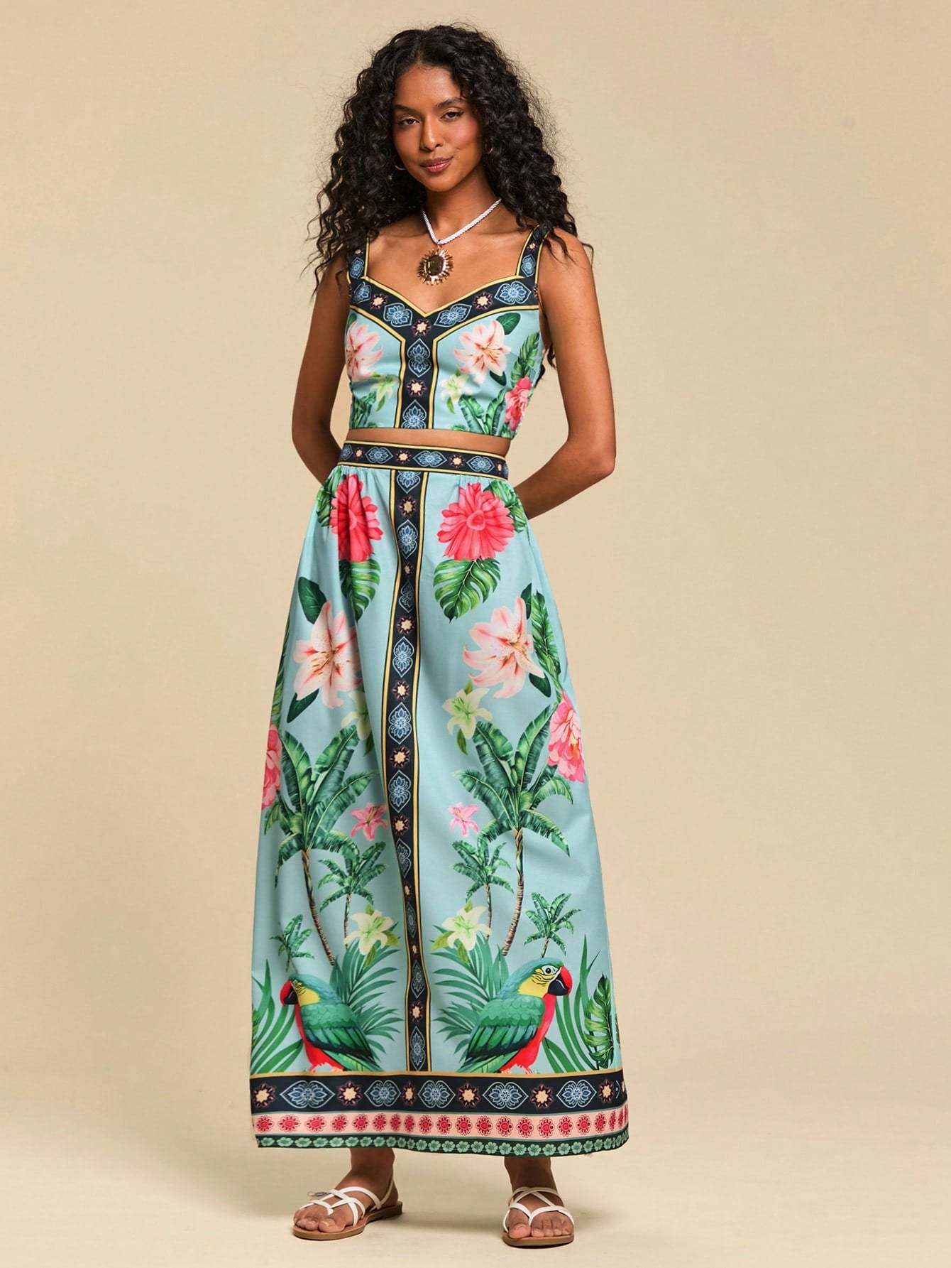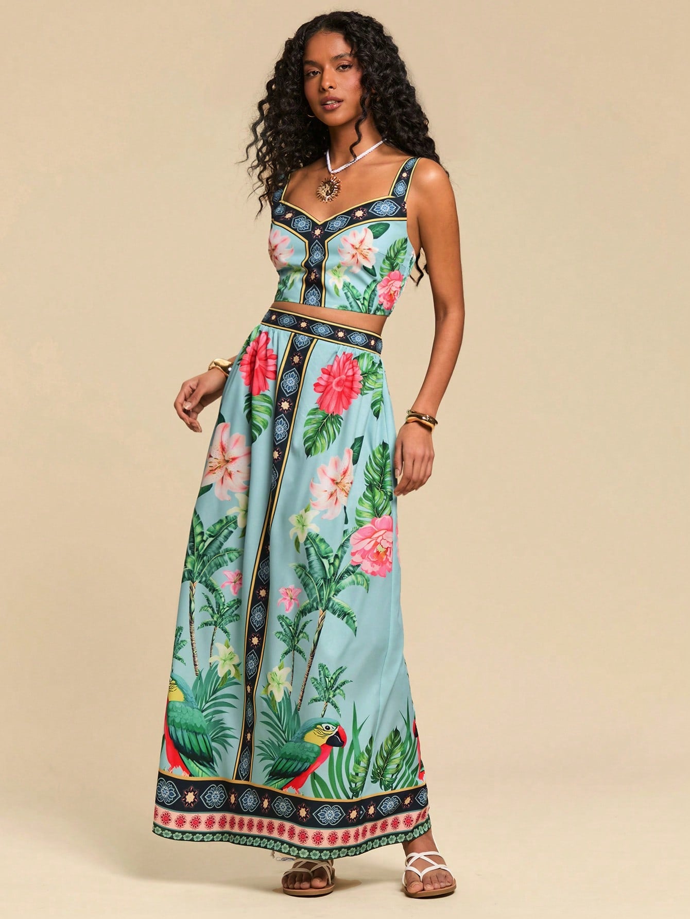 Travachic 2pcs/Set Women Woven Printed Cropped Camisole Top & High Waist Skirt,Summer Outfits For Women,Beachwear,Easter,Beach