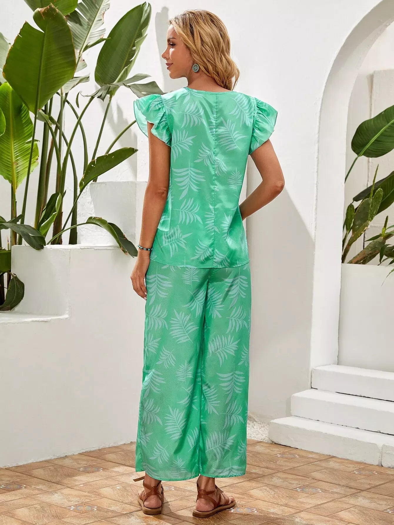 بلوزة وبنطلون بأكمام كشكش بطبعة استوائية