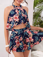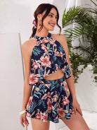 طقم بلوزة وتنورة بطبعة استوائية بطبعة استوائية بربطة عنق على الظهر