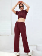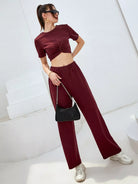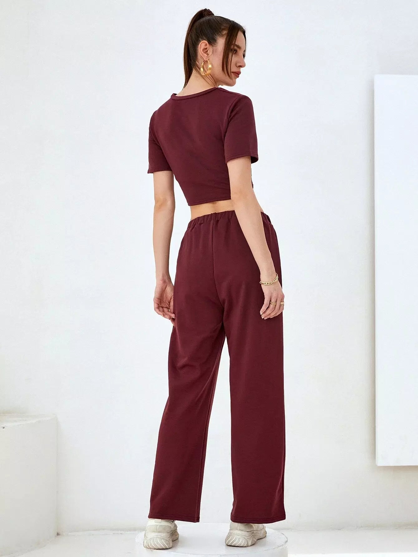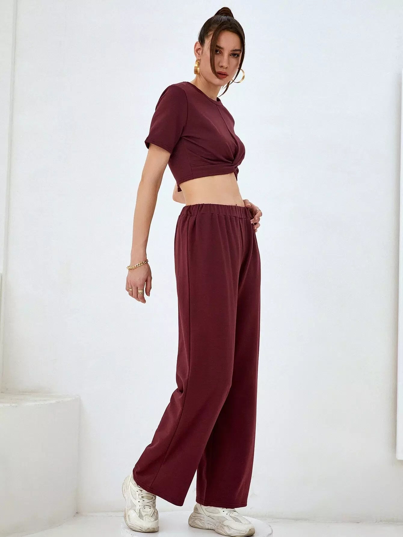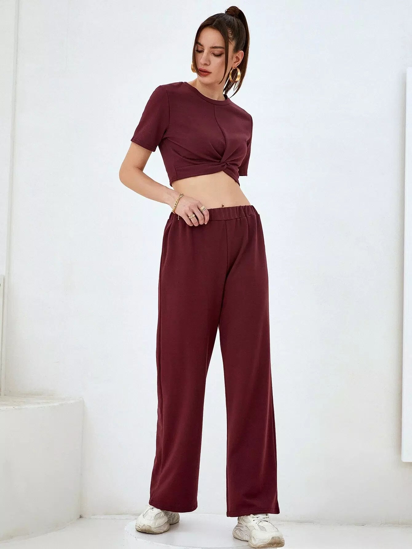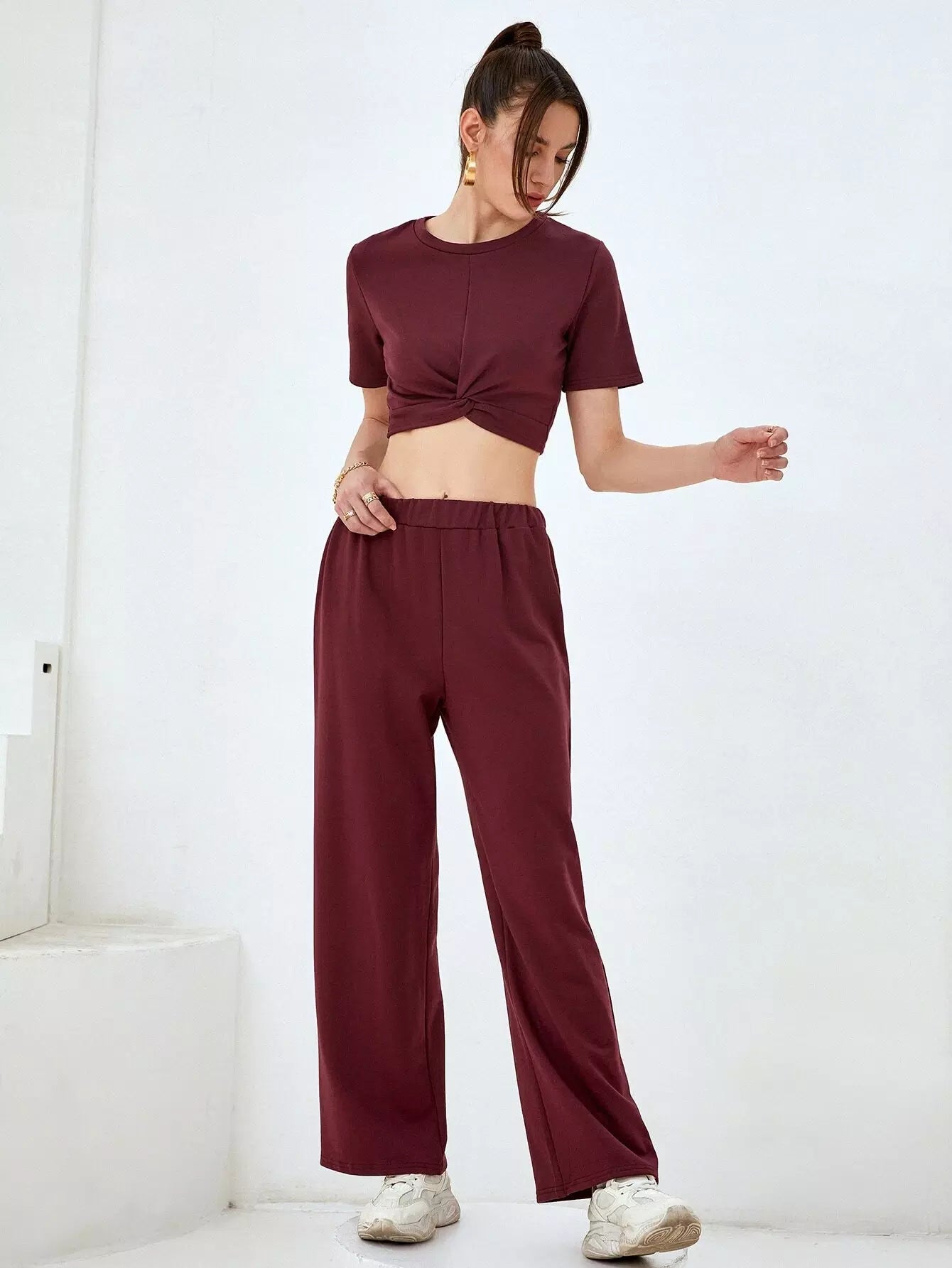 تي شيرت قصير بقصّة أمامية ملتوية مع بنطال رياضي