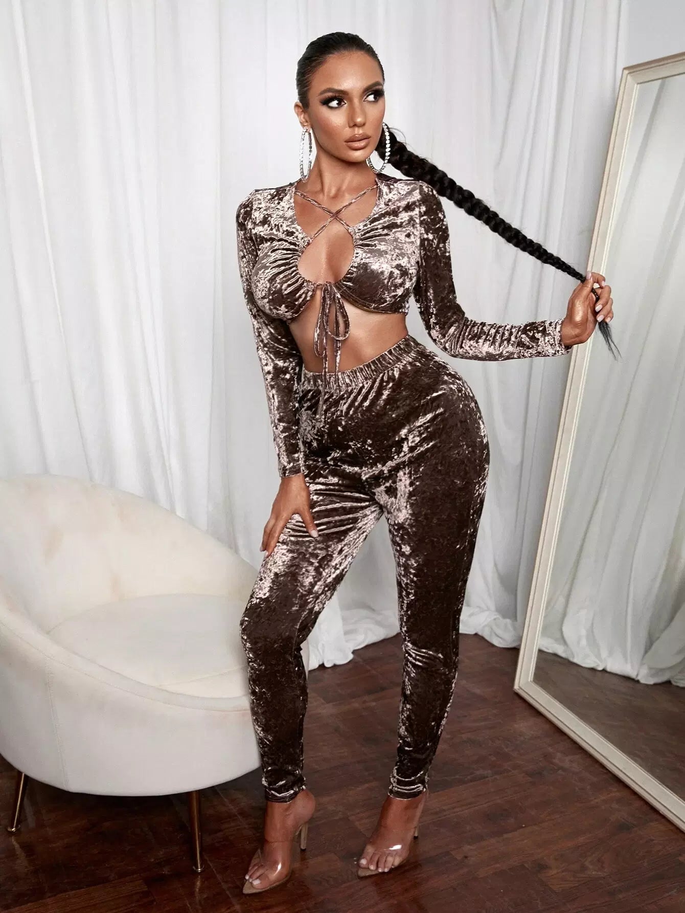 بلوزة بقصّة مخملية مقطوعة من الأمام بربطة عنق متقاطعة مع بنطال ضيق مخملي