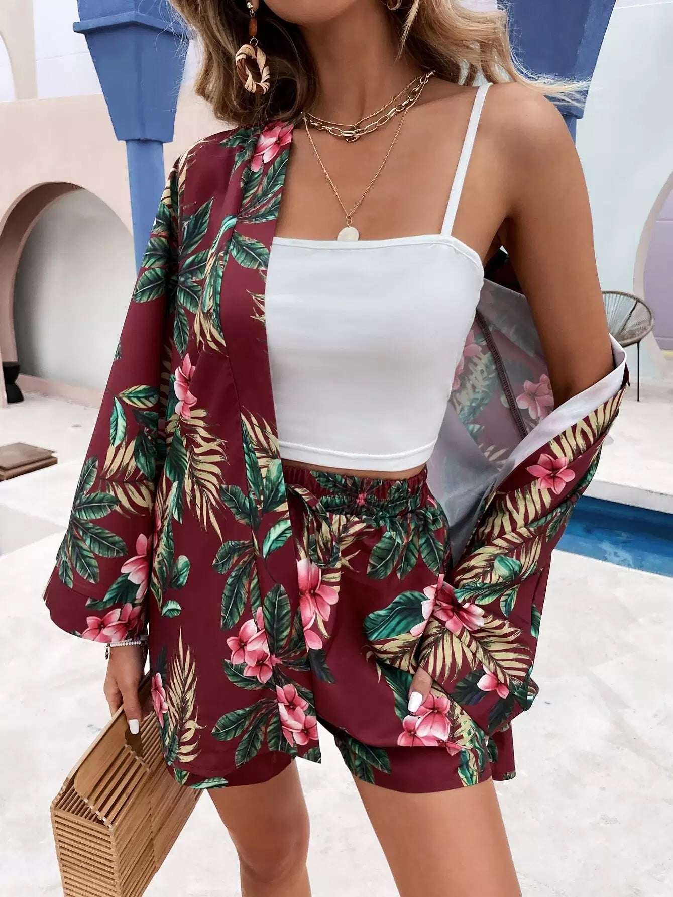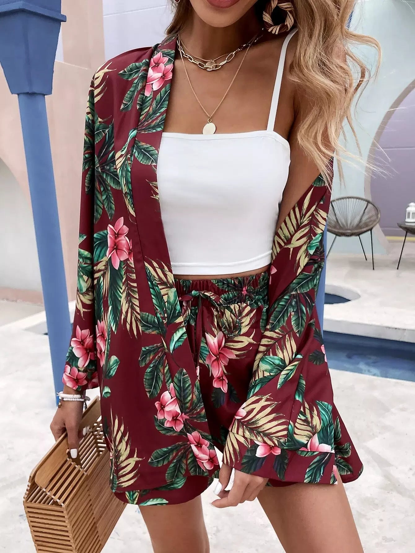 قميص قصير قصير قصير مع شورت بعقدة زهور