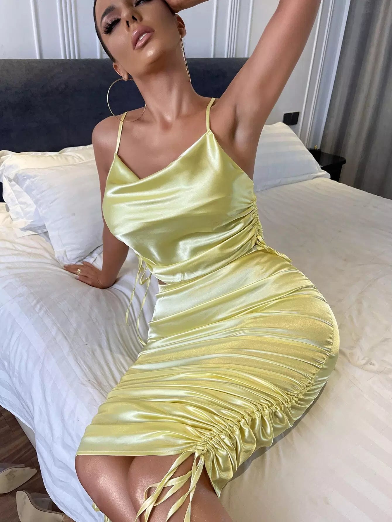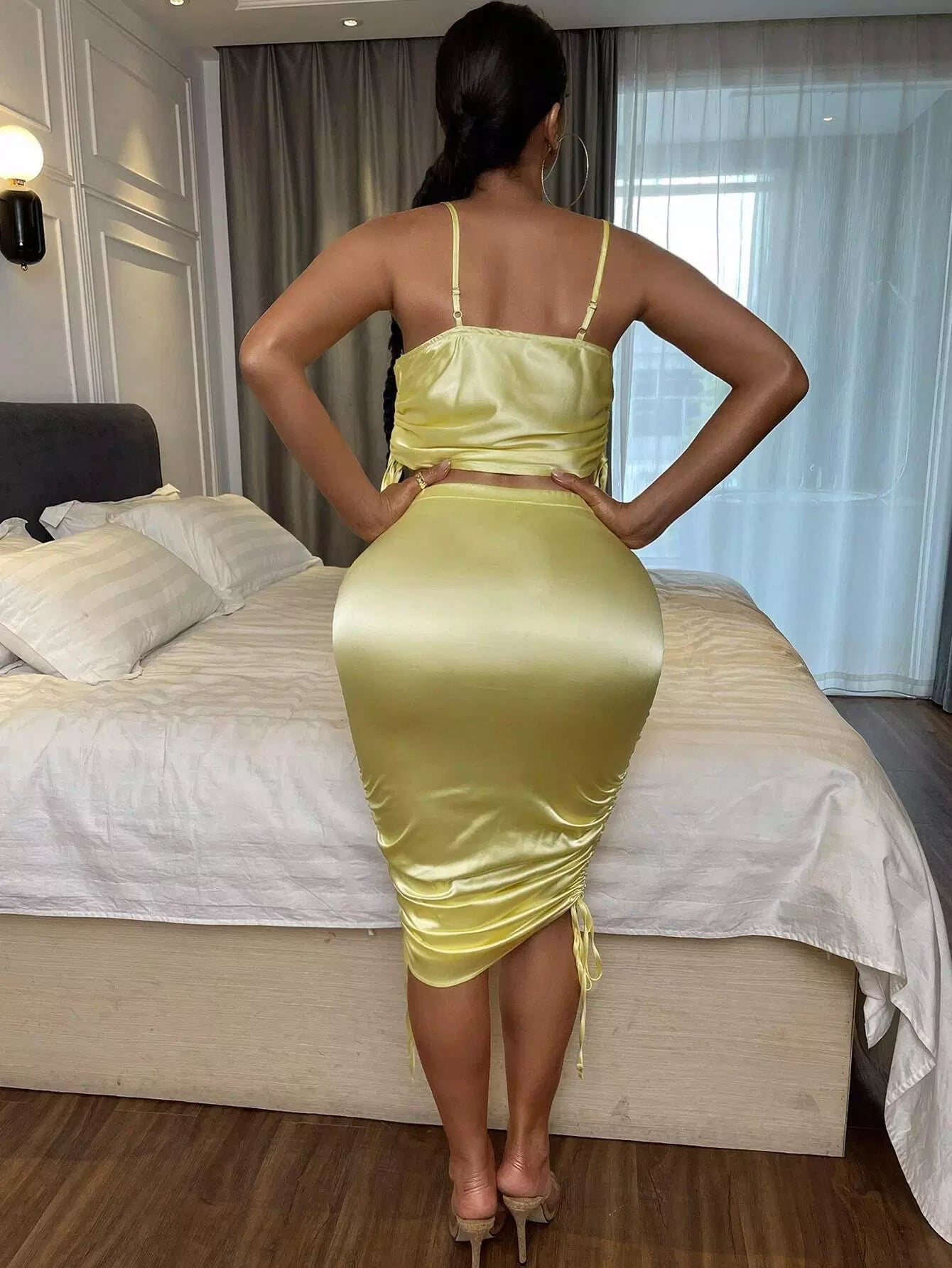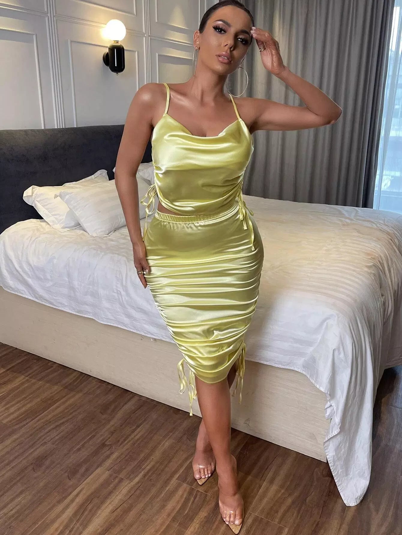 توب قصير من الساتان بياقة منسدلة على الرقبة برباط جانبي من الساتان وتنورة قصيرة