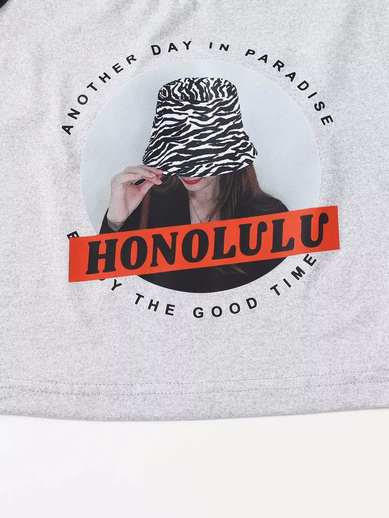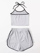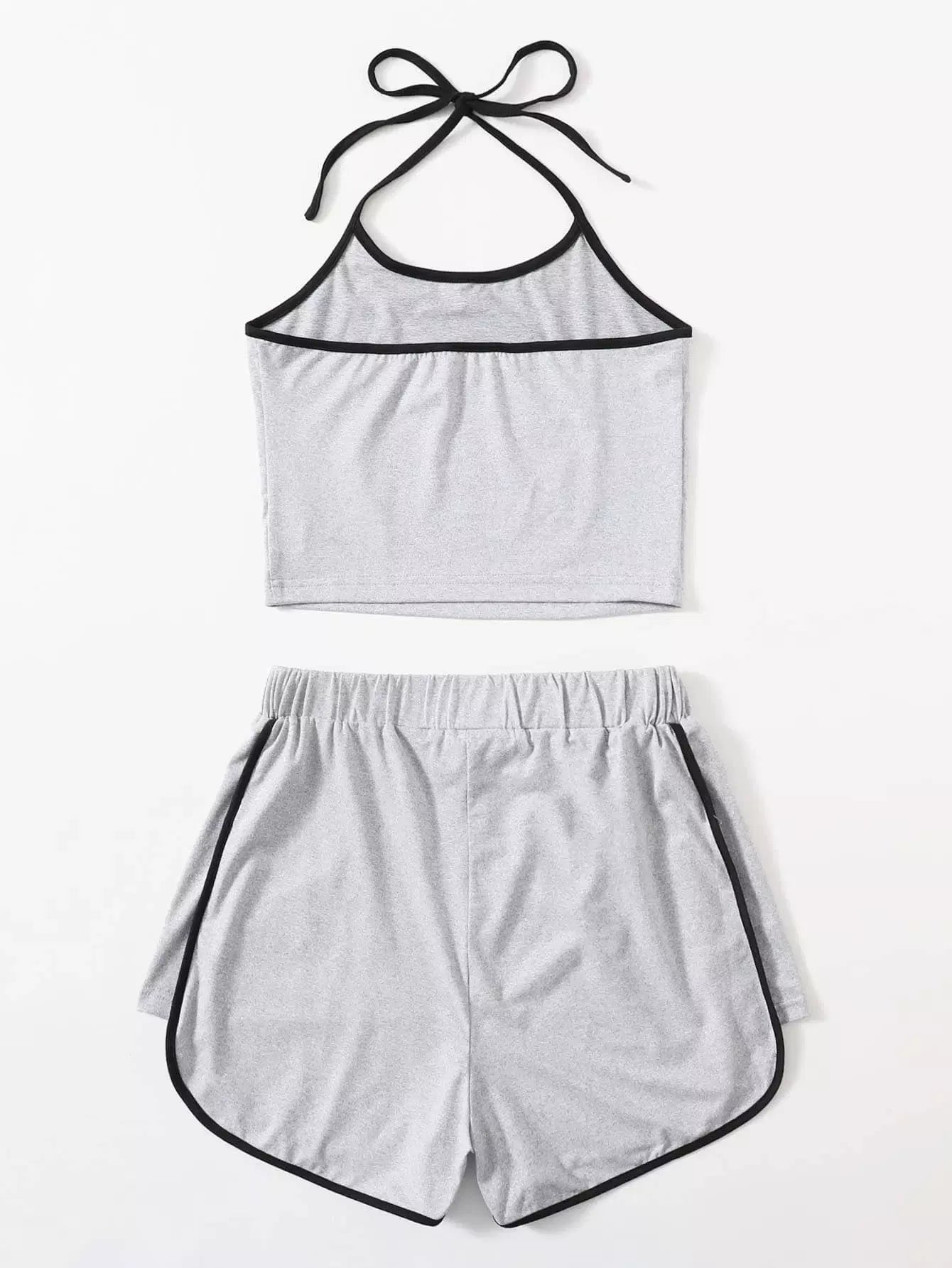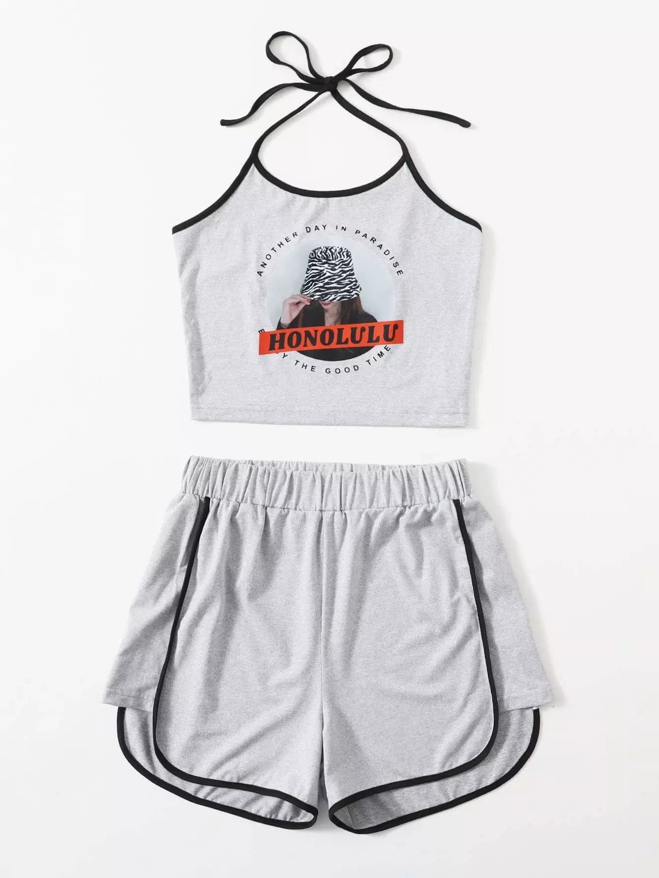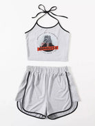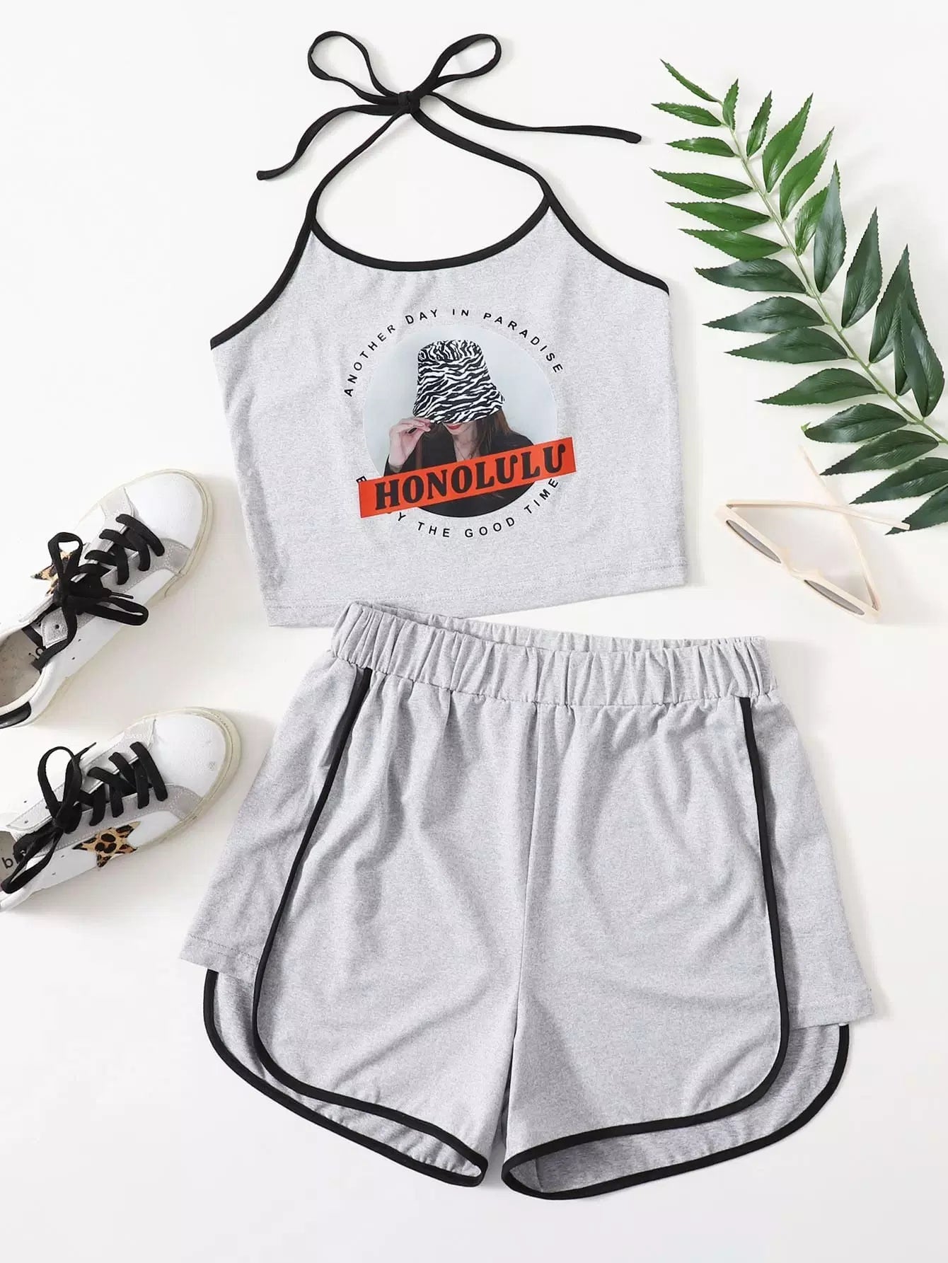 تي شيرت بحمالات رباط على شكل وحروف متباينة وشورت رياضي
