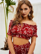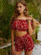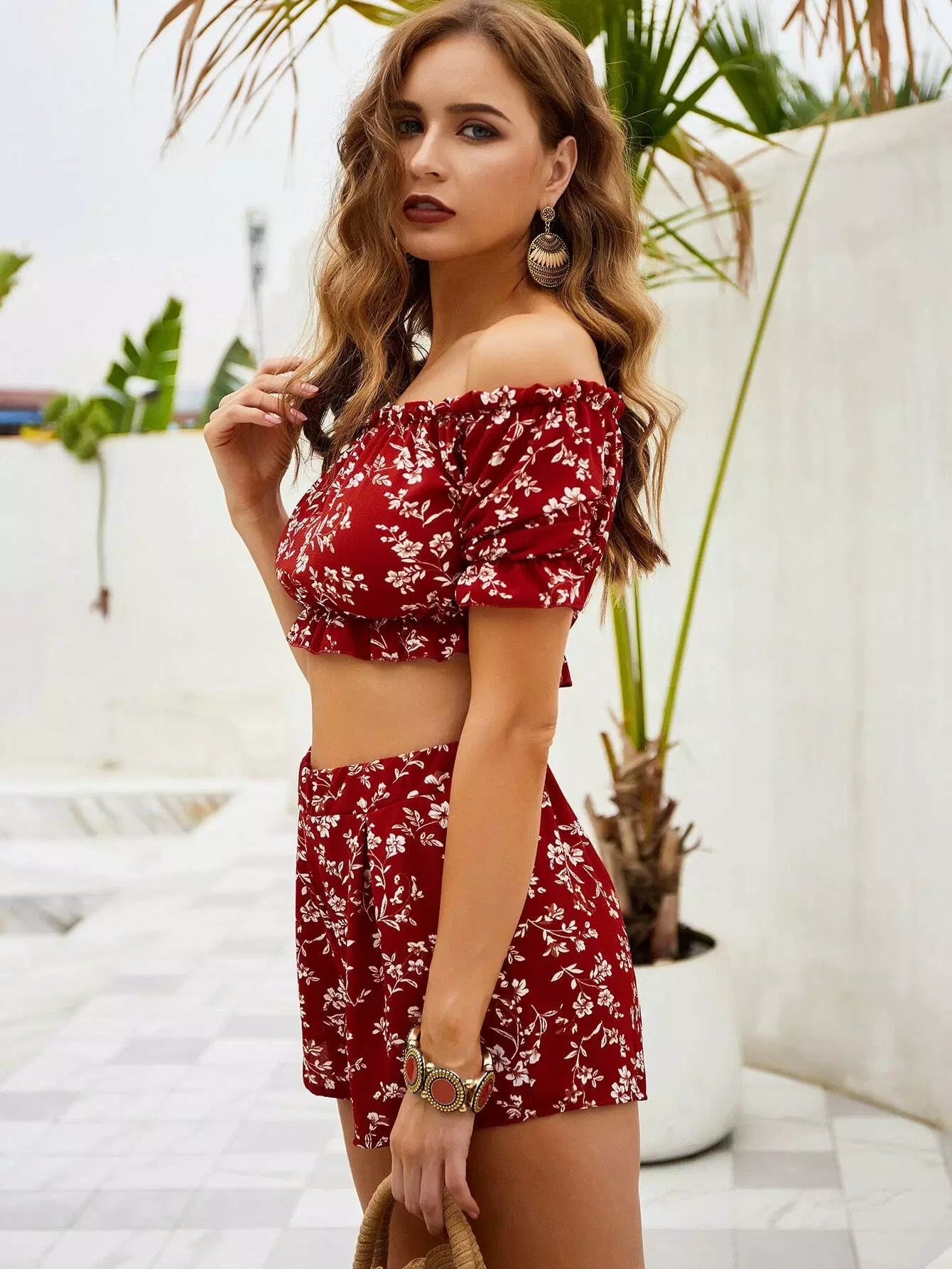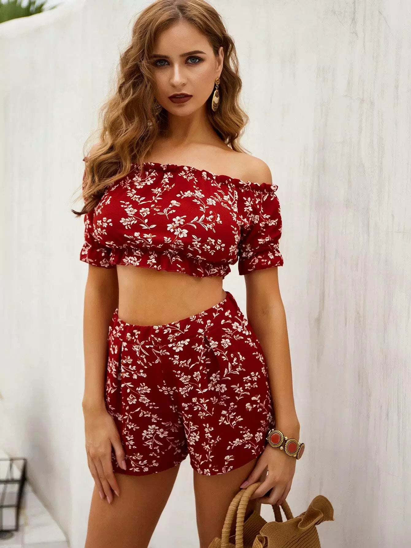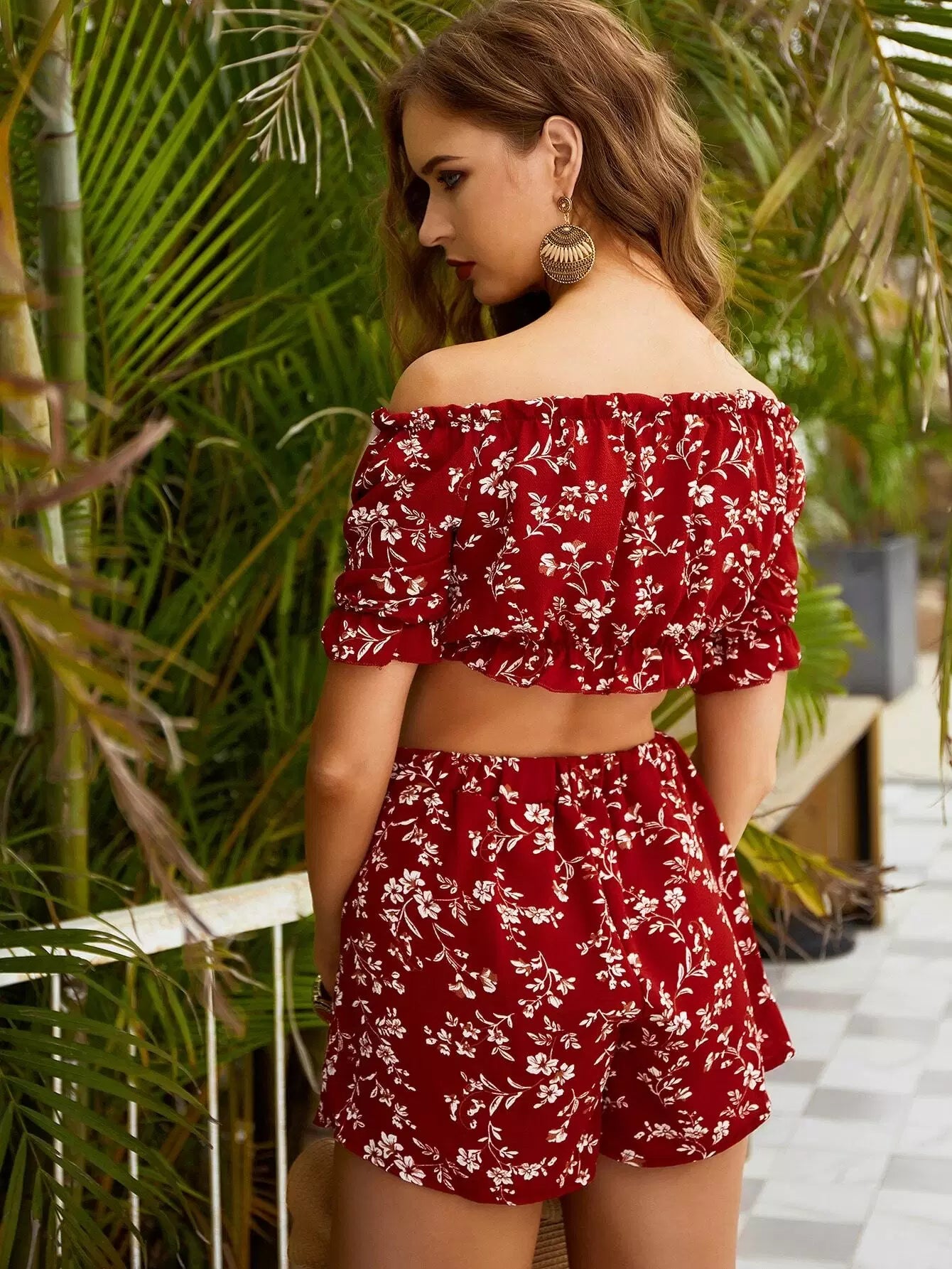 بلوزة قصيرة مكشوفة الكتفين بطبعة زهور وحواف مكشكشة وشورت