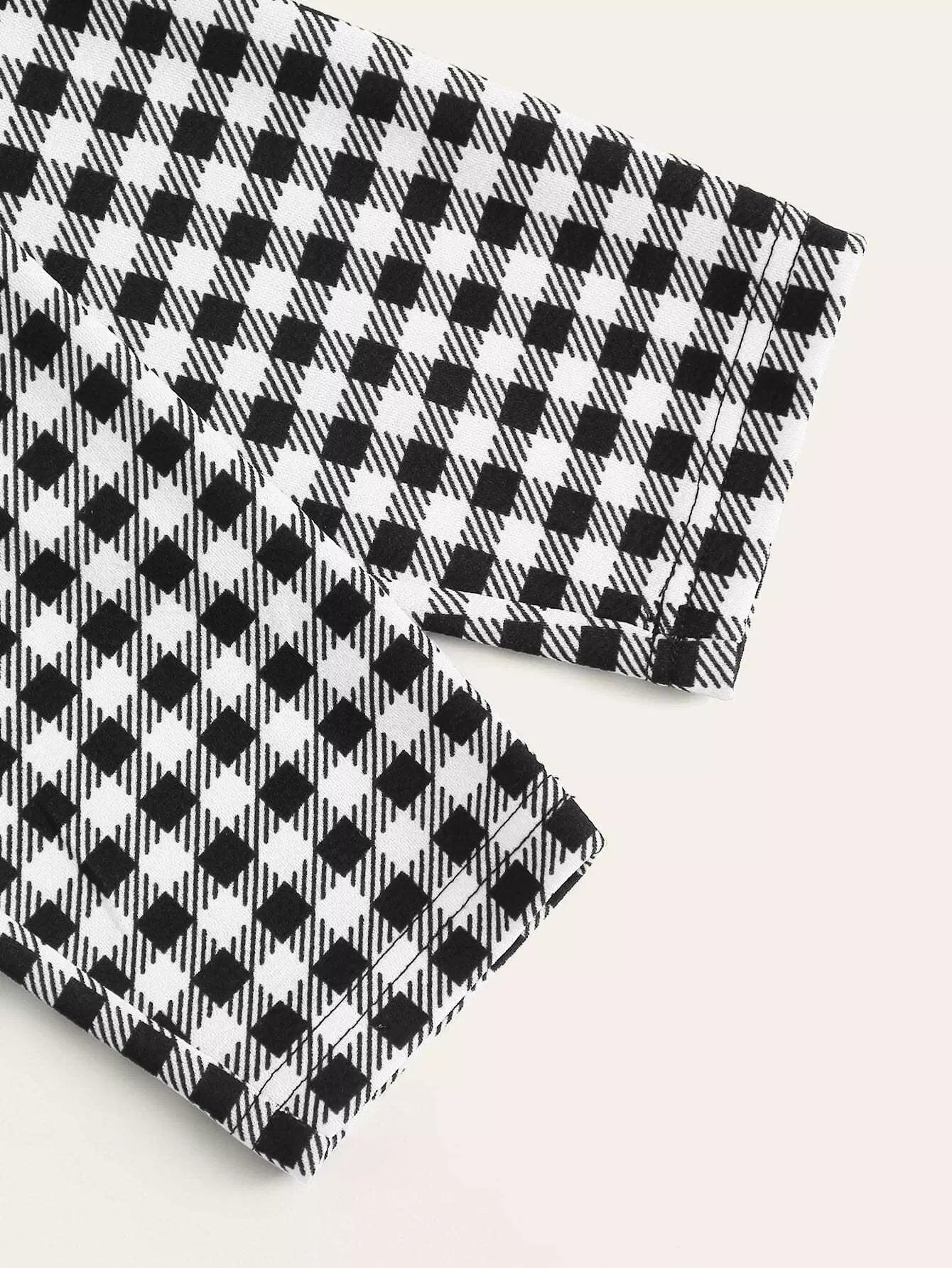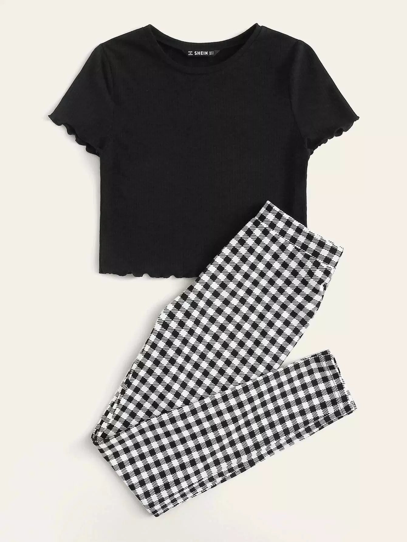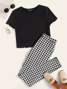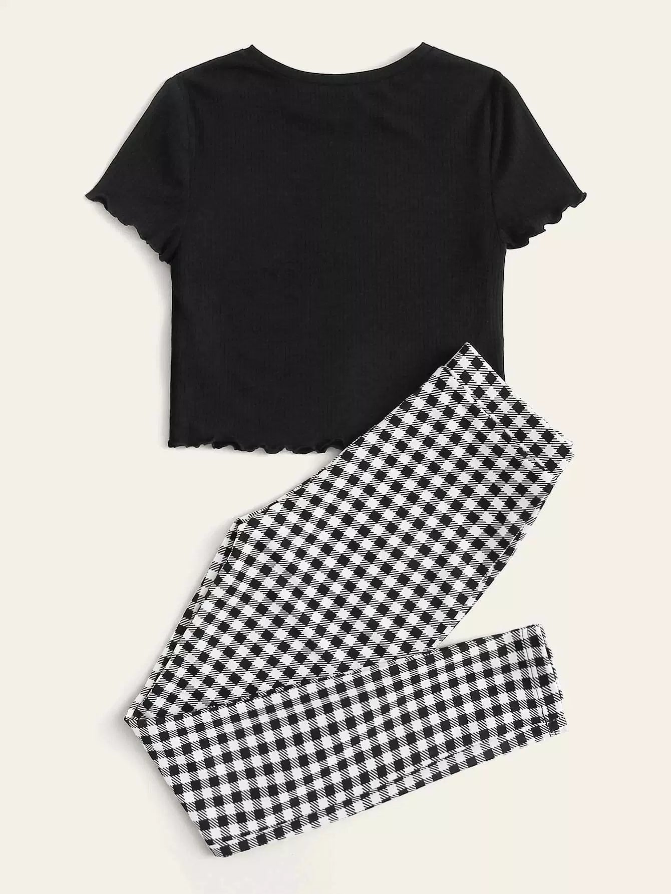 طقم بلوزة سادة بحواف خس وبنطلون بطبعة قماش قطني