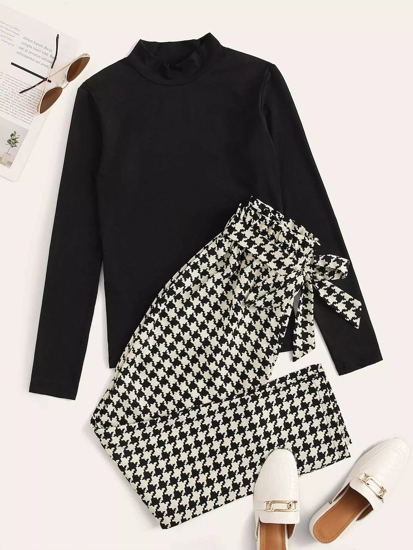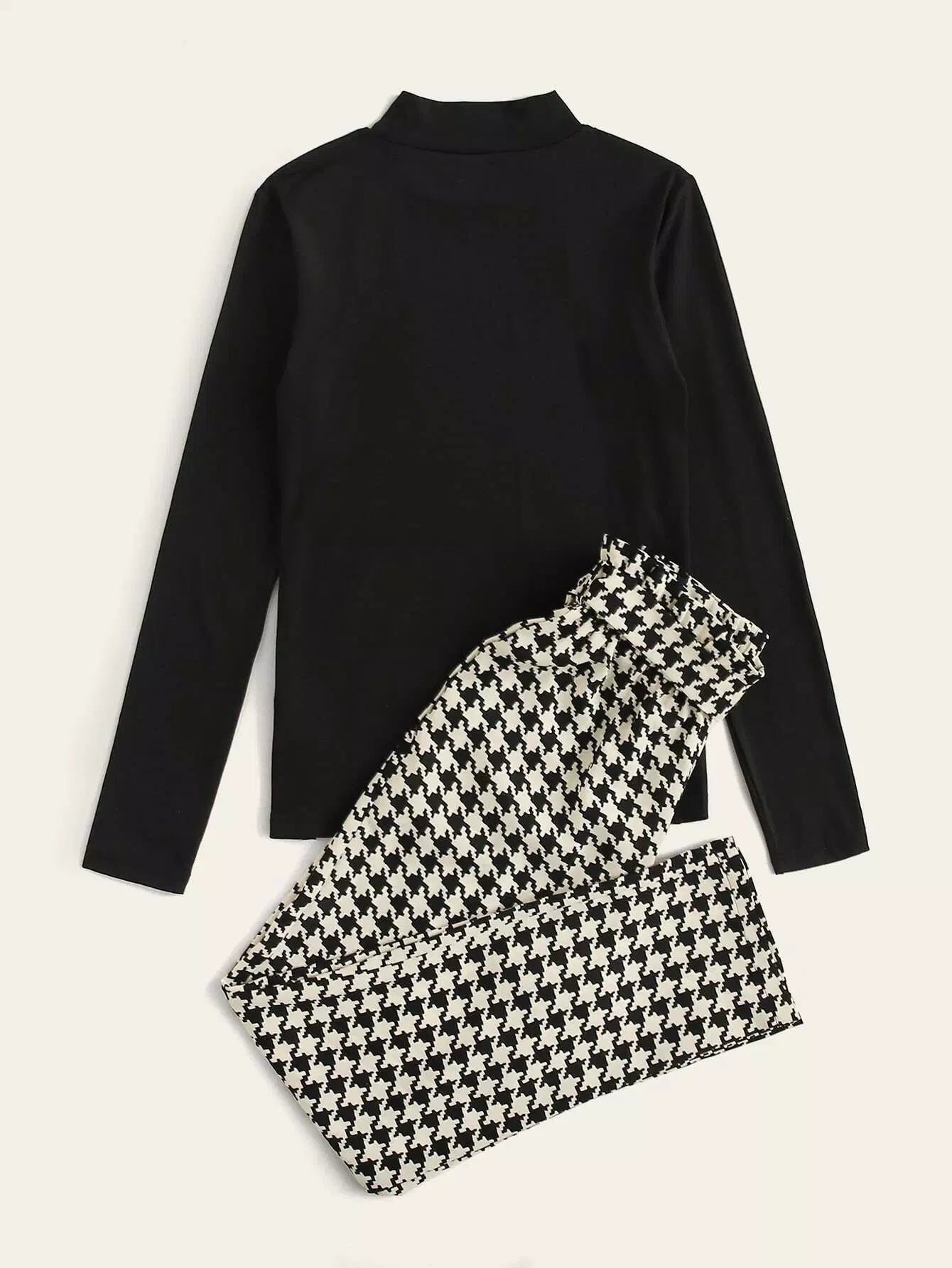 تيشيرت سادة بياقة وهمية وسروال بنقش مربعات بدون حزام