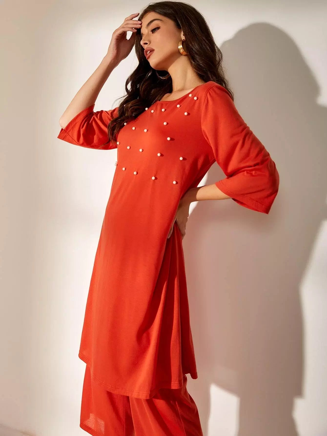 تي شيرت طويل من اللؤلؤ وبنطلون واسع الساقين