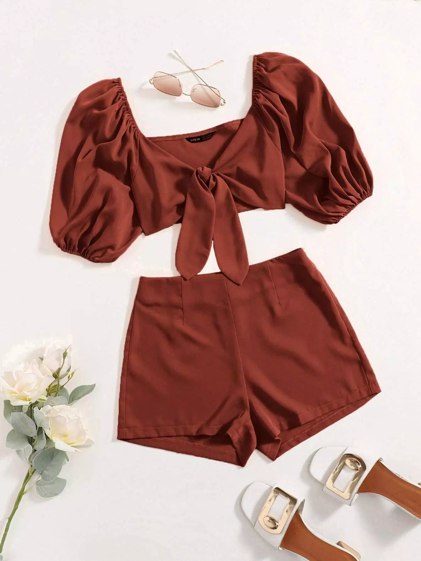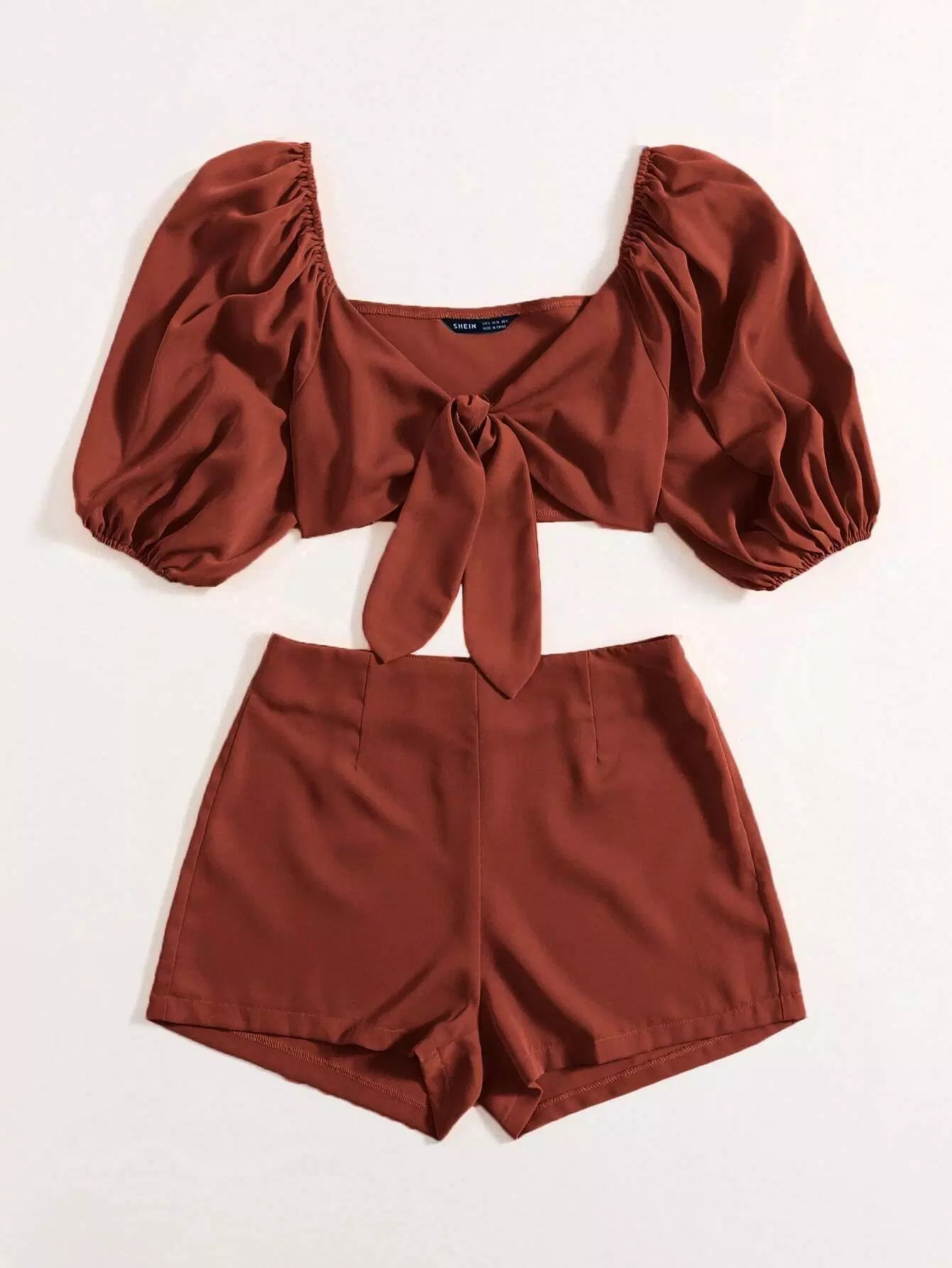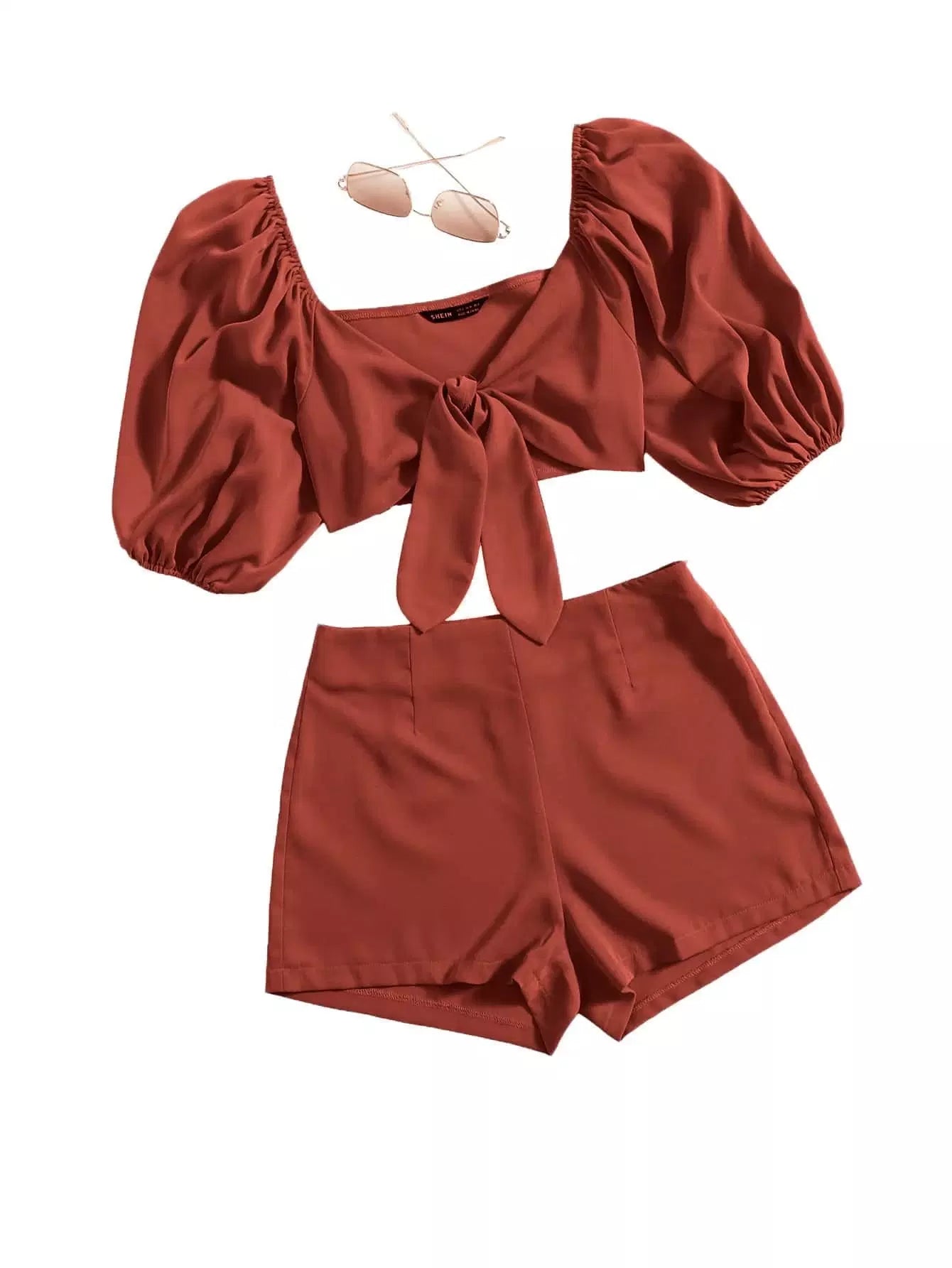 طقم بلوزة قصيرة بأكمام منفوخة وربطة عنق أمامية وسروال قصير