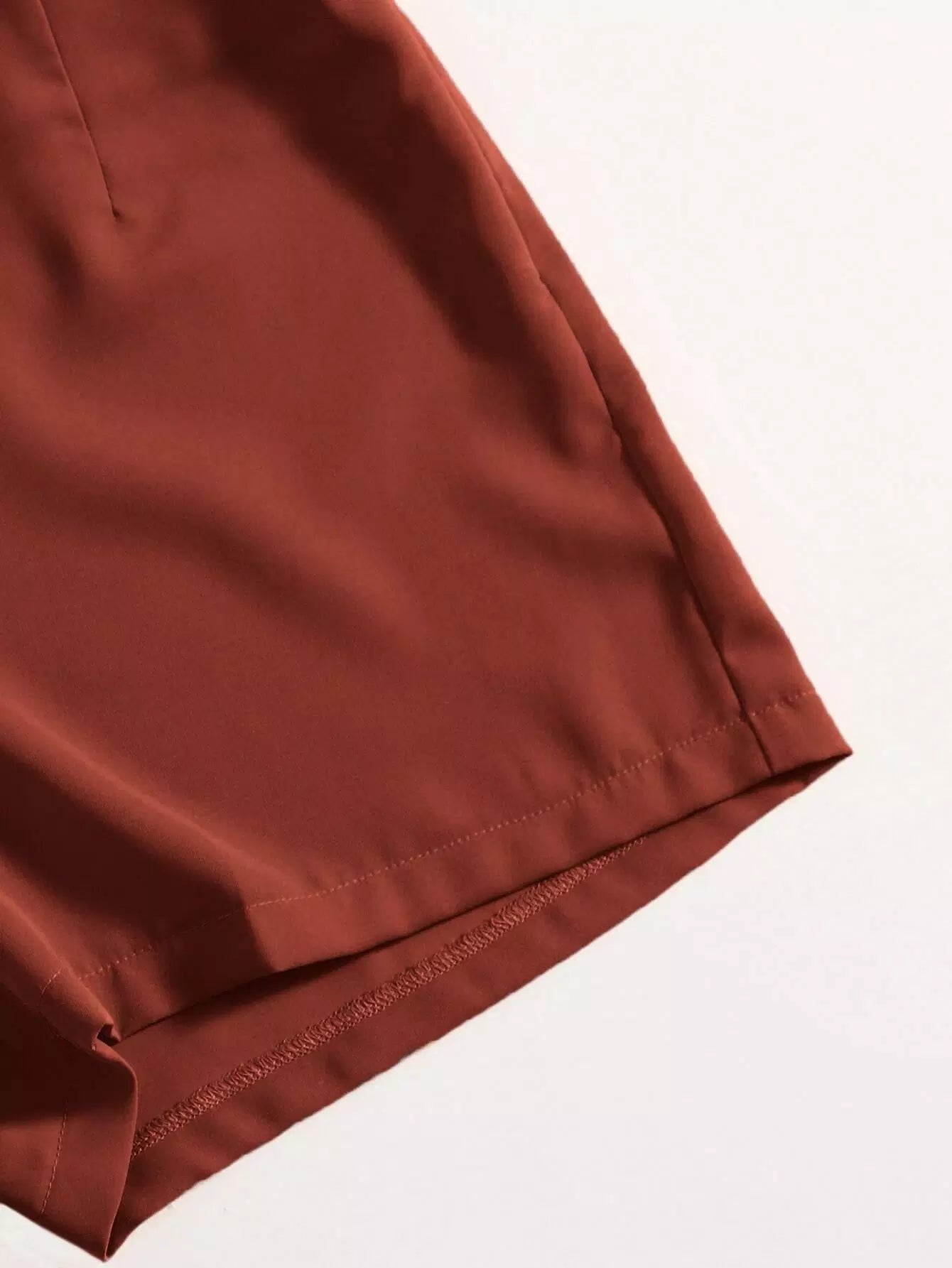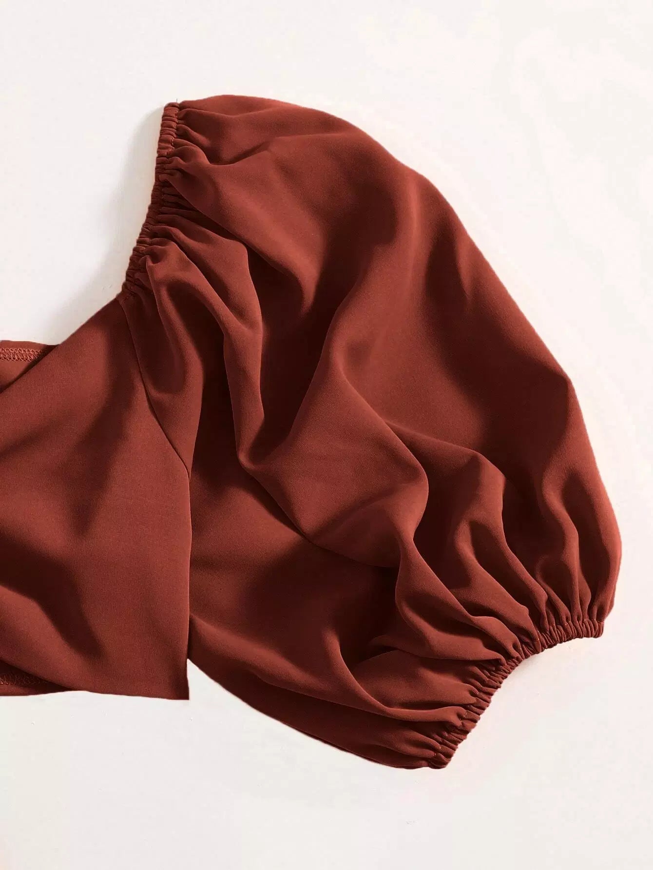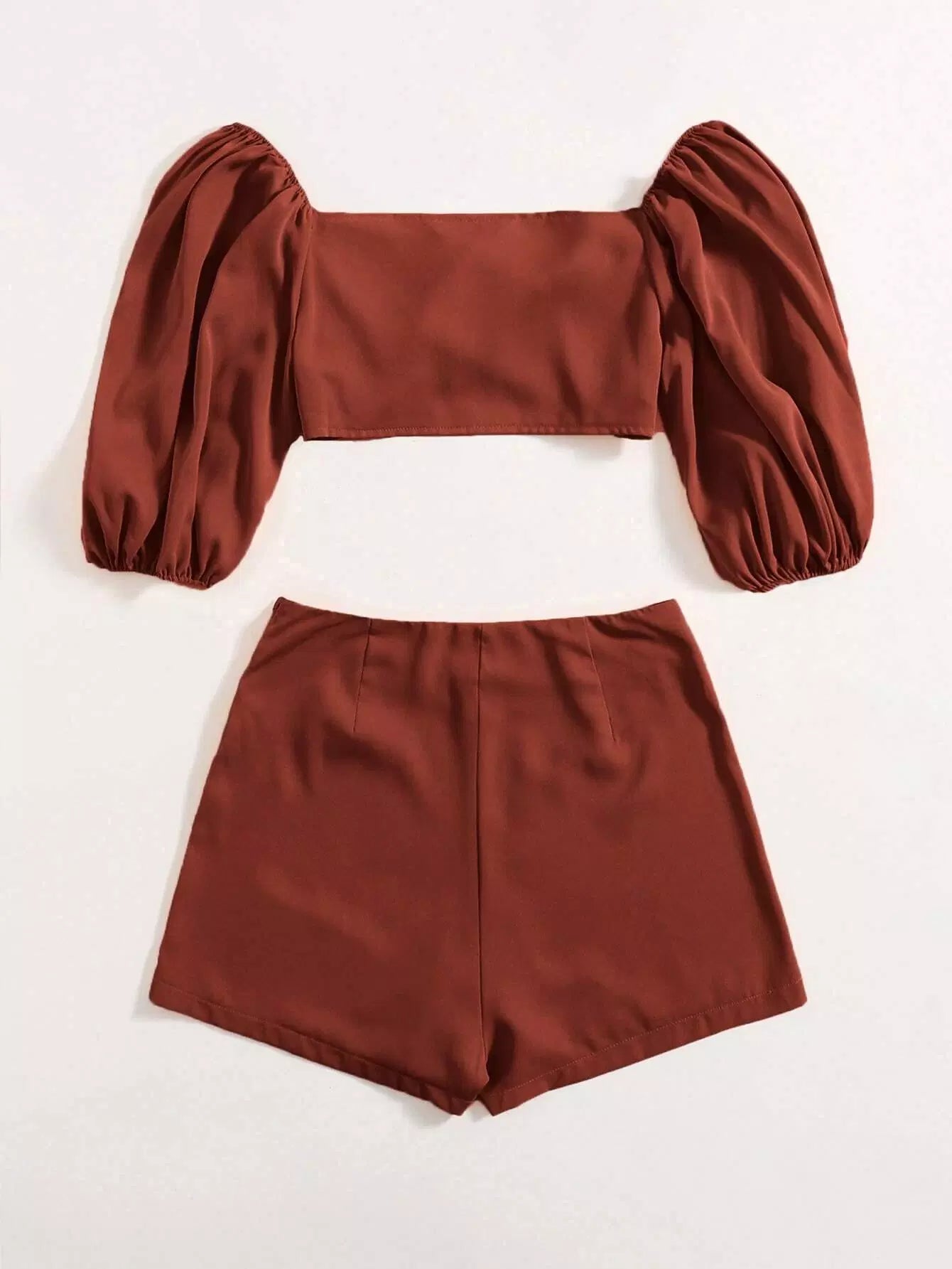 طقم بلوزة قصيرة بأكمام منفوخة وربطة عنق أمامية وسروال قصير