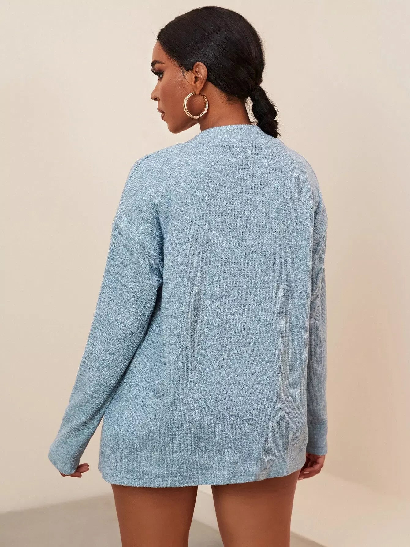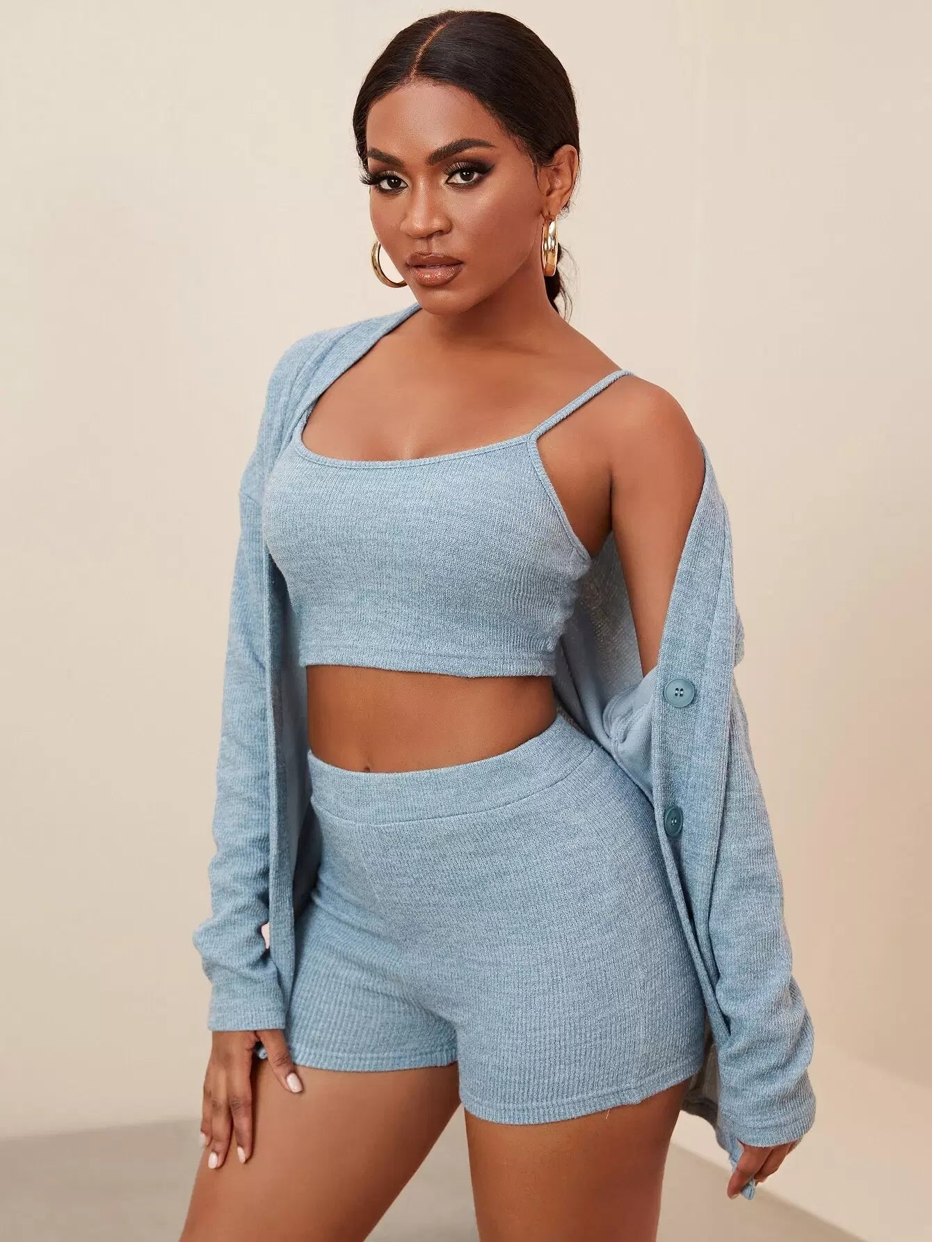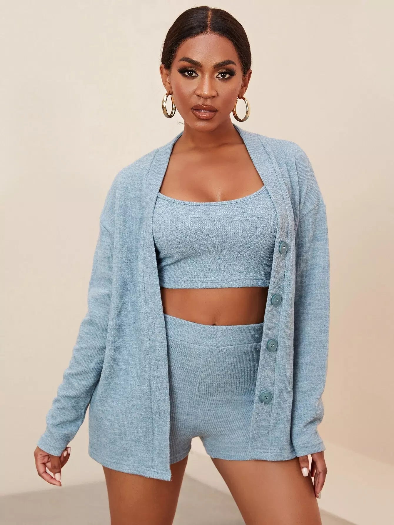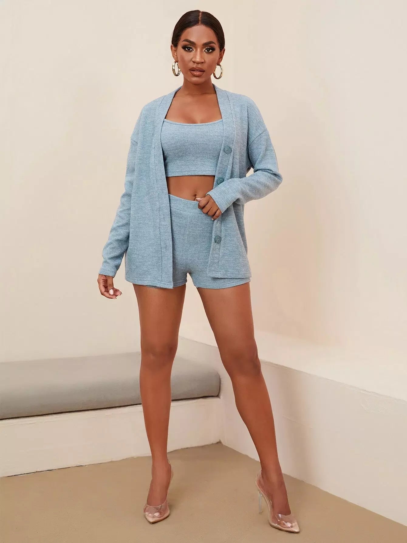 طقم قميص قصير محبوك على شكل ضلع مع معطف وشورت