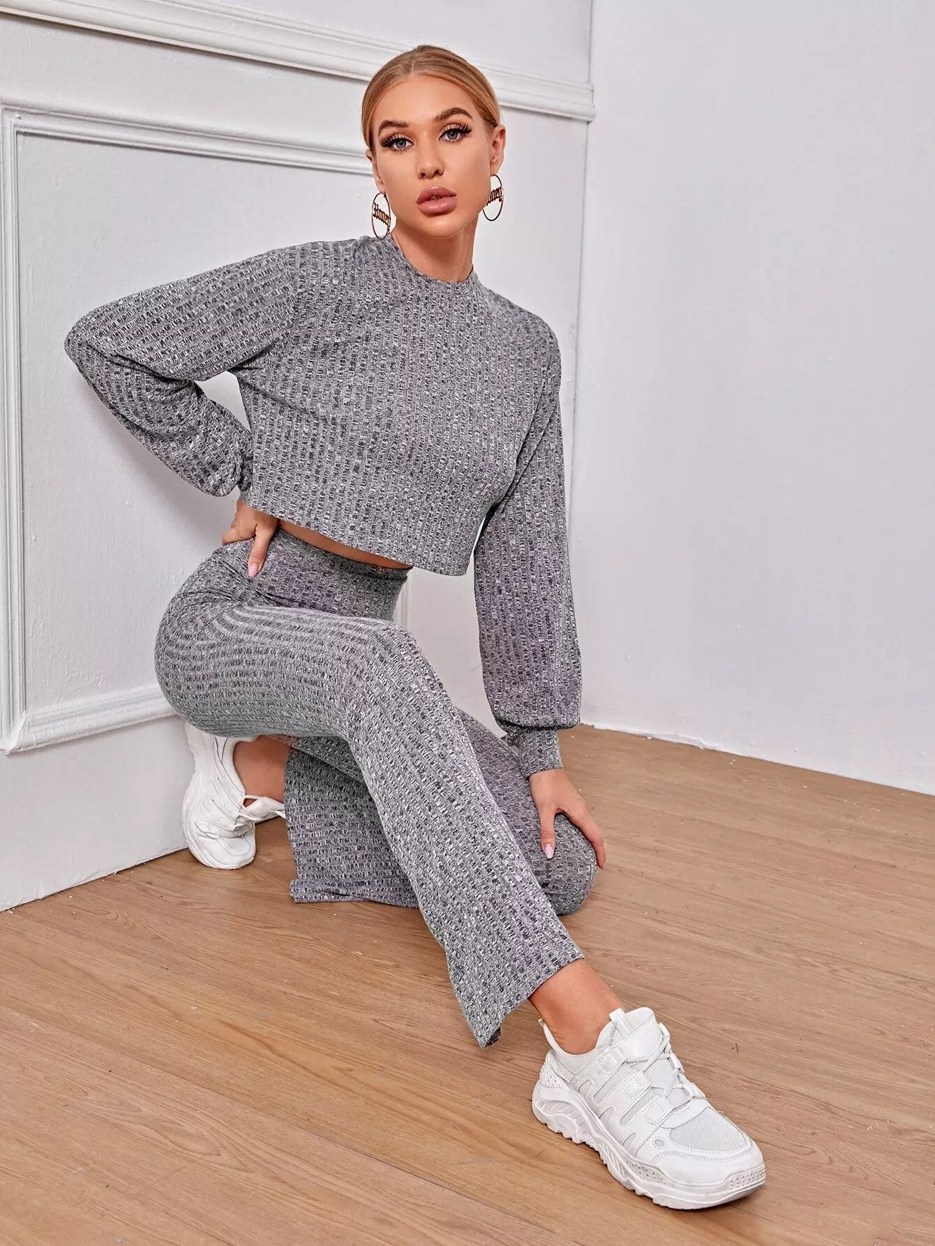 طقم من بلوزة مضلعة وبنطلون واسع الساق