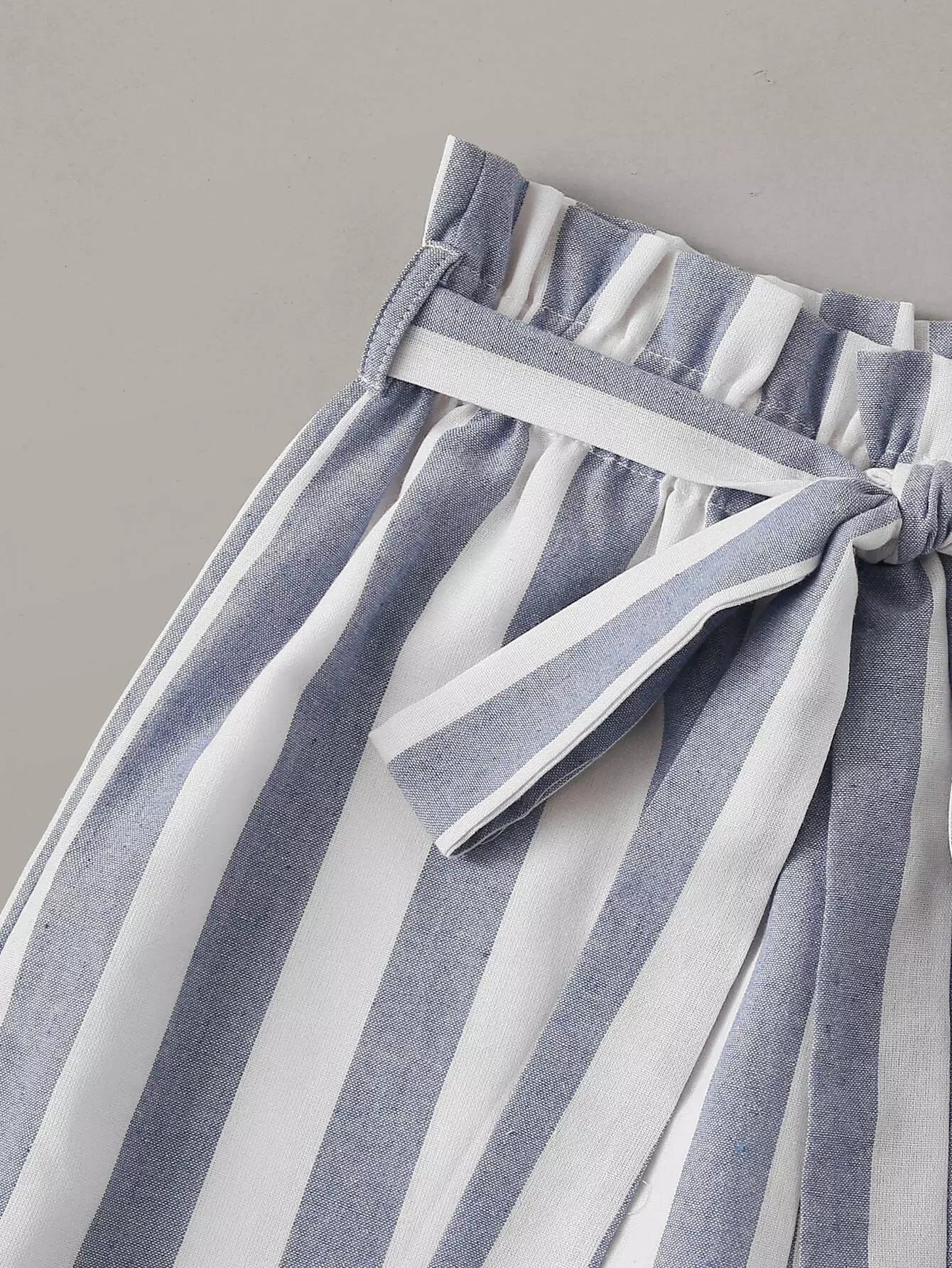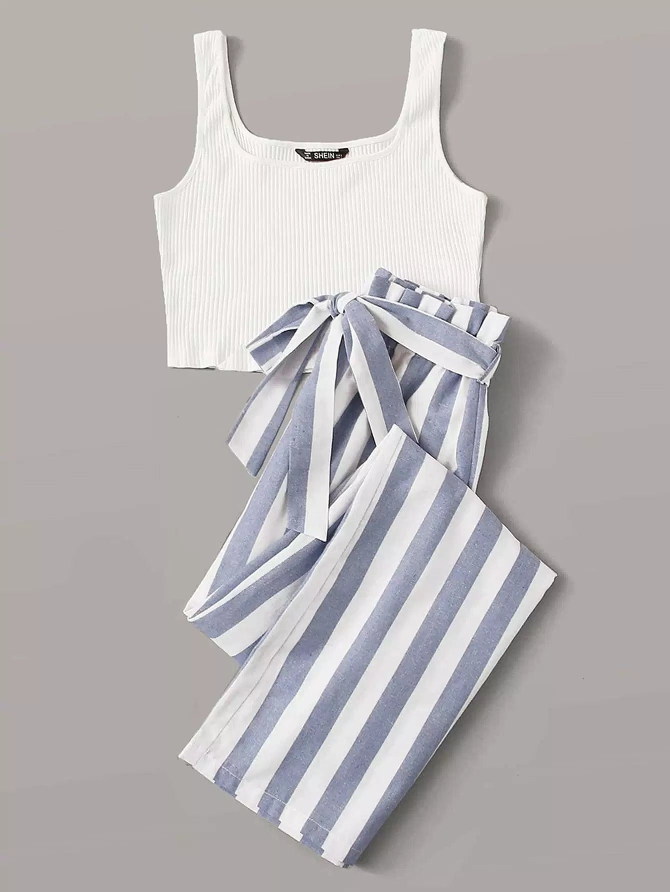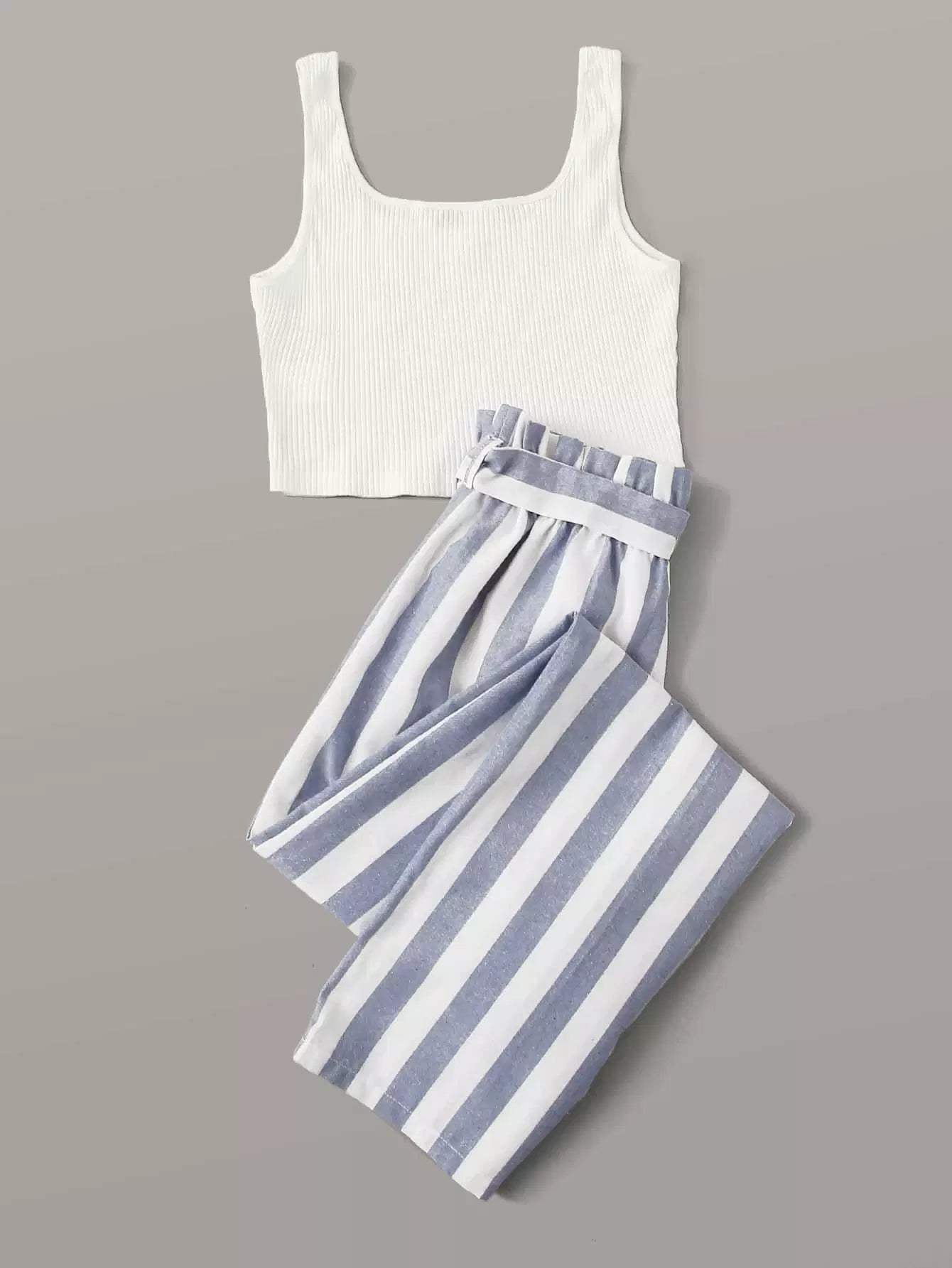 طقم قميص بدون أكمام مضلع وسروال مخطط بدون حزام