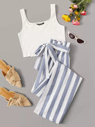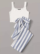 للنساء - طقم قميص بدون أكمام مضلع وسروال مخطط بحزام